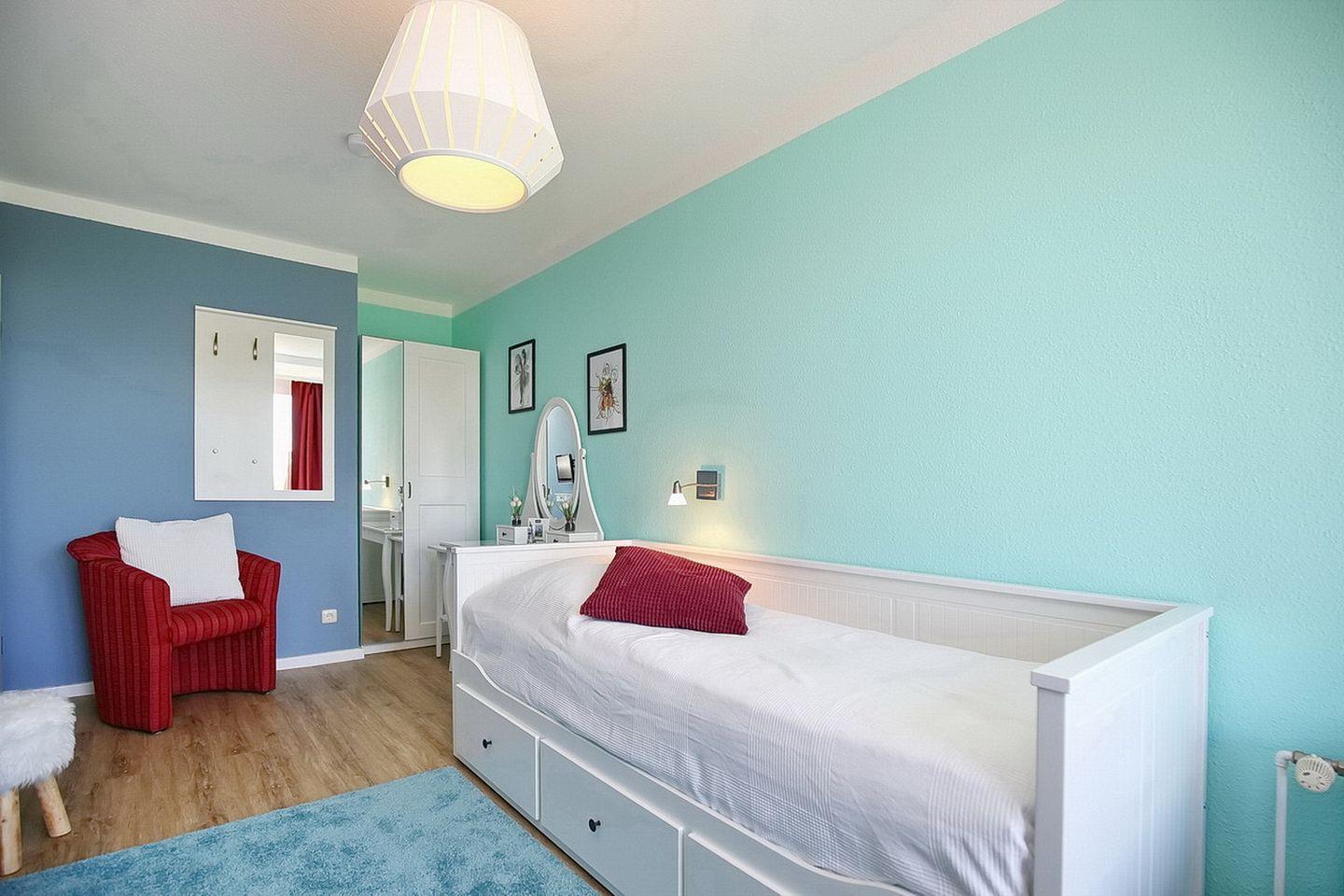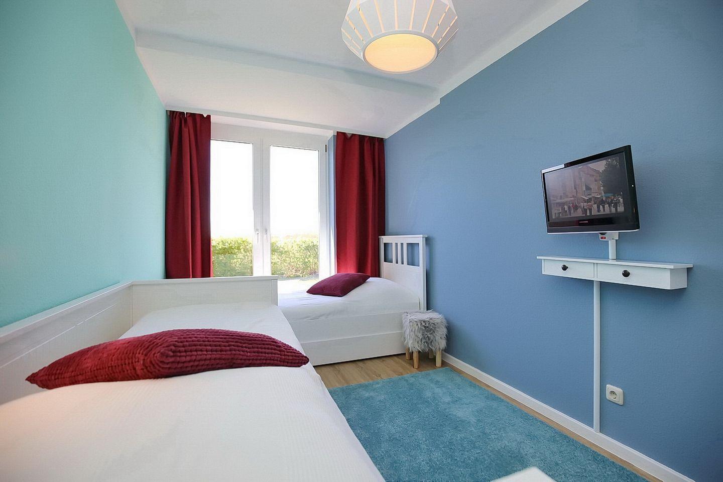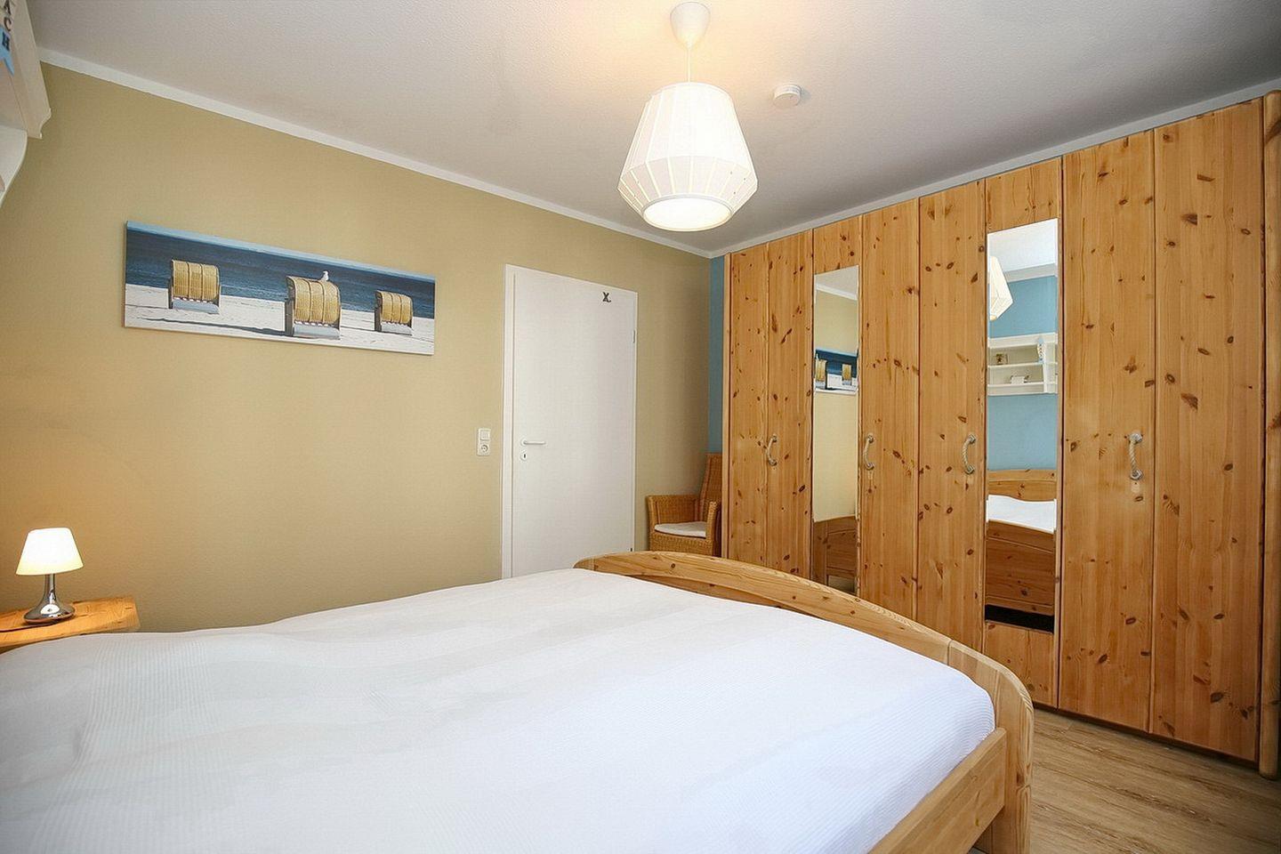Für einen erholsamen Schlaf sorgen im ersten Schlafzimmer ein Doppelbett (2 x 90 x 200 cm) und im zweiten Schlafraum zwei Einzelbetten (90 x 200 cm). Dein Urlaubsgepäck kannst du in den jeweiligen Bereichen in einem Kleiderschrank verstauen. Zur Abdunkelung sind an den Fenstern Vorhänge angebracht. Als Bodenbelag wurde in beiden Räumen Auslegware gewählt.