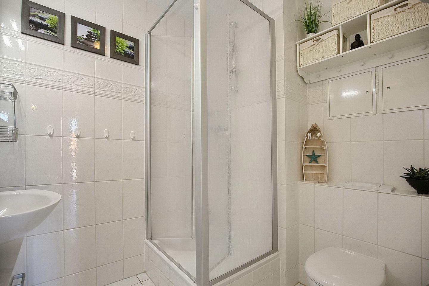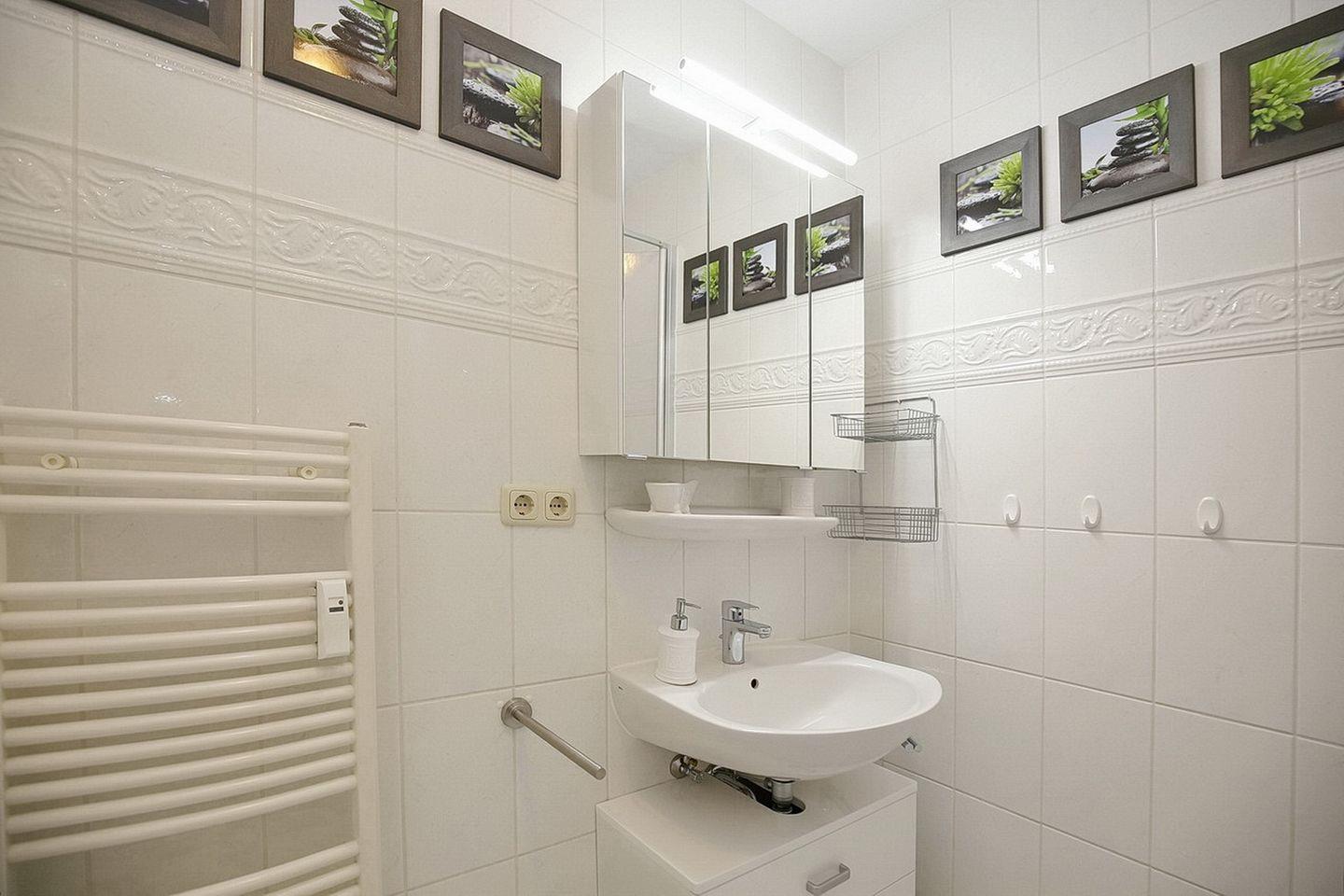 Das geflieste Duschbad hat eine Handtuchheizung. In dieser Nichtraucherwohnung sind Haustiere nicht erlaubt.