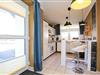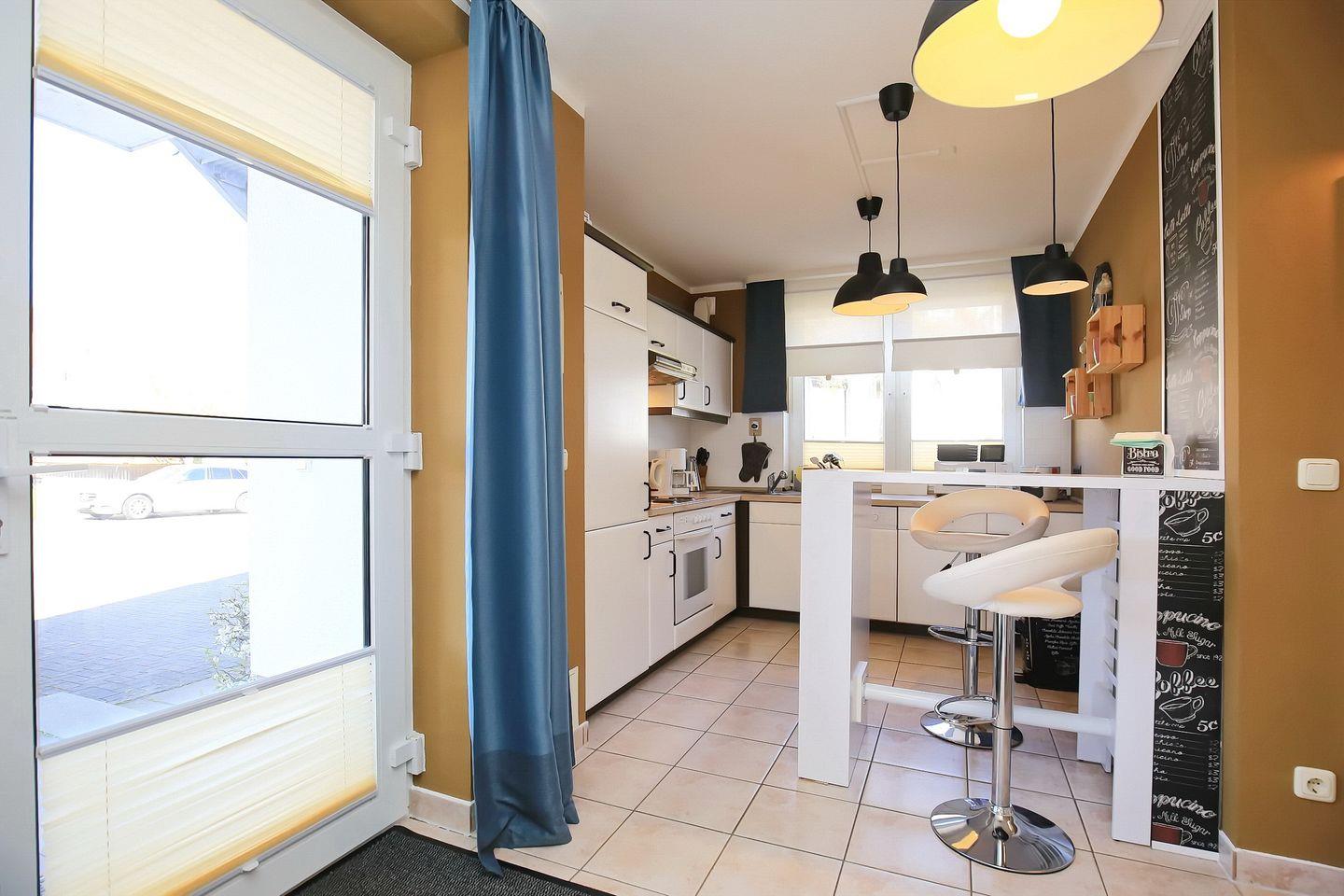 Für deine kulinarischen Erlebnisse ist die Küchenzeile mit Backofen, Geschirrspüler, Kühlschrank mit Gefrierfach und einem 4-Plattenkochfeld eingerichtet. Der Boden ist im Wohn- und Küchenbereich mit Fliesen ausgelegt.