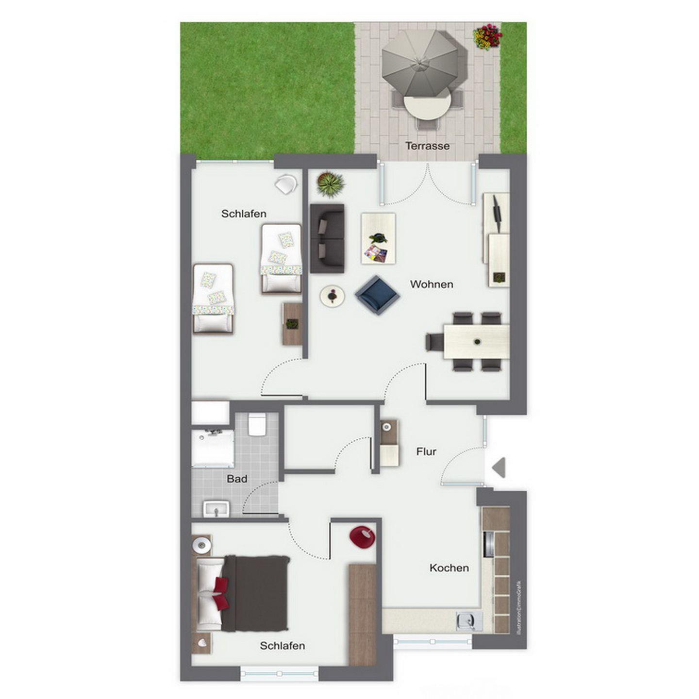 Das 3-Zi-Apartment mit Terrasse in Süd-Lage erstreckt sich über ca. 68 m² Wohnfläche und bietet dir und deinen Mitreisenden eine behagliche Unterkunft. Die Erdgeschosswohnung verfügt über einen Wohn- und Essbereich, zwei Schlafzimmer, ein Duschbad und eine Küchenzeile. Die Entfernung zum Strand beträgt von der Anlage Sünnslag ca. 400 m.