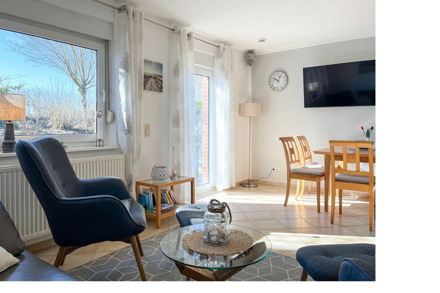 Im Erdgeschoss befindet sich das gemütliche Wohnzimmer – mit seiner gemütlichen Sitzecke und dem Kamin bietet es die besten Voraussetzungen für einen entspannten Urlaub. Neben einem großen Flatscreen -TV ( 40 Zoll ) sorgt eine hochwertige Stereoanlage der Marke Bose für Unterhaltung.
