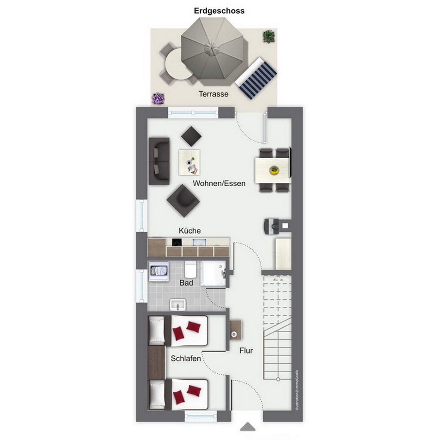 Dieses herrliche, ca. 63 m² große Reihenendhaus hat eine wunderschön gelegene Süd-West-Terrasse mit viel Grünfläche ringsumher. Eltern werden es sehr zu schätzen wissen, dass Kinder hier vor, neben und hinter dem Haus viel, viel Platz zum Spielen haben. Du bewohnst auf 2 Etagen ein Wohnzimmer mit integrierter Küchenzeile, 2 Schlafzimmer und ein Duschbad. Die Strandentfernung beträgt ca. 350 m.