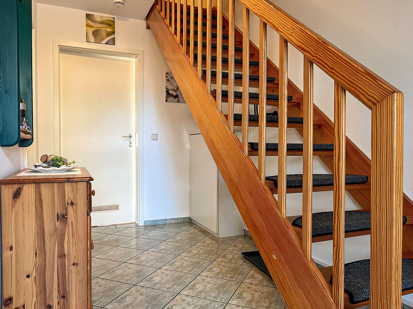 Das geflieste Bad mit WC und Dusche befindet sich ebenfalls im Erdgeschoss. Im Obergeschoss steht ein zusätzliches Gäste-WC zur Verfügung. Für die Wäsche zwischendurch nutzt du die Waschmaschine.
