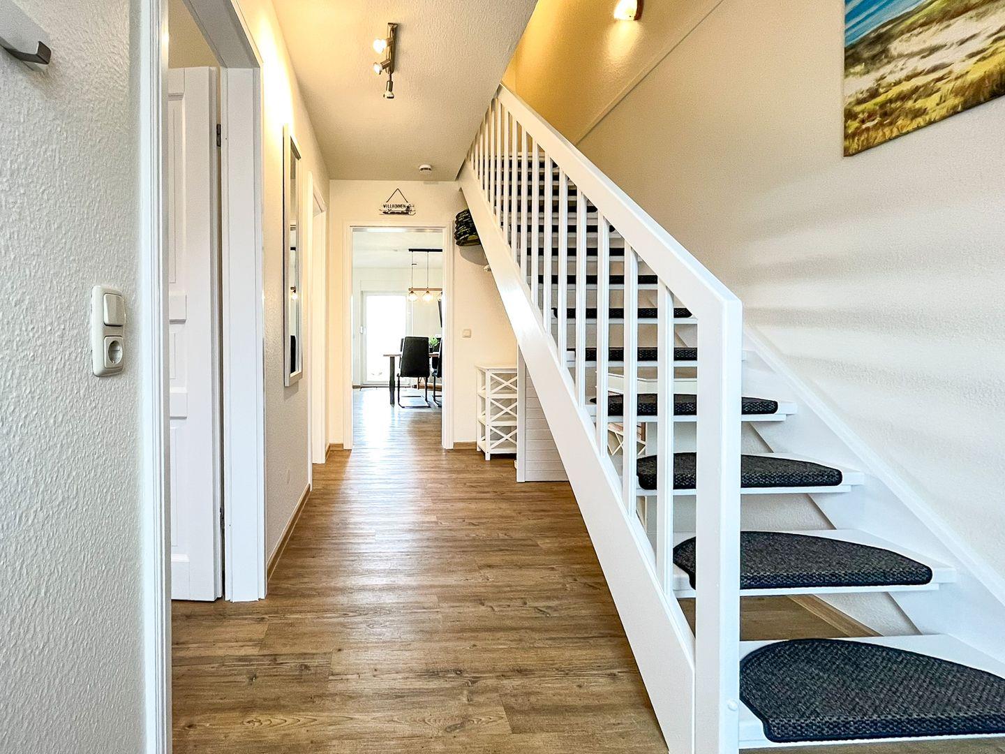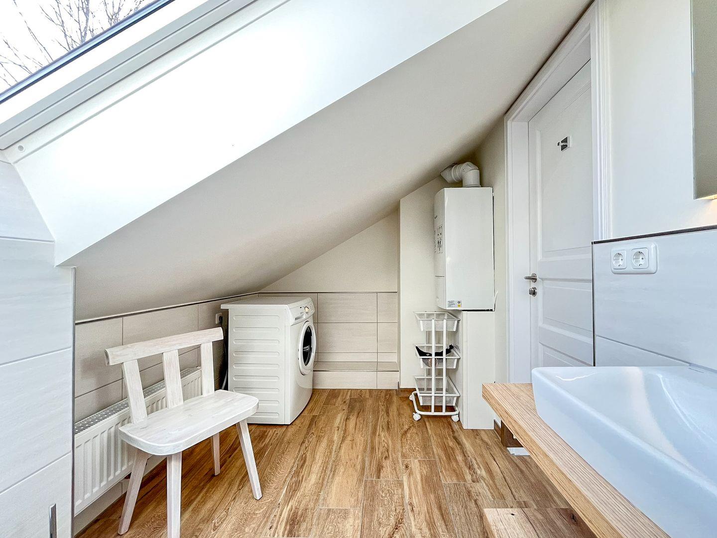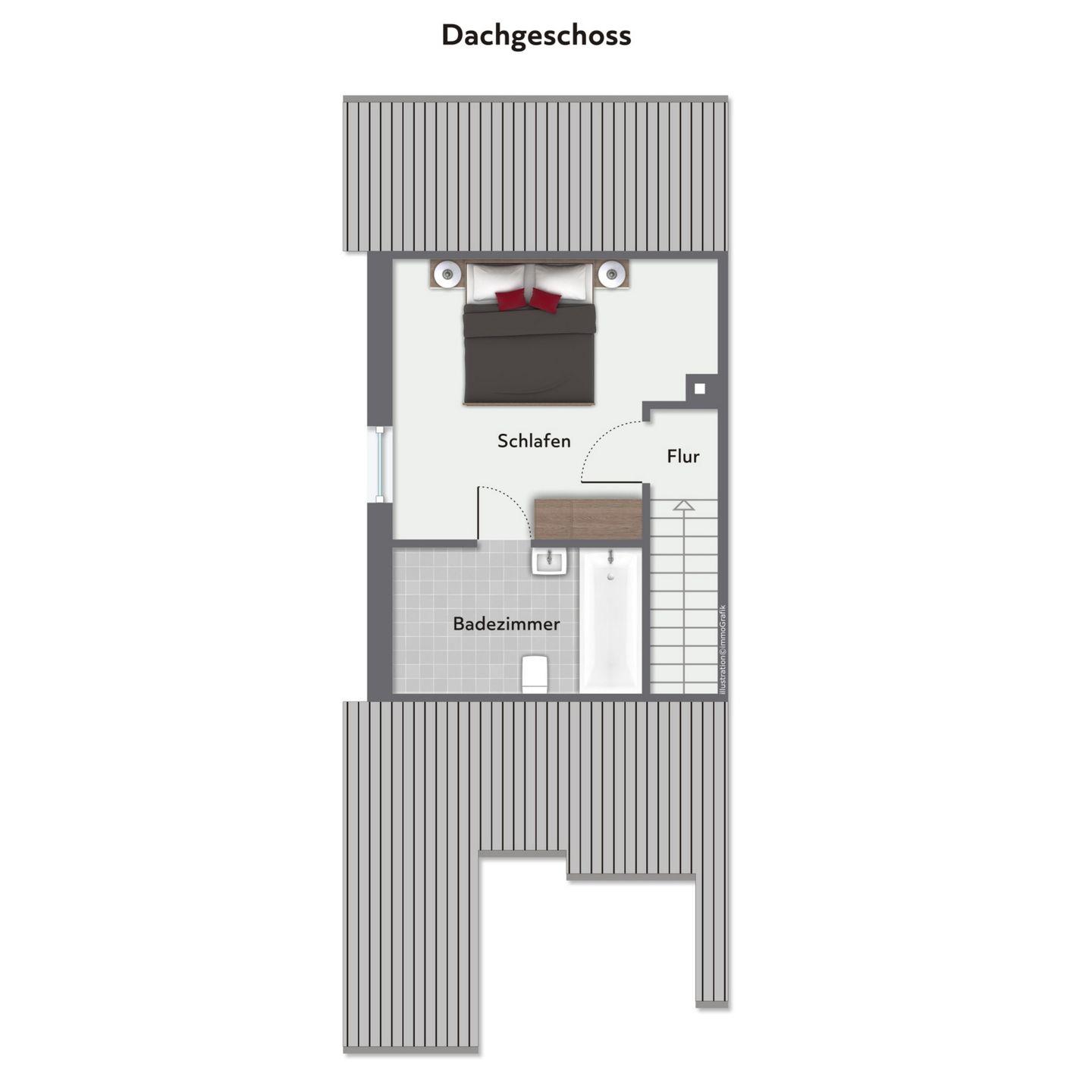 In der oberen Etage befindet sich ein Schlafzimmer mit Doppelbett (2 x 90 x 200 cm) und angeschlossenem Bad mit Badewanne. Hier findest du auch die Waschmaschine zur Nutzung vor.