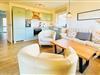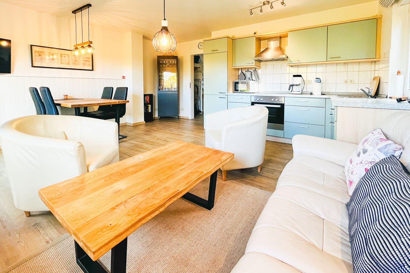 Vom Wohnbereich aus gelangst du direkt auf die Terrasse. Im hellen Wohn- und Essbereich befindet sich das moderne Sofa. Für Unterhaltung sorgen der Smart-TV und die Stereoanlage. In unmittelbarer Nähe der Küchenzeile befindet sich der Essplatz. Die im Wohnzimmer integrierte Küchenzeile ist unter anderem ausgestattet mit Geschirrspüler, Herd mit Backofen, Kühlschrank mit Gefrierfach und Mikrowelle.