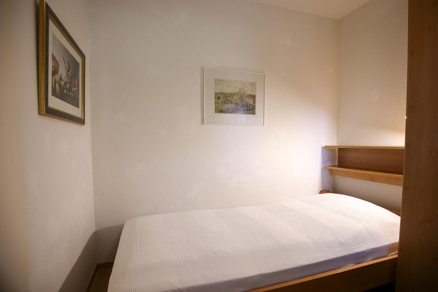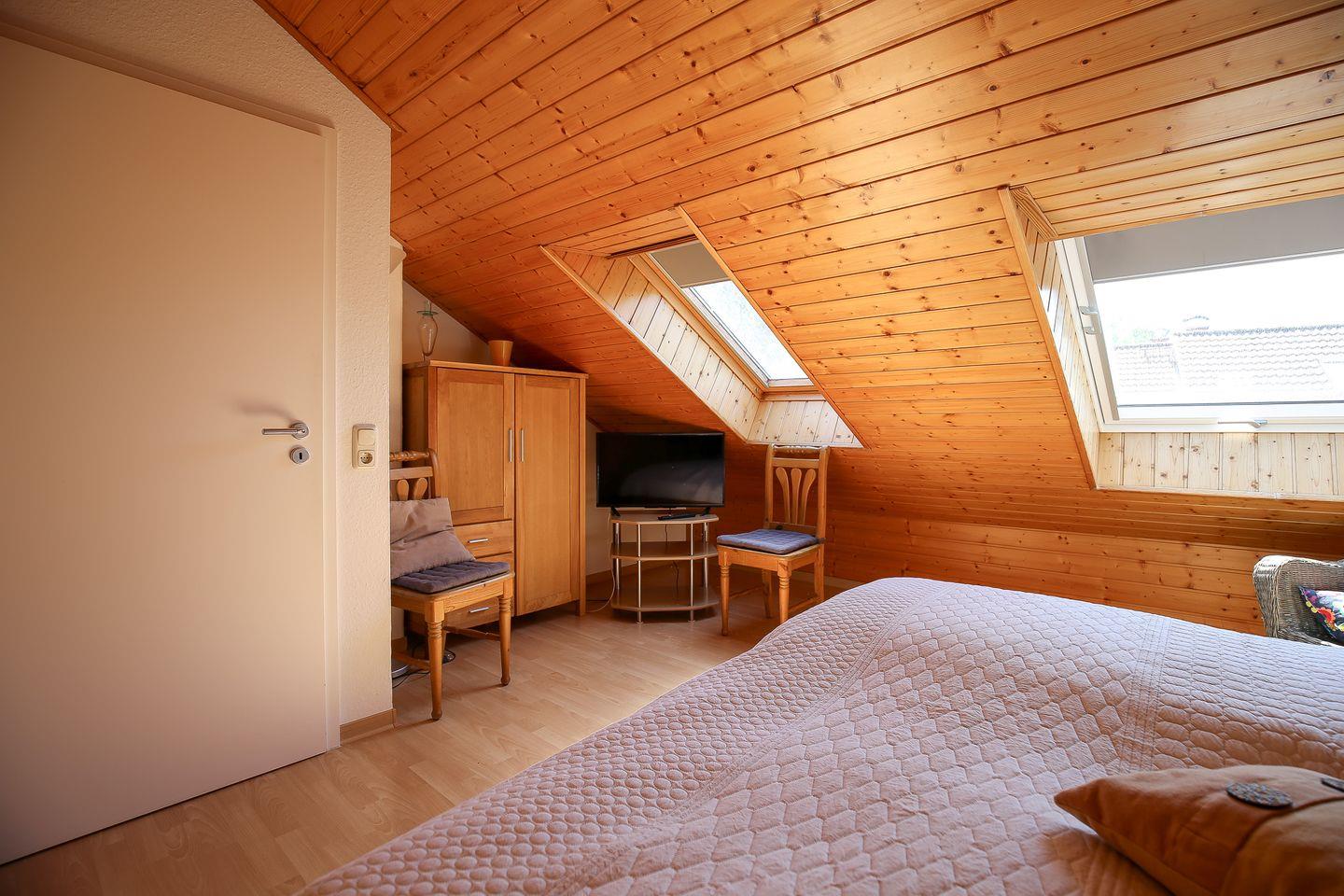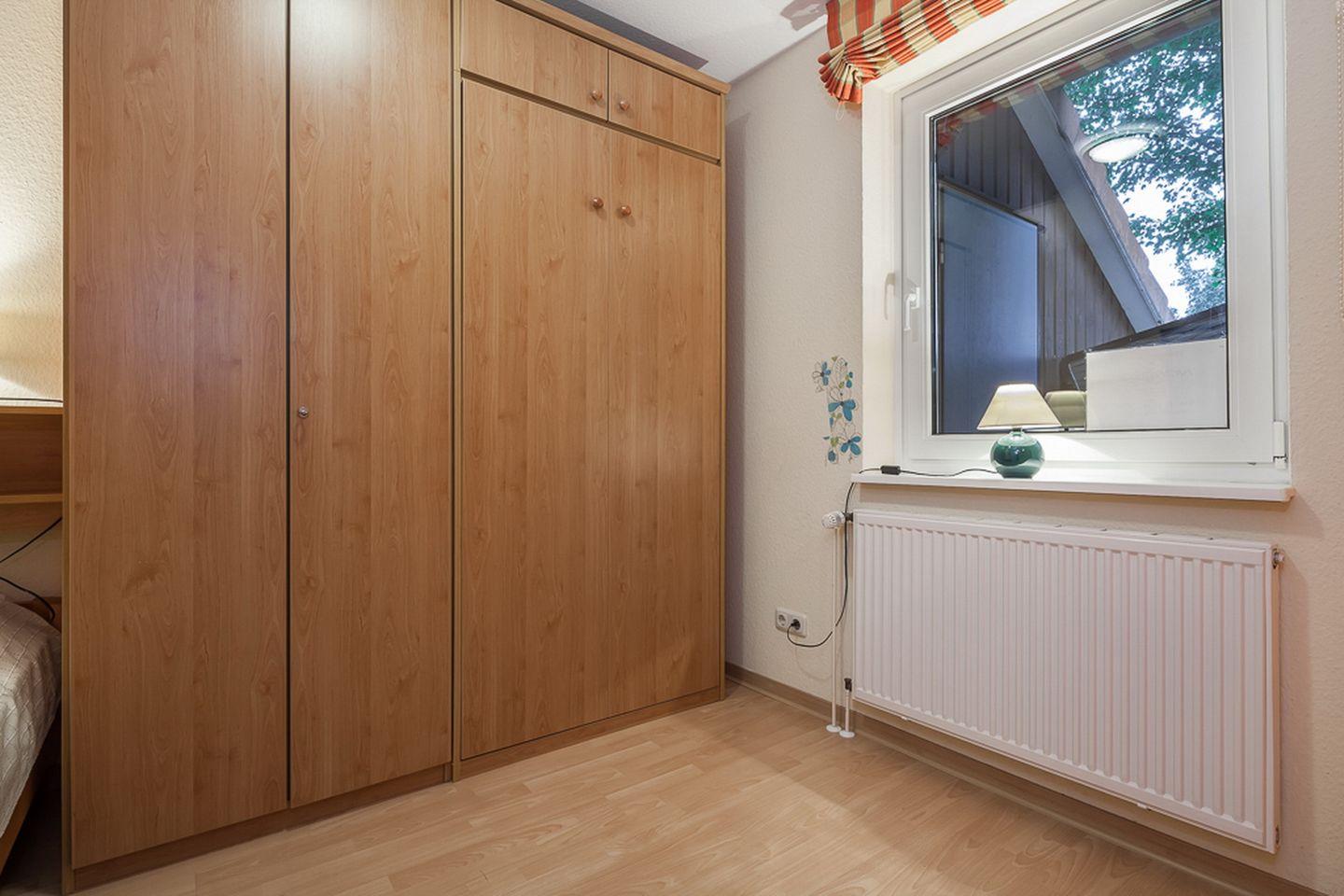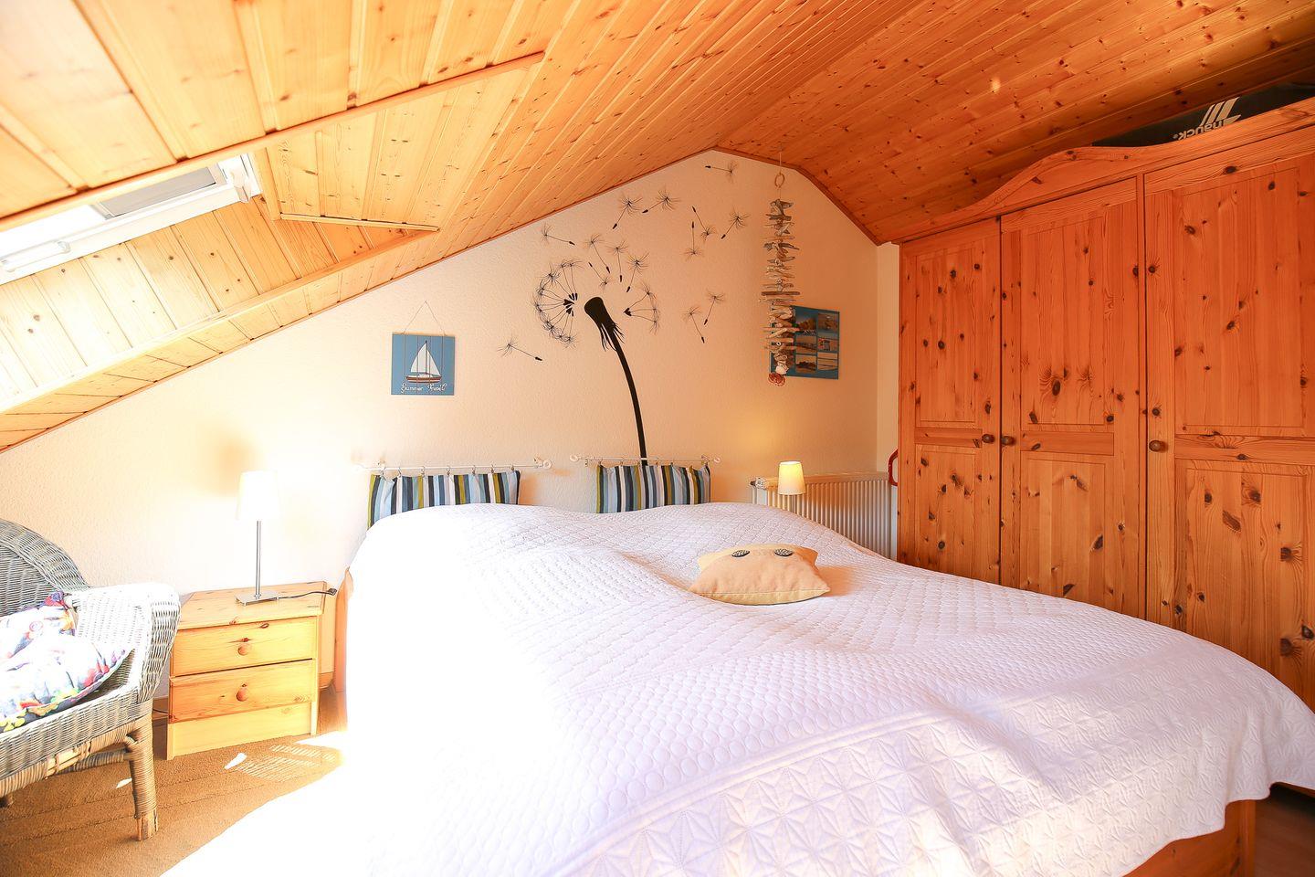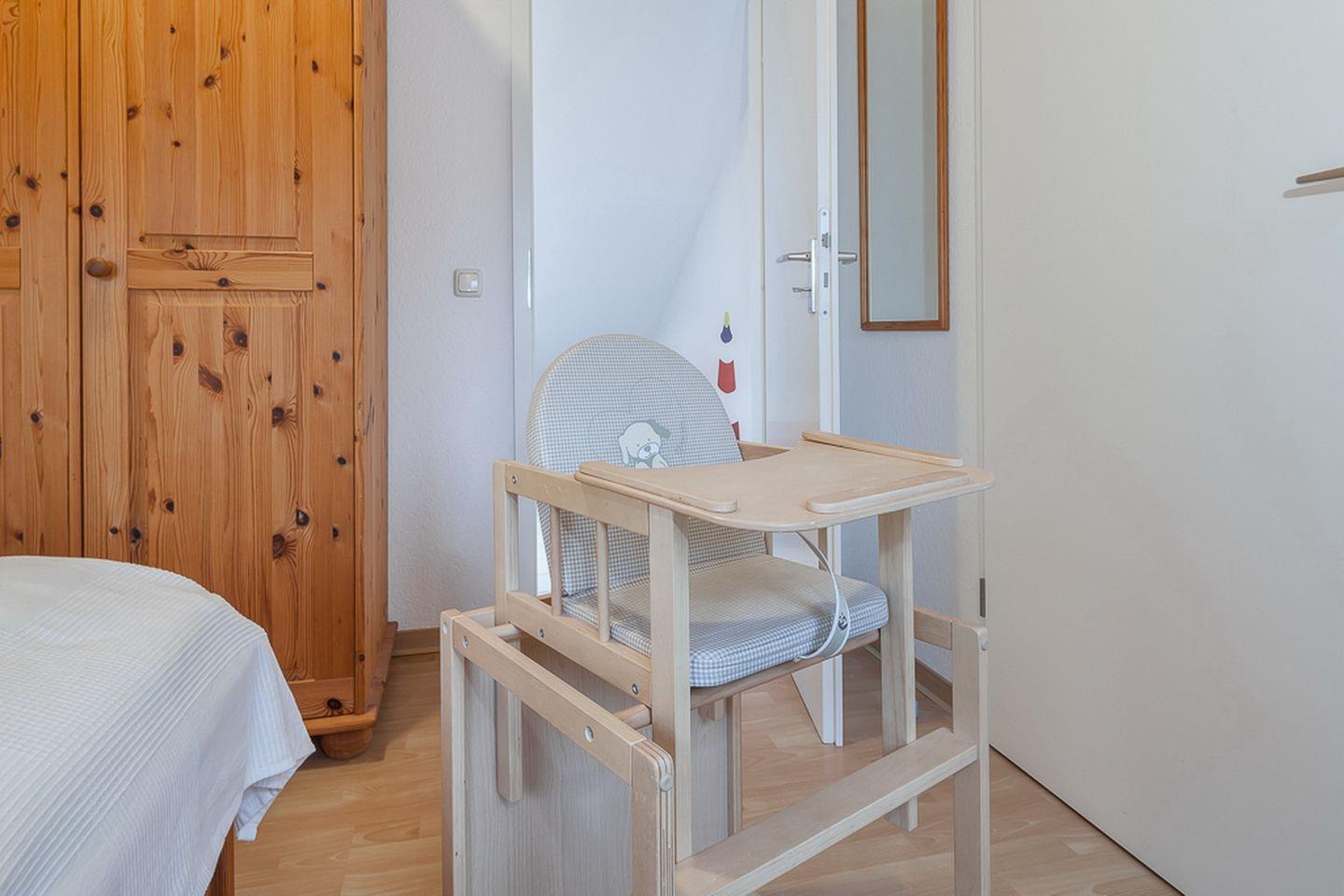 Als Schlafgelegenheiten stehen in einem Schlafzimmer ein Doppelbett (2 x 90 x 200 cm) und im zweiten Schlafzimmer zwei Einzelbetten (je 90 x 200 cm) zur Verfügung. Ein zweiter Fernseher im Schlafzimmer kann genutzt werden. Für Familien mit kleinen Kindern steht ein Kinderhochstuhl bereit.