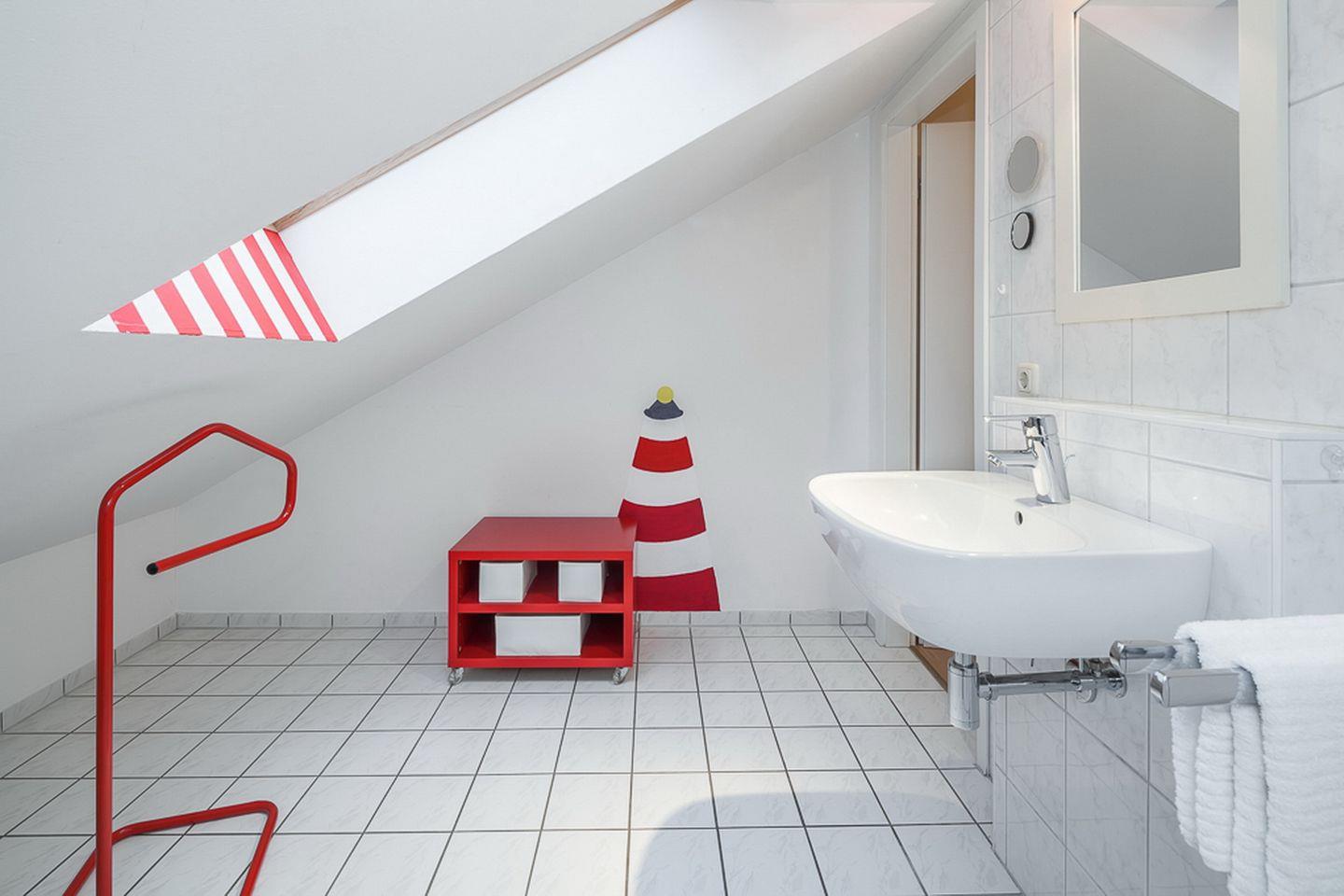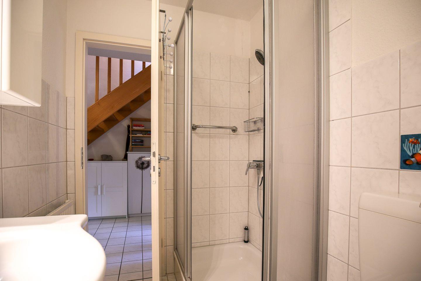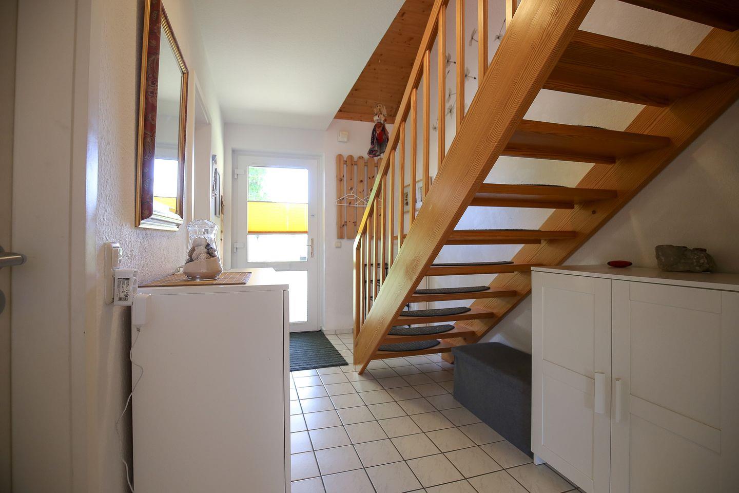 Ein Duschbad befindet sich im Erdgeschoss und ein zusätzliches Gäste-WC im Obergeschoss. Eine Waschmaschine ist im Ferienhaus vorhanden. Die Wohn- und Schlafräume des Ferienhauses sind mit Laminat ausgelegt, die Nassräume sind gefliest. An den Fenstern befinden sich Plissees und Vorhänge. Zusätzlich können das Wohnzimmer sowie das untere Schlafzimmer mit Rollläden abgedunkelt werden.