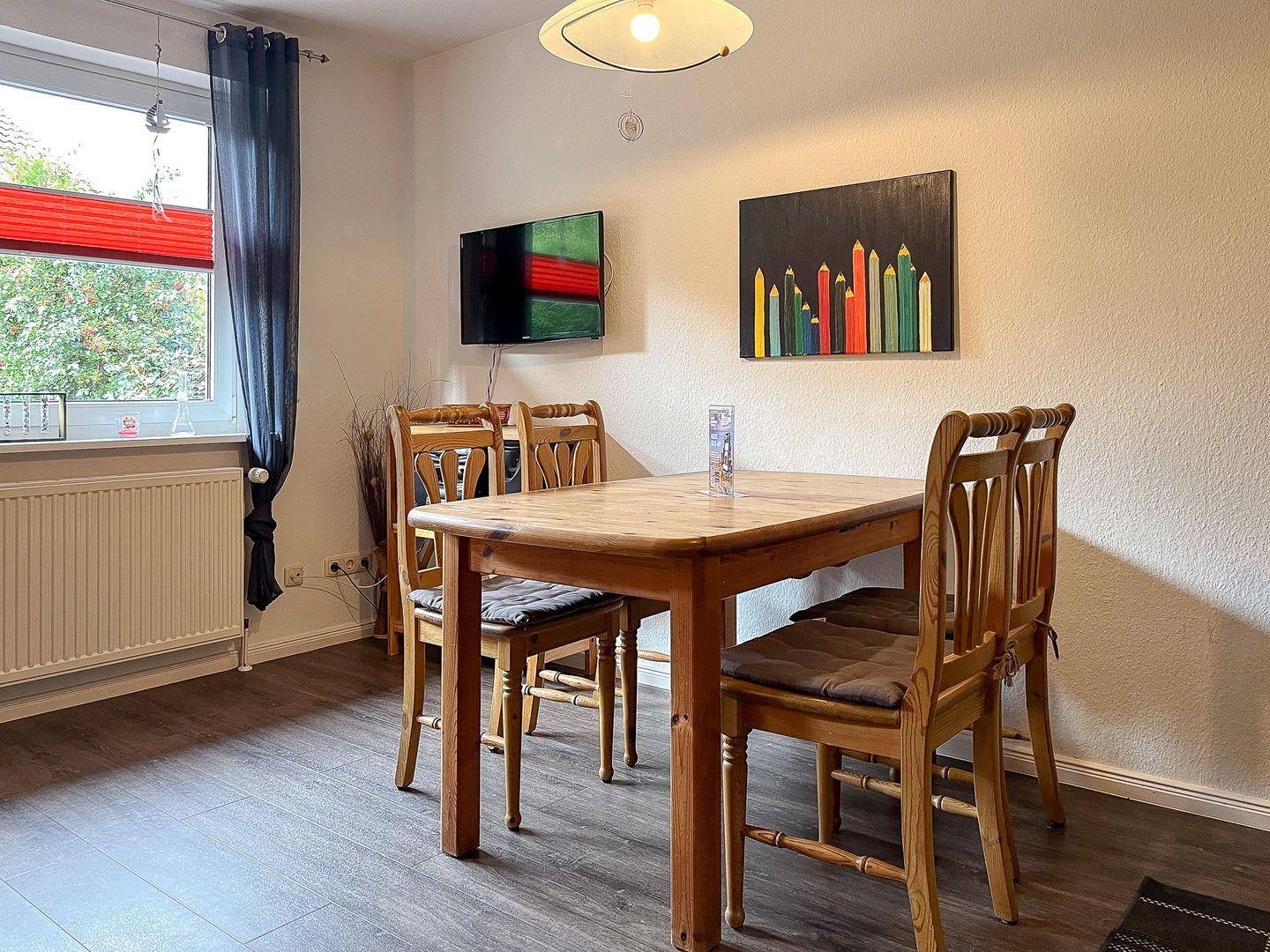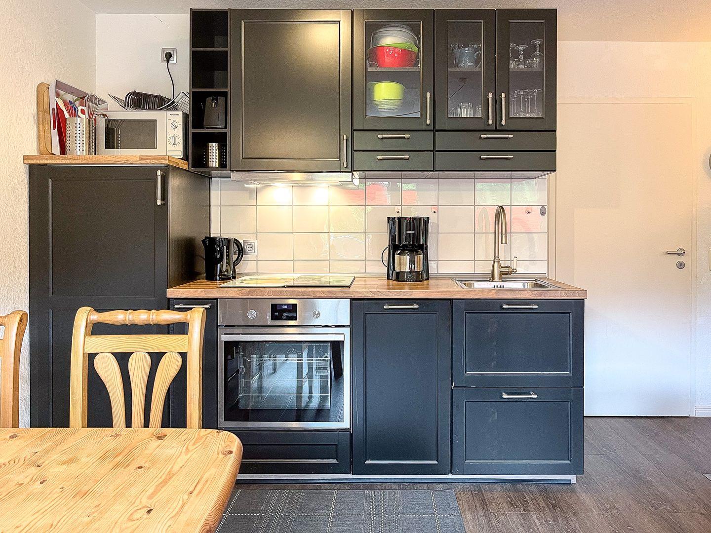 Die Küche ist voll ausgestattet und bietet neben einem 4-Platten-Cerankochfeld mit Backofen auch einen Geschirrspüler und eine Mikrowelle. Ein gemütlicher Essplatz befindet sich in unmittelbarer Nähe der Küchenzeile.