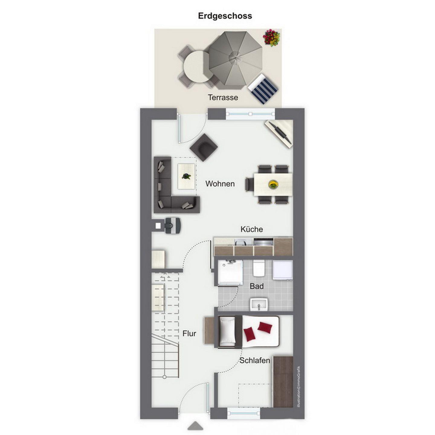 Auf 2 Ebenen verfügt dein Ferienhaus 45 b auf ca. 54 m² über das Wohnzimmer mit integrierter Küchenzeile, 2 Schlafzimmer, 1 Duschbad, ein Gäste-WC sowie eine Terrasse in Richtung Westen. Zum Strand sind es ca. 350 Meter.