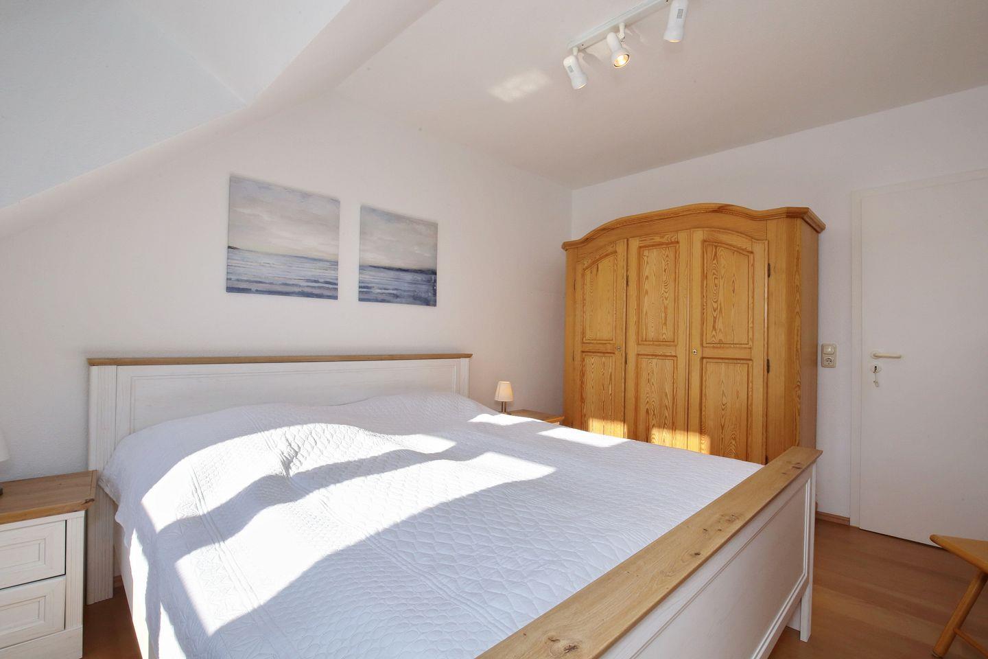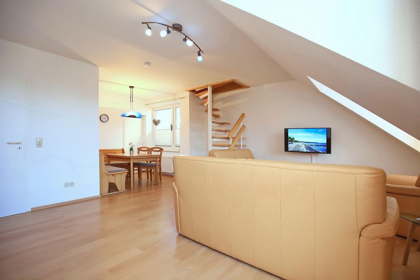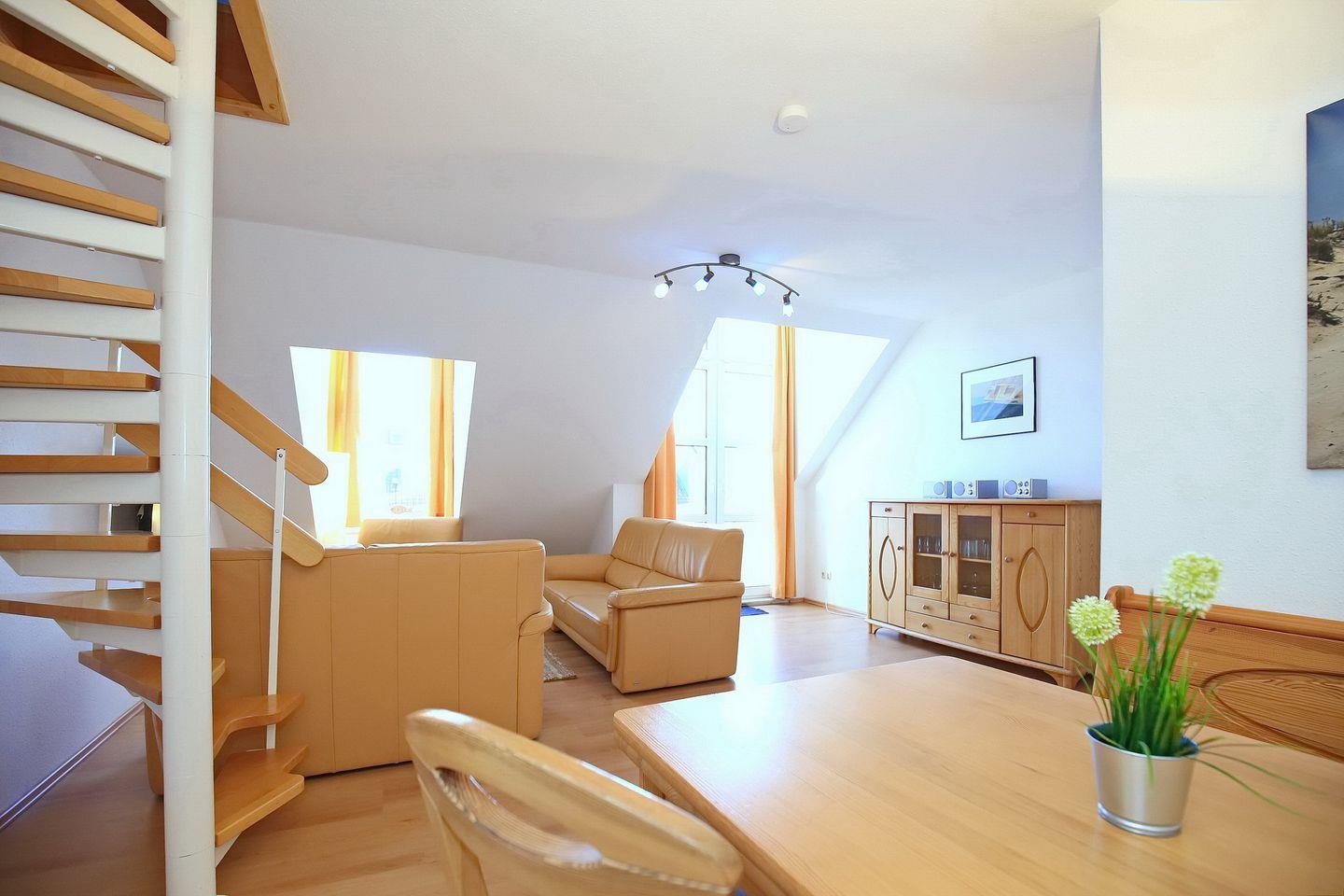 Die 4-Zimmerferienwohnung Sünnslag 67 mit 75 qm verläuft über zwei Etagen (2. OG + DG). Der Balkon ist vom Wohnzimmer aus zu betreten. Dieses Appartement ist für bis zu 6 Personen zugelassen. WLAN (ohne Gewähr) inklusive.