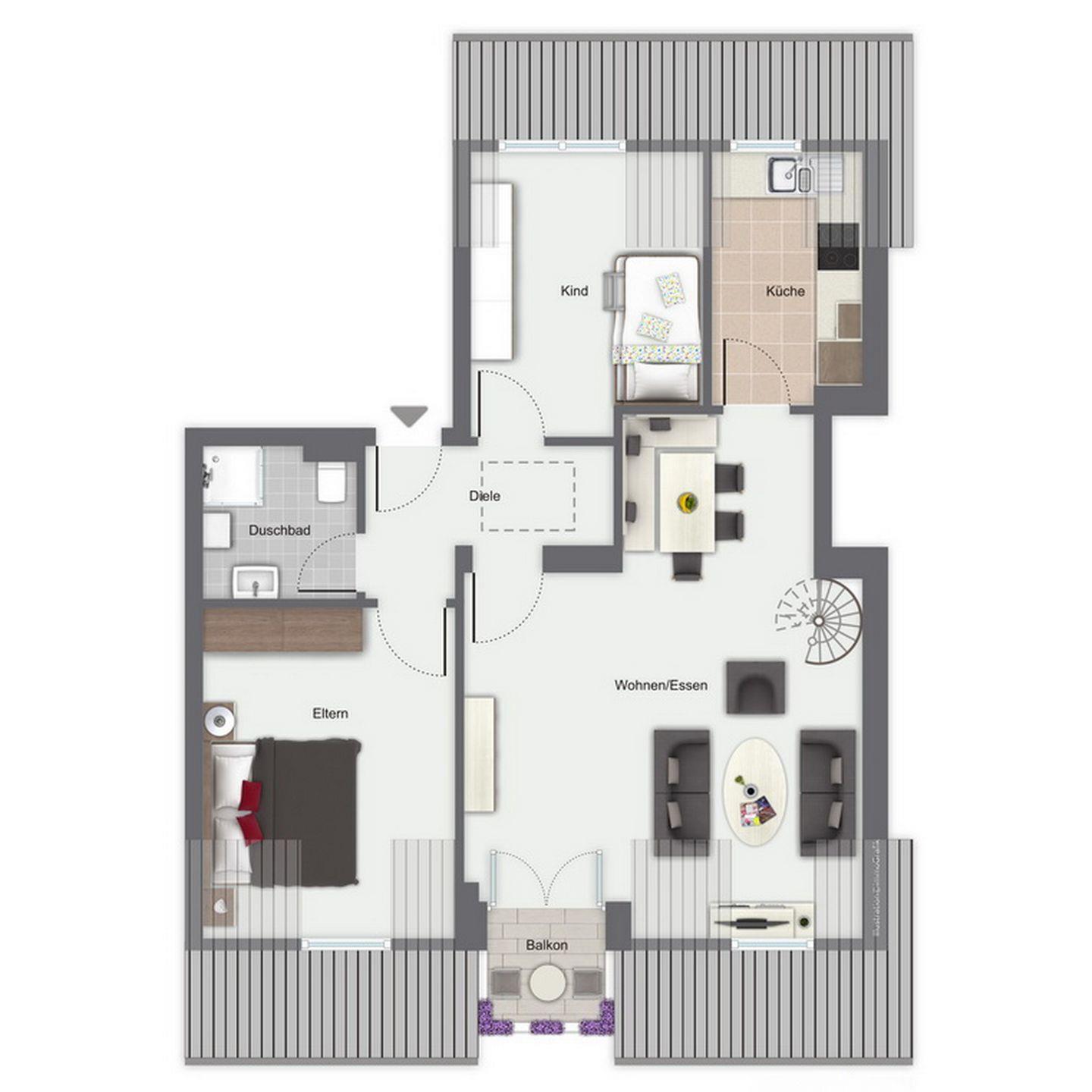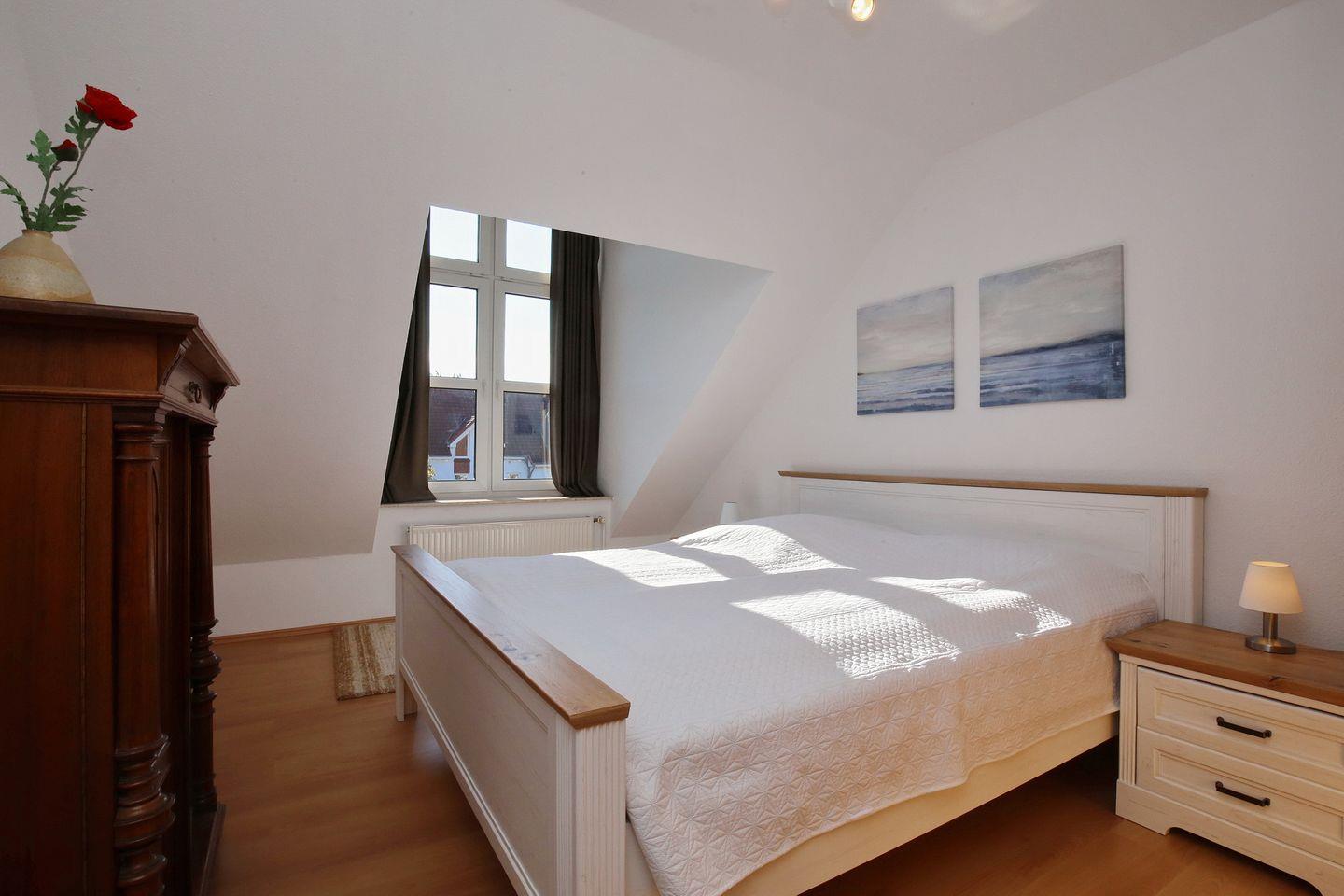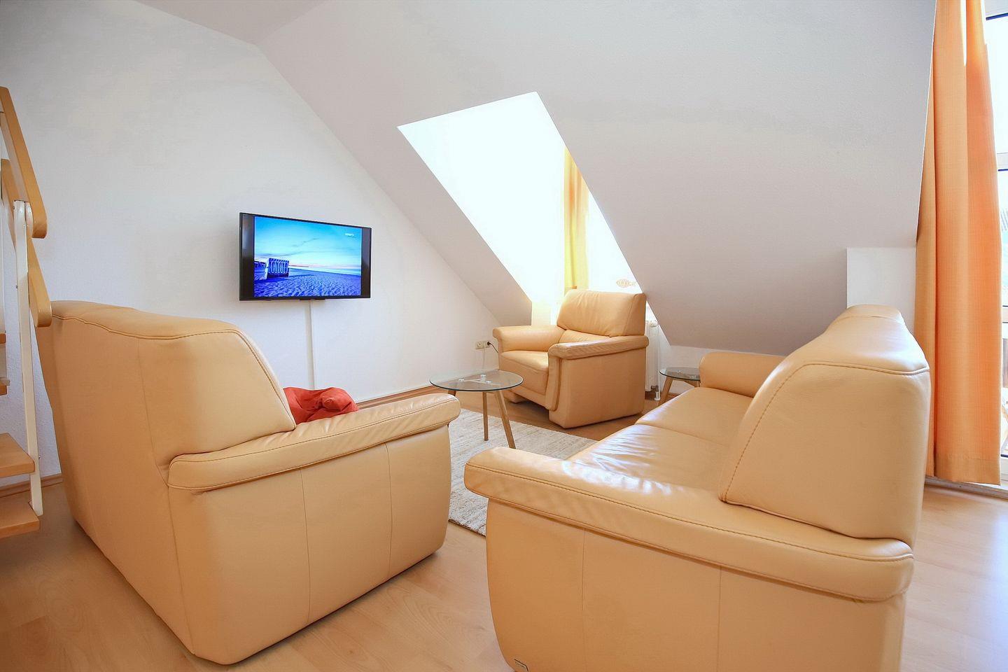 Die 4-Zimmerferienwohnung Sünnslag 67 mit 75 qm verläuft über zwei Etagen (2. OG + DG). Der Balkon ist vom Wohnzimmer aus zu betreten. Dieses Appartement ist für bis zu 6 Personen zugelassen. WLAN (ohne Gewähr) inklusive.