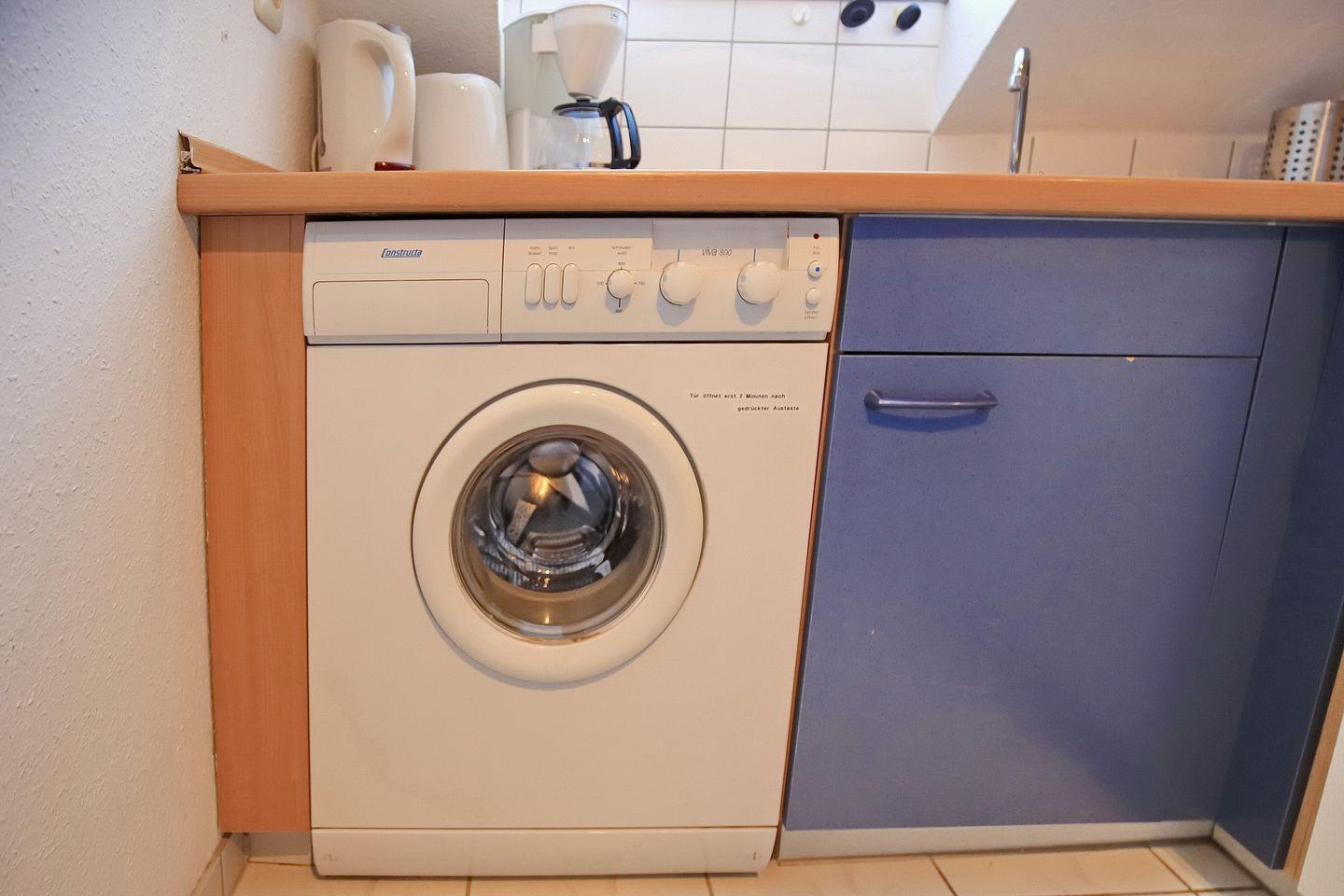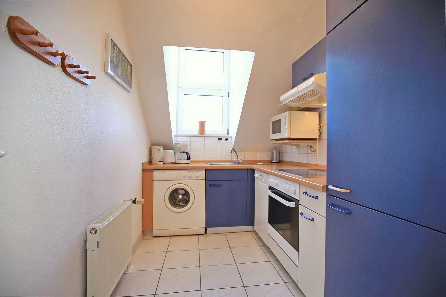 Die praktisch ausgestattete separate Küche bietet ein 4-Plattenkochfeld mit Backofen, einen Kühlschrank mit Gefrierfach, eine Mikrowelle und einen Geschirrspüler. Auch eine Waschmaschine kann genutzt werden. Im Flur kannst du deine Urlaubsgarderobe in einem Kleiderschrank verstauen. Auf der unteren Ebene ist der Boden mit Laminat ausgelegt.