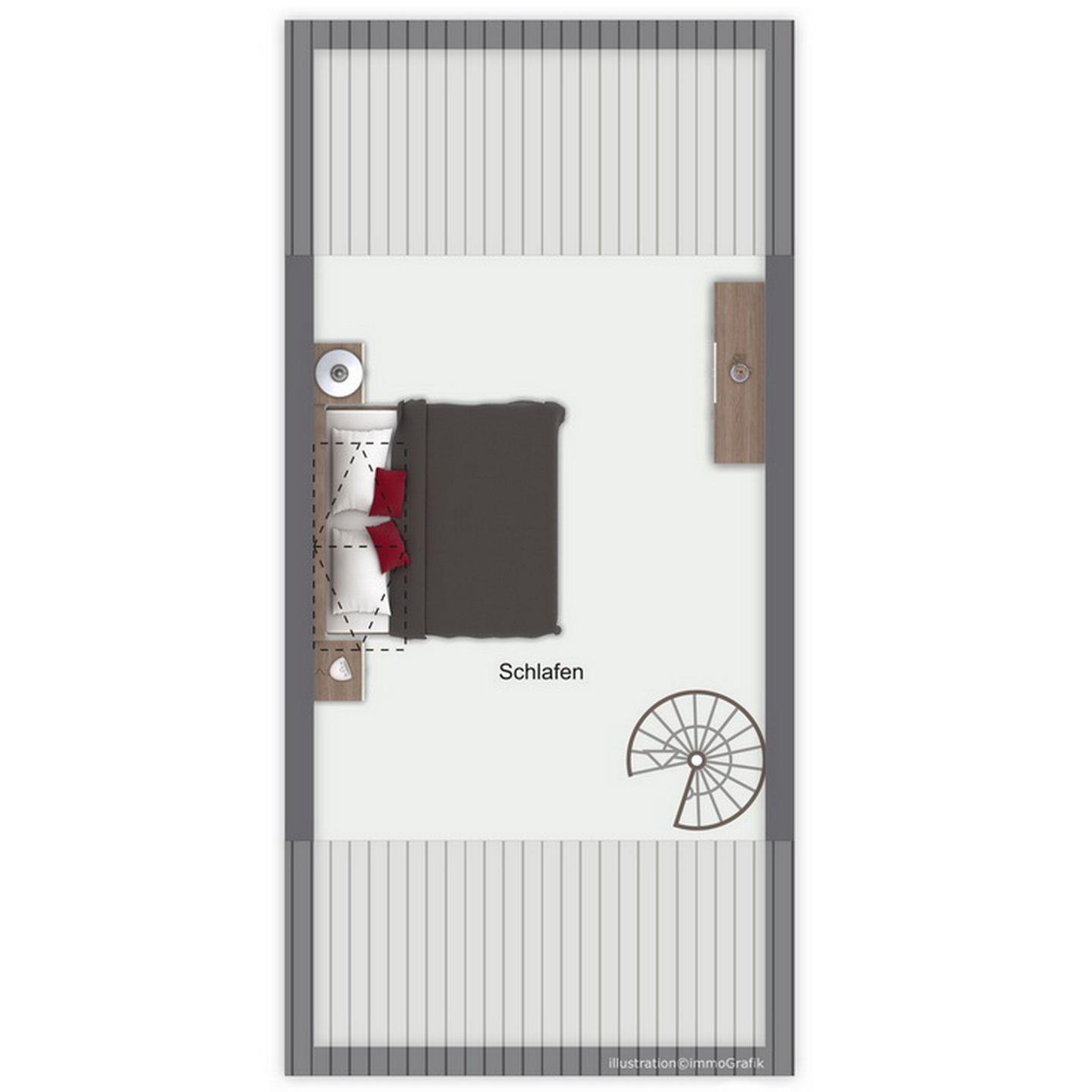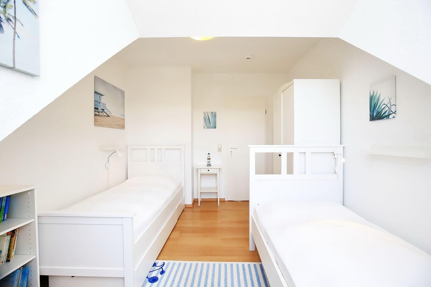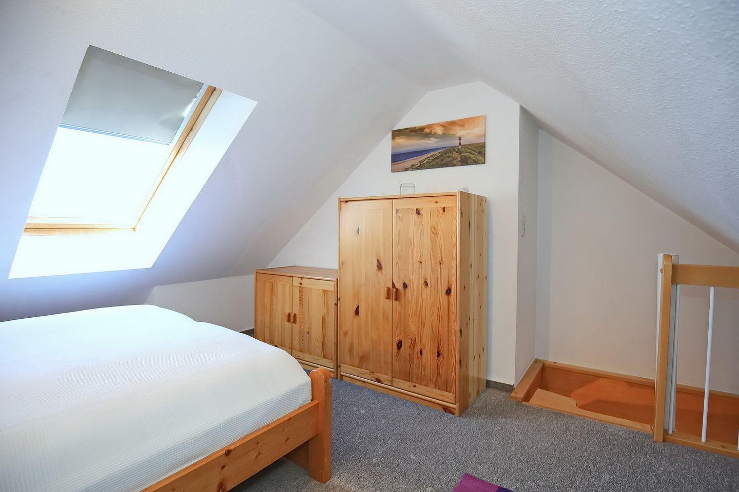 In der unteren Etage gibt es zwei Schlafzimmer mit einem Doppelbett (2 x 90 x 200 cm), zwei Einzelbetten (90 x 200 cm) und jeweils einem Kleiderschrank. Zur Verdunklung sind an den Fenstern Vorhänge angebracht. Über eine innenliegende Treppe im Wohnzimmer erreichst du einen weiteren Schlafraum mit einem Doppelbett (2 x 90 x 200 cm) und einer Kommode. Als Bodenbelag wurde hier Teppich gewählt. Am Fenster befindet sich ein Rollo.
