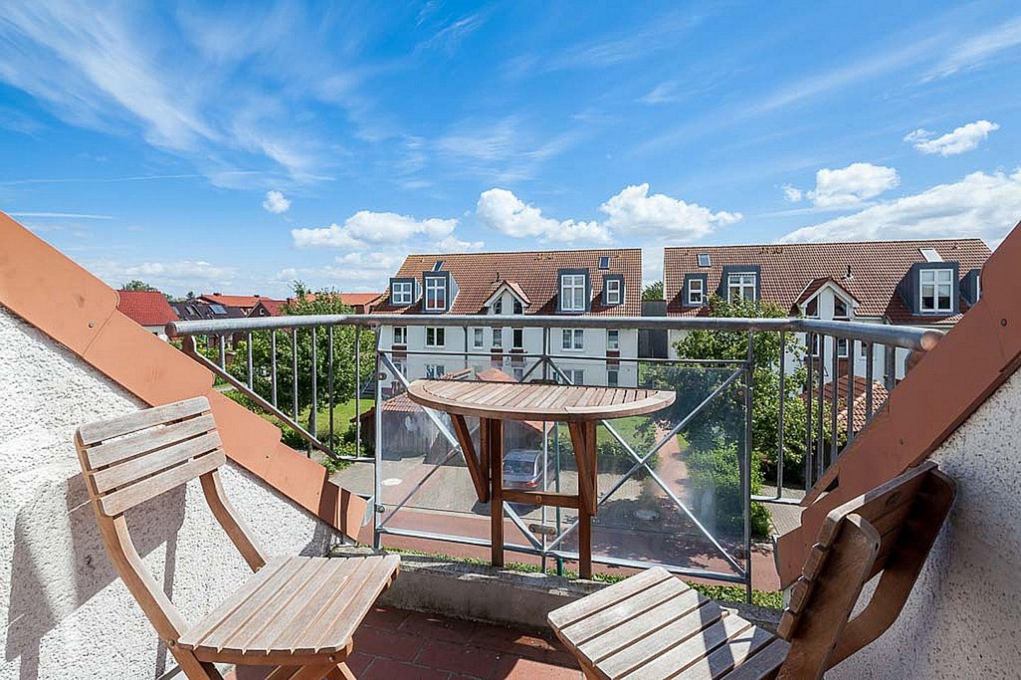 Vom möblierten Balkon genießt du einen schönen Blick über die begrünte Ferienanlage. Dieser schließt sich dem lichtdurchfluteten Wohnbereich mit Ledercouchgarnitur und dem Essbereich mit Polstereckbank direkt an. Für Abwechslung sorgen ein TV und eine Stereoanlage.