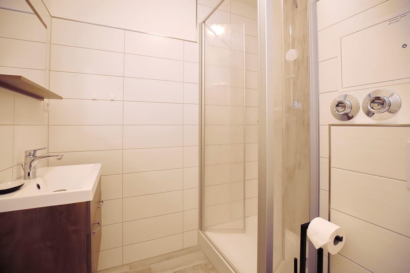 Das Duschbad ist gefliest. In dieser Nichtraucherwohnung sind Haustiere nicht erlaubt.
