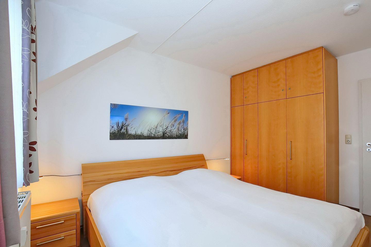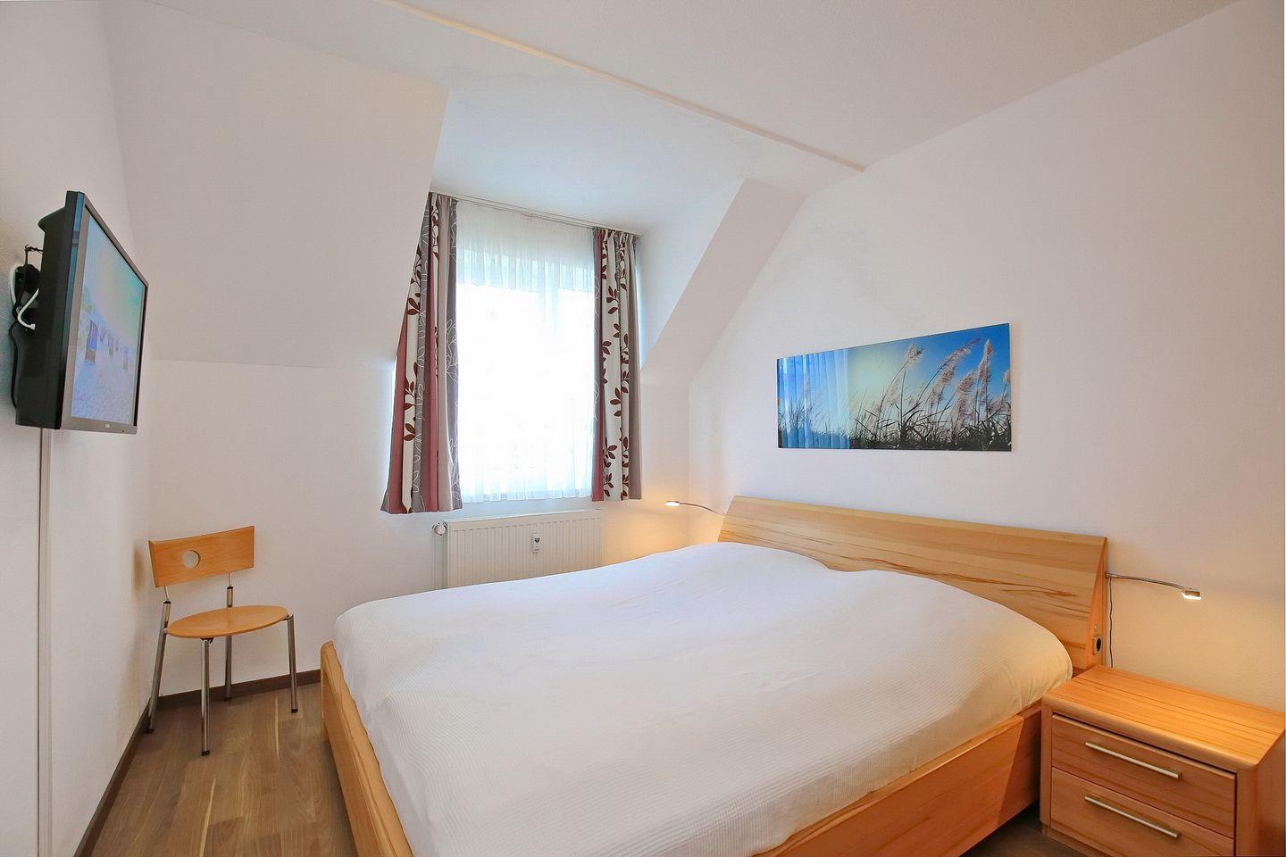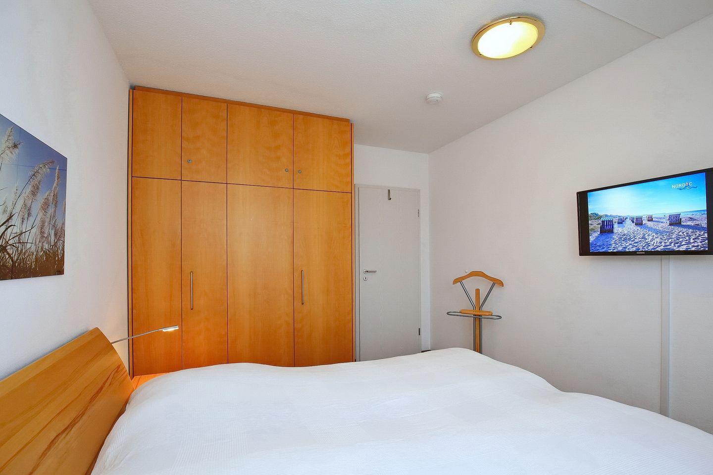 Das separate Schlafzimmer verfügt über ein Doppelbett (2 x 90 x 200 cm) und einen Kleiderschrank mit viel Stauraum für deine Urlaubsgarderobe sowie über lichtdichte Vorhänge. Weiterhin sorgt ein Flachbild-TV für Unterhaltung. Außerdem ist hier genügend Platz, um ein Kinderreisebett aufzustellen. In diesem Objekt sind maximal zwei Haustiere erlaubt!