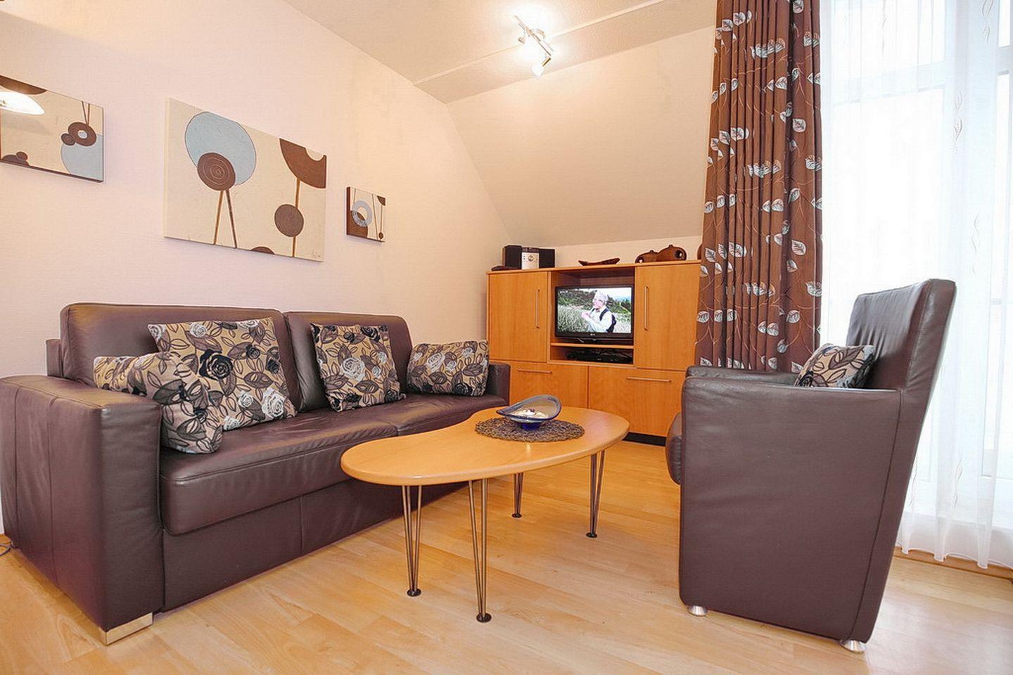 Das durch den Flur erreichbare Wohnzimmer empfängt dich mit einer Couch und zwei Sesseln, in denen du es dir gemütlich machen kannst. Ein Flachbild-TV (SKY), ein DVD-Player und eine Stereoanlage sorgen für umfangreiche Unterhaltung. Zusätzlich lassen die zahlreichen Bücher keine Langeweile aufkommen. Die moderne Esstischgarnitur am hellen Balkonfenster bietet den idealen Platz für gemeinsame Mahlzeiten. Für unsere kleinen Gäste ist zusätzlich ein Hochstuhl vorhanden. Die Couch kann durch Ausklappen in einen Komfortschlafplatz (190 x 150 cm) für zwei Personen verwandelt werden.