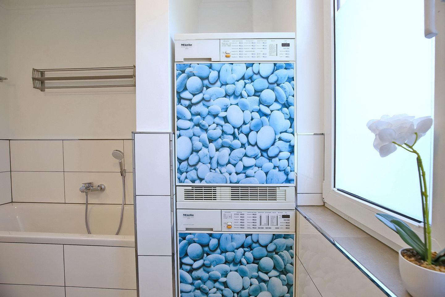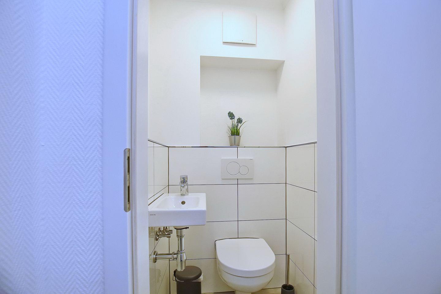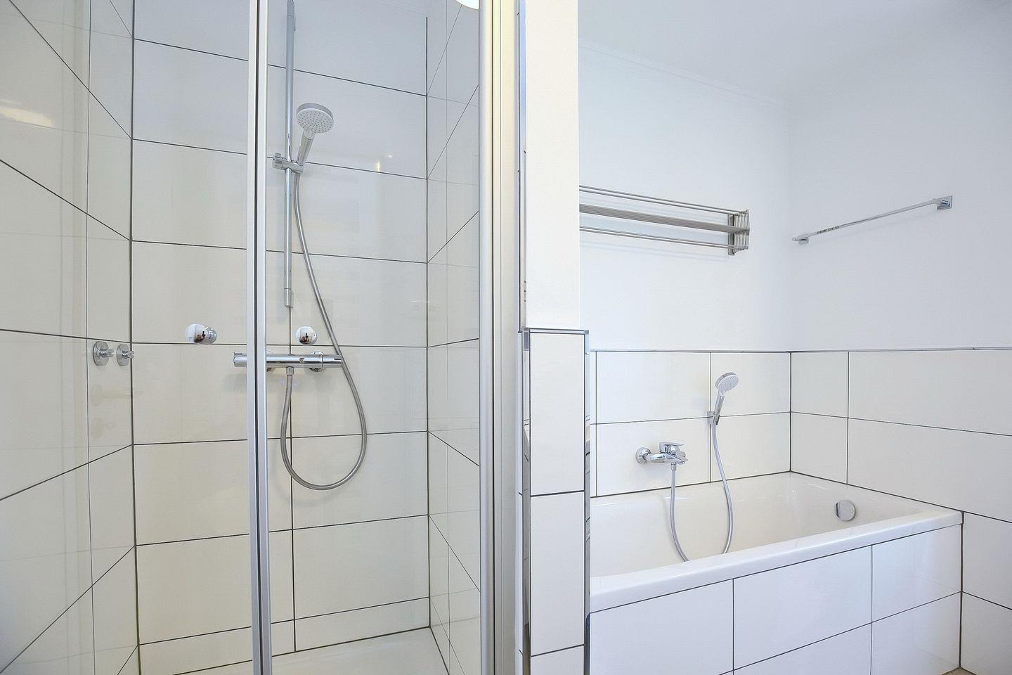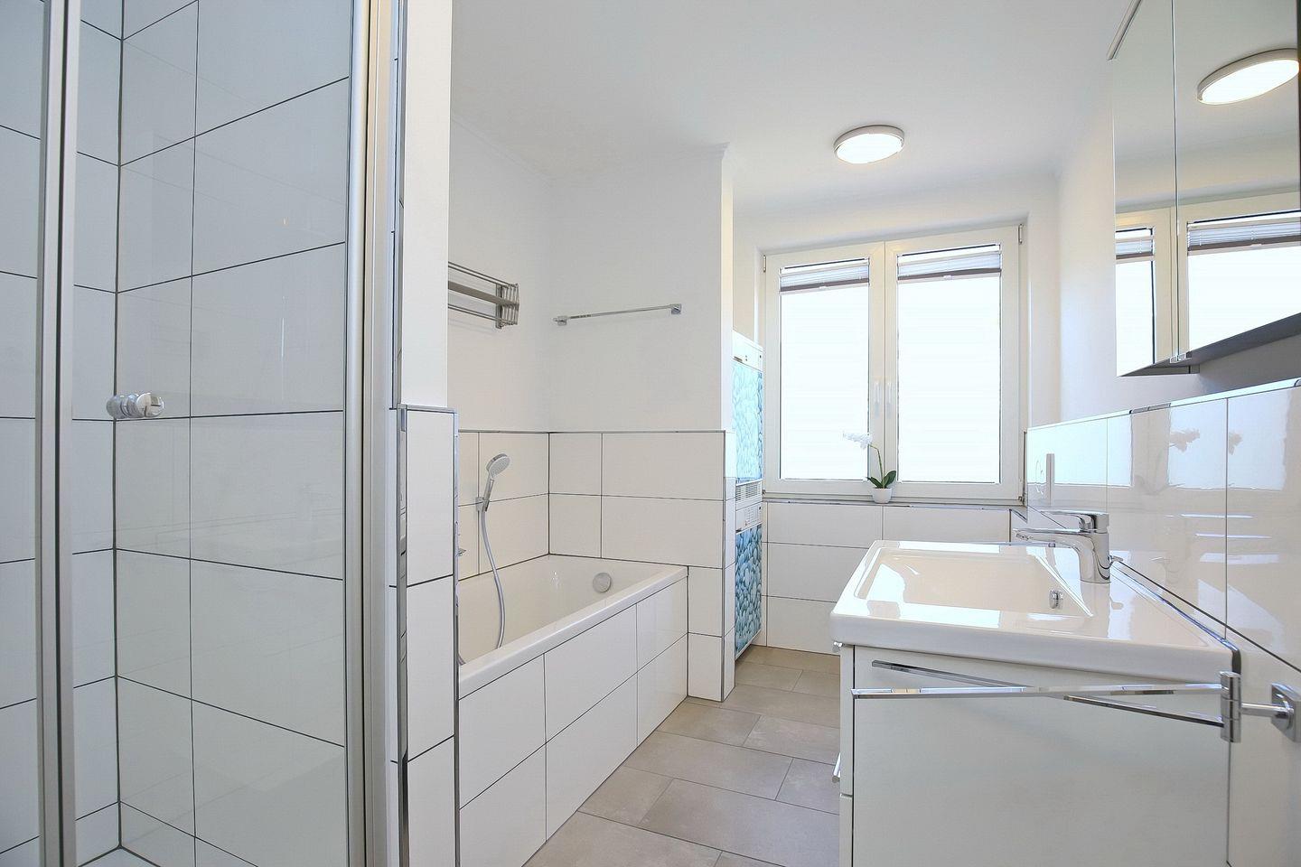In dem großzügigen Badezimmer mit großer Badewanne und Dusche befinden sich auch Waschmaschine und Trockner. Ein separates Gäste-WC ist zusätzlich vorhanden, ebenso eine kleine Abstellkammer, die Stauraum für Staubsauger, Bügelbrett, Bügeleisen, Wäscheständer usw. bietet.