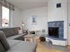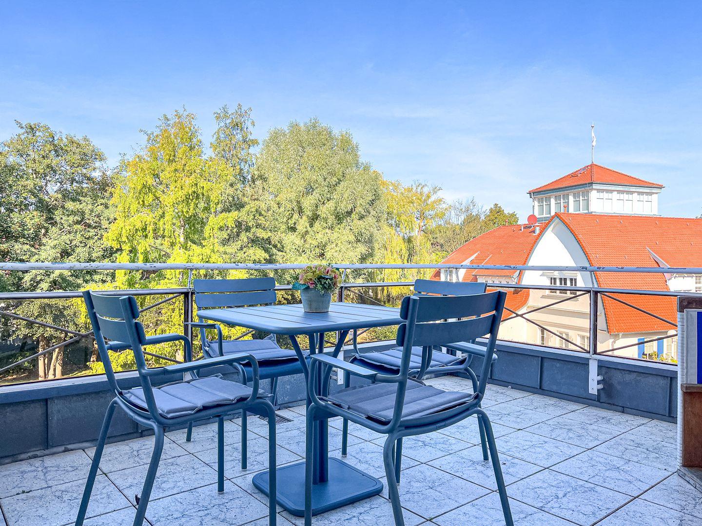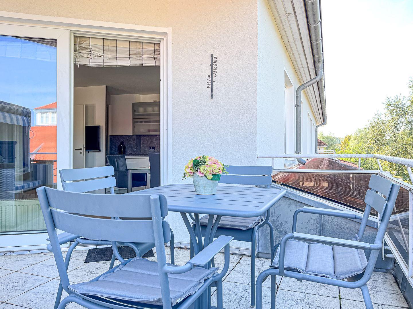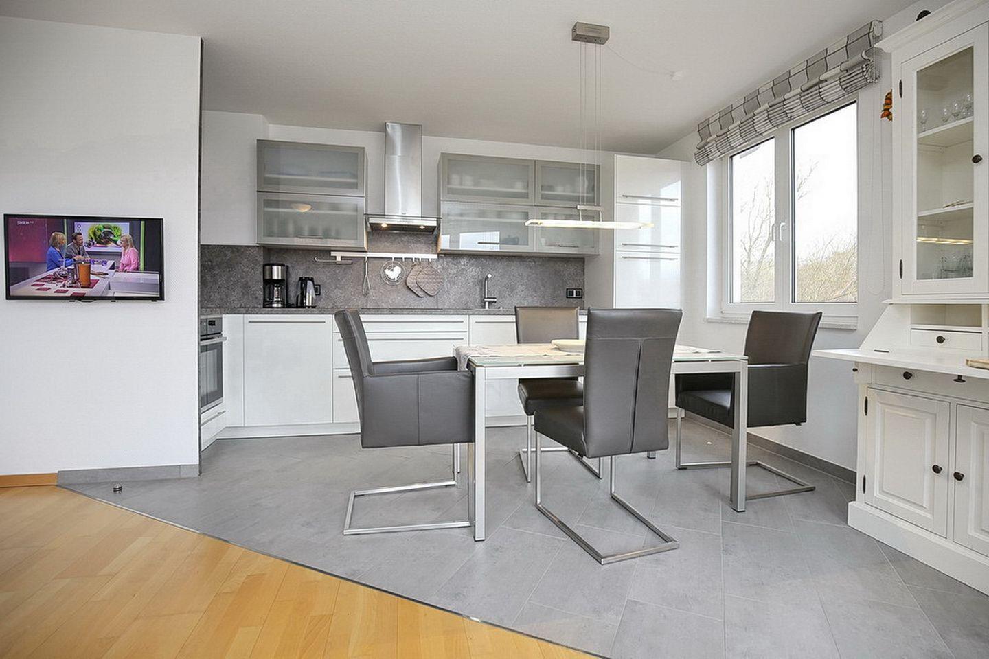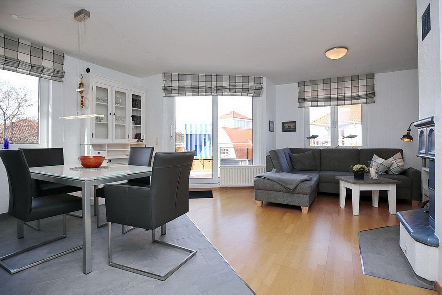 Der Wohnbereich ist hell und modern eingerichtet. Hier lädt die gemütliche Couch zum Verweilen ein. Dir steht ein Flachbild-TV zur Verfügung. Zusätzlich lassen die zahlreichen Bücher keine Langeweile aufkommen. Blickpunkt ist ein Kamin, der gerade in der kalten Jahreszeit für Gemütlichkeit sorgt. Vom Wohnzimmer aus erreichst du die nord-westlich ausgerichtete Dachterrasse/Eckbalkon mit Strandkorb und Balkonmöbeln.