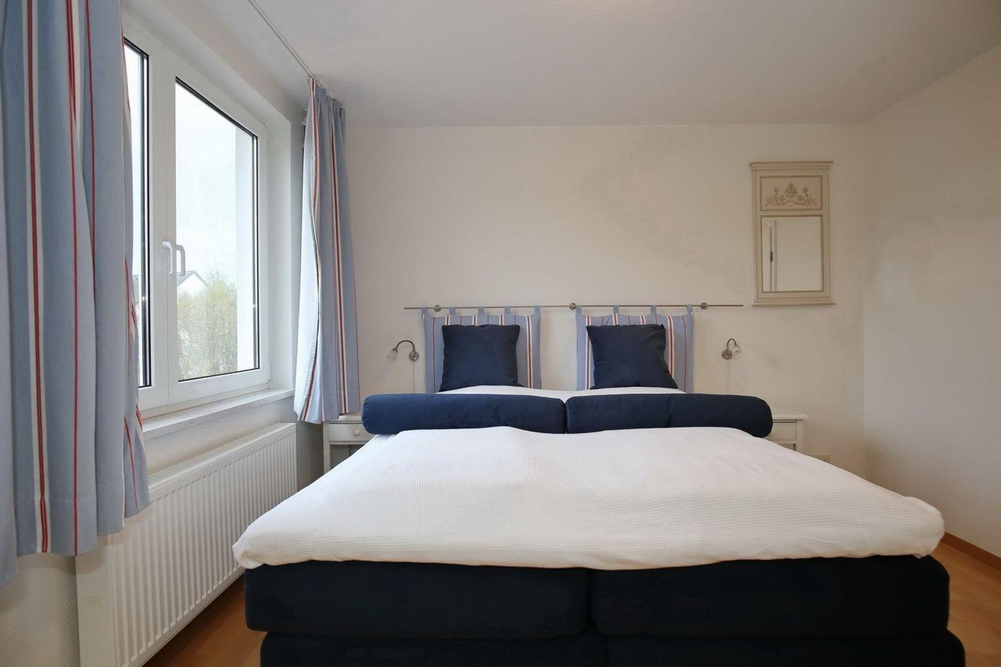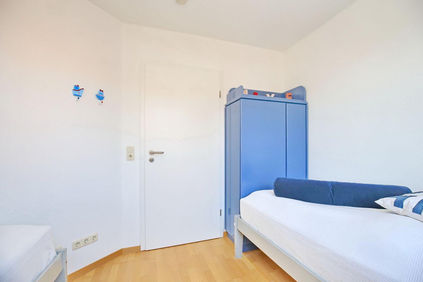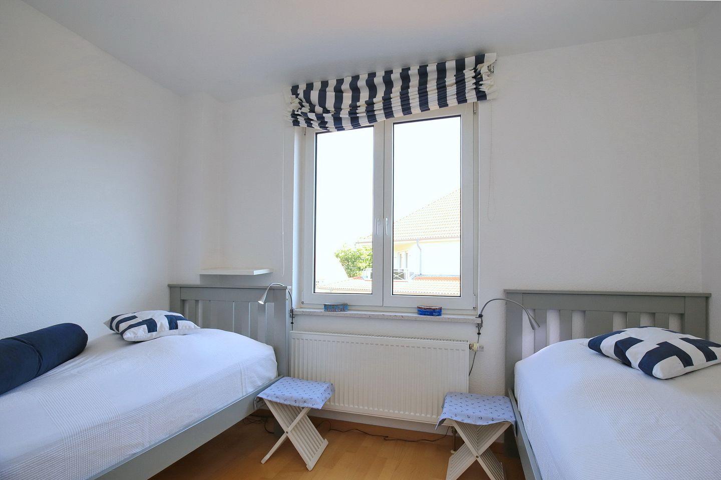 Das erste Schlafzimmer der Ferienwohnung ist mit einem Boxspringbett (2 x 90 x 200 cm) und einem Flachbildfernseher ausgestattet. Es hat einen begehbaren Kleiderschrank, der viel Stauraum bietet. Im zweiten Schlafzimmer befinden sich zwei, auch für Erwachsene geeignete, Einzelbetten (je 90 x 200 cm). Mit Vorhängen kannst du die Räume abdunkeln.
