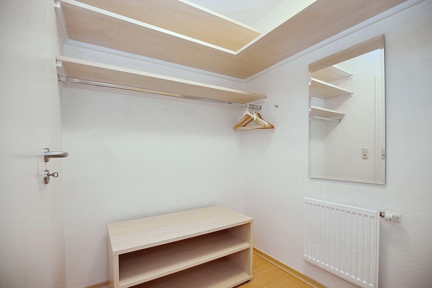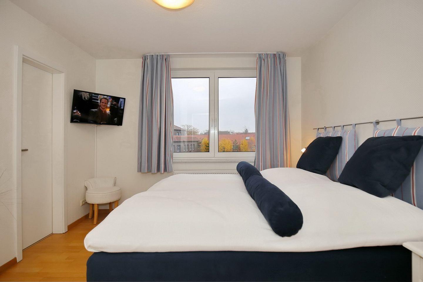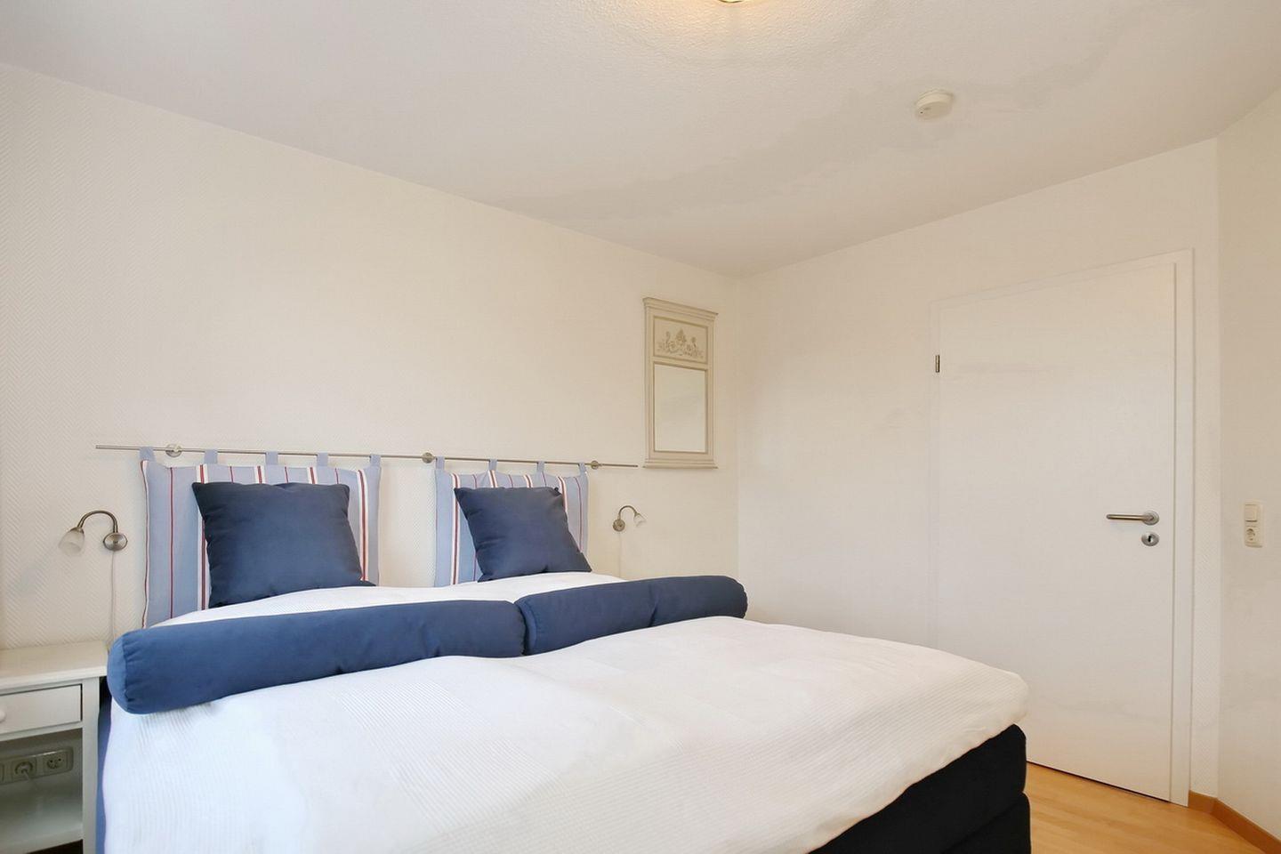 Das erste Schlafzimmer der Ferienwohnung ist mit einem Boxspringbett (2 x 90 x 200 cm) und einem Flachbildfernseher ausgestattet. Es hat einen begehbaren Kleiderschrank, der viel Stauraum bietet. Im zweiten Schlafzimmer befinden sich zwei, auch für Erwachsene geeignete, Einzelbetten (je 90 x 200 cm). Mit Vorhängen kannst du die Räume abdunkeln.