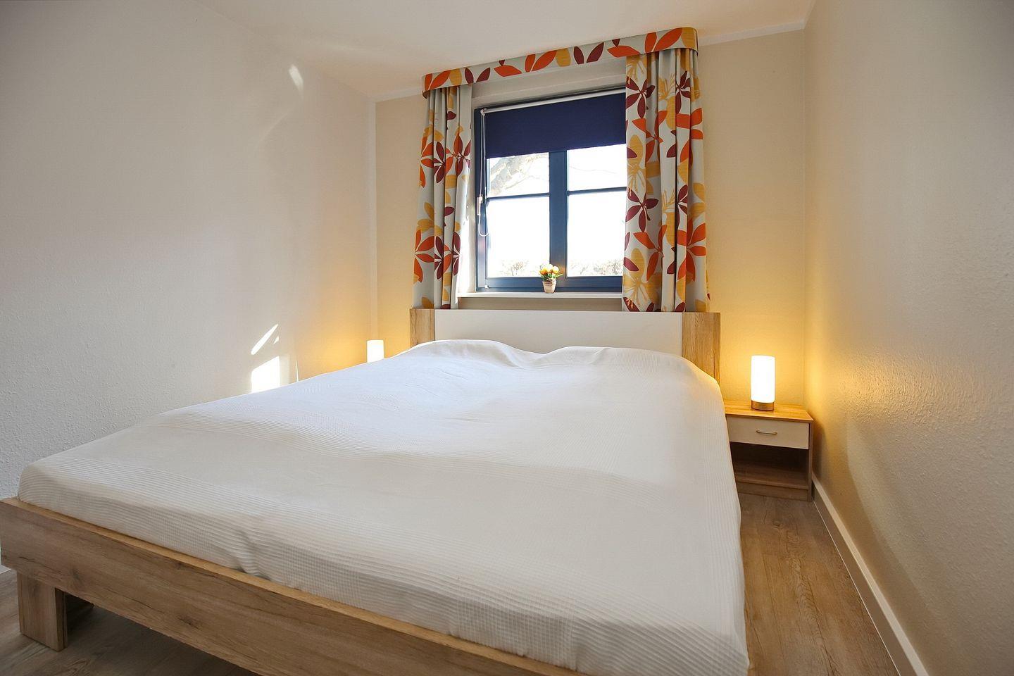 Das Schlafzimmer hat ein Doppelbett mit zwei Einzelmatratzen (90 x 200 cm) und einen geräumigen Kleiderschrank. Ein weiterer Kleiderschrank befindet sich im Eingangsbereich. Zur Verdunklung an den Fenstern dient im Schlafraum ein Rollo.