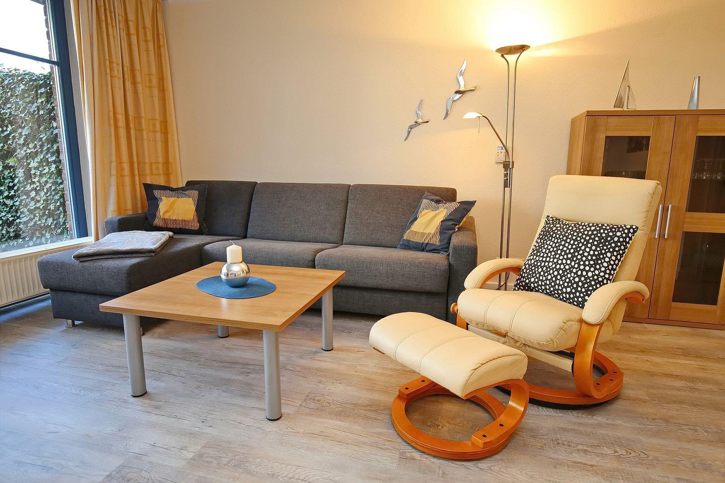 Die möblierte und teilüberdachte Terrasse erreichst du vom Wohnzimmer. Im maritim eingerichteten Wohnbereich laden eine gemütliche Schlafcouch (160 x 190 cm) und eine Essecke zum Verweilen ein. Für dein Wohlbefinden sorgen ebenfalls ein Flachbild-TV, eine Stereoanlage und eine Auswahl an Spielen.