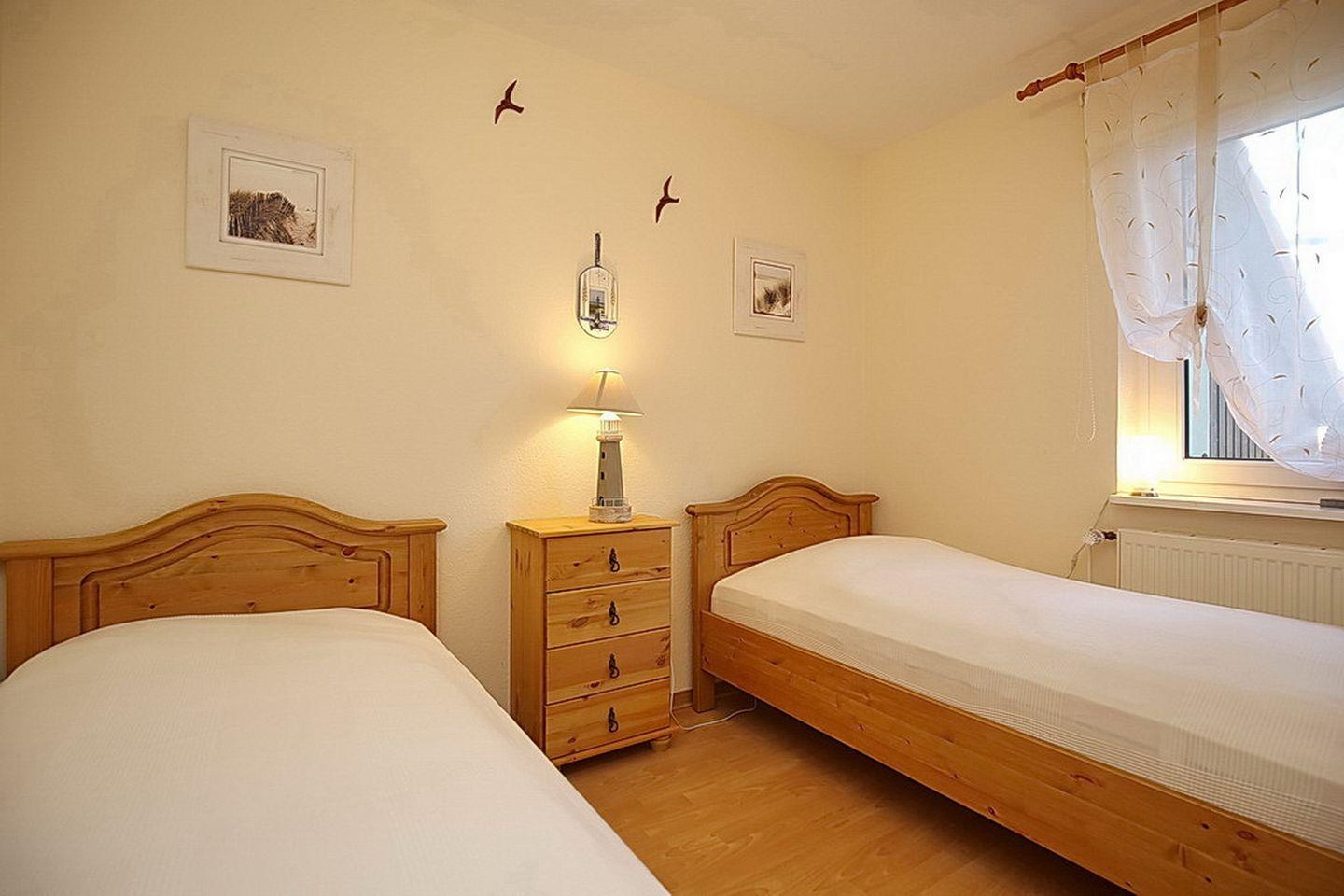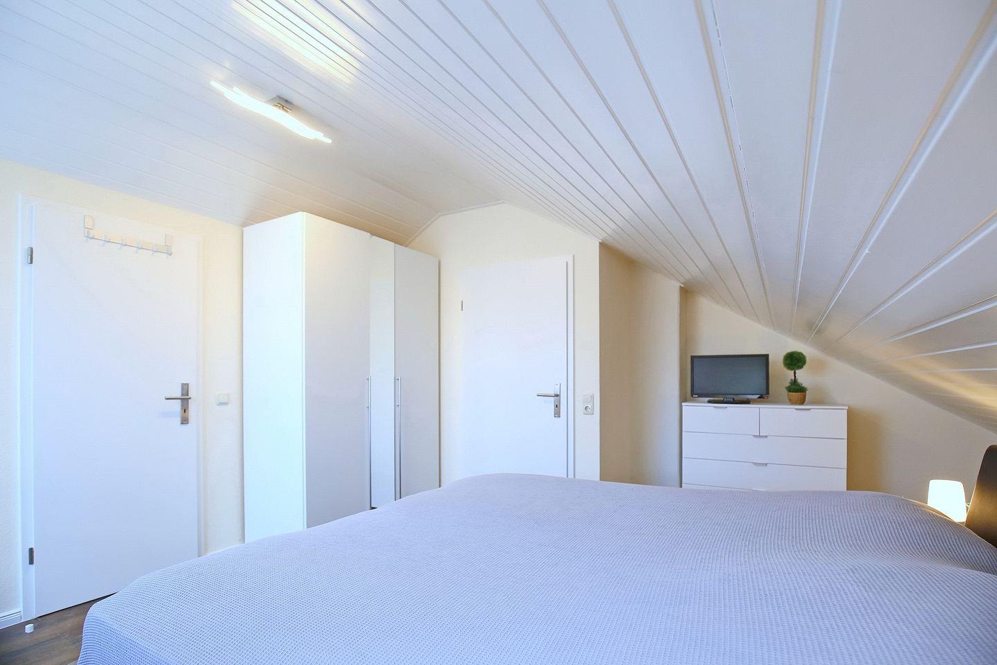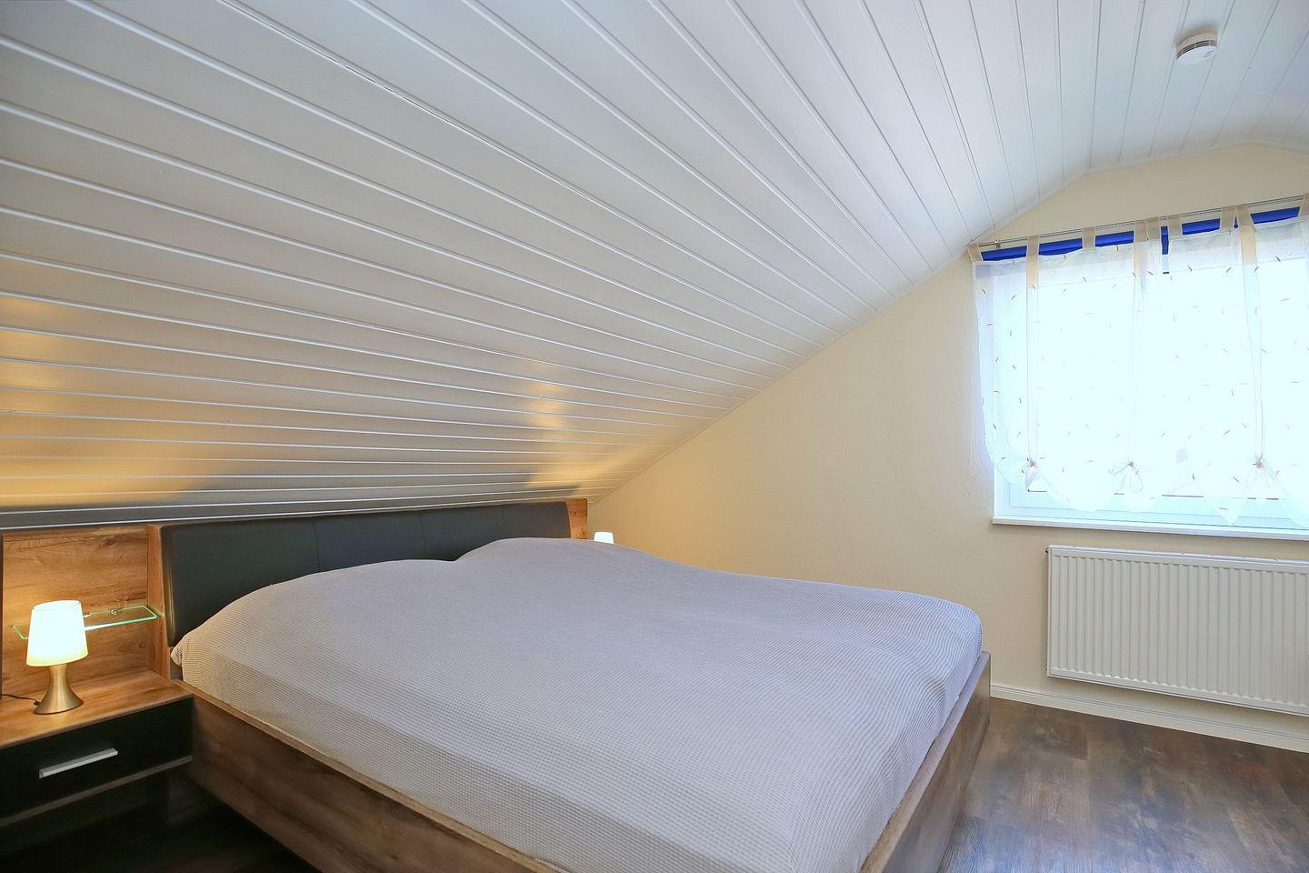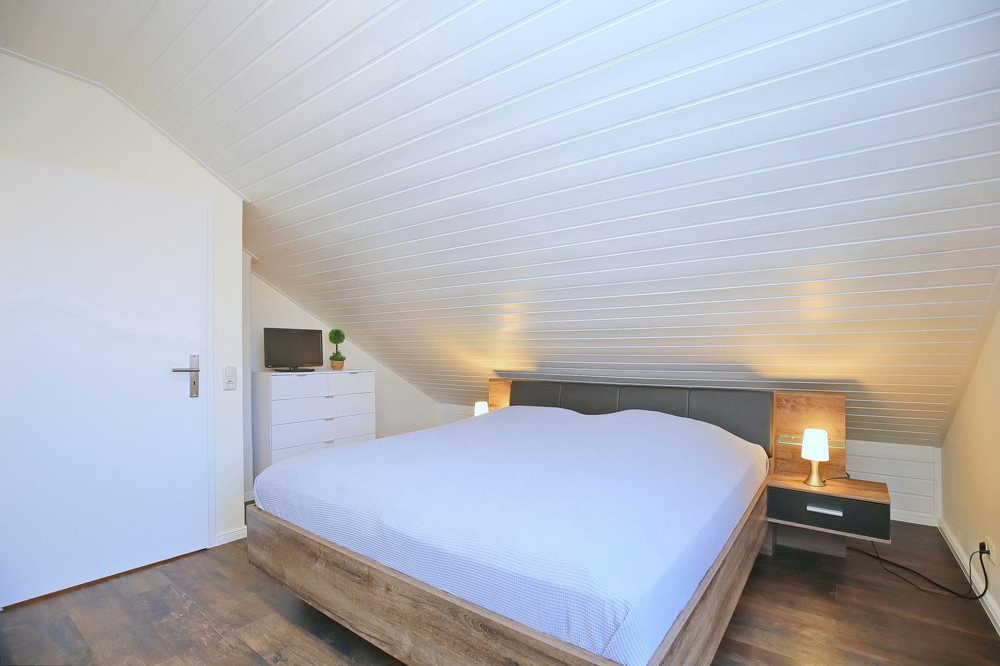Als Schlafgelegenheiten stehen in dem Schlafzimmer im Obergeschoss ein Doppelbett (2 x 90 x 200 cm) und in dem Schlafzimmer im Erdgeschoss zwei Einzelbetten. Des Weiteren steht ein zweiter Fernseher im oberen Schlafzimmer zur Verfügung.