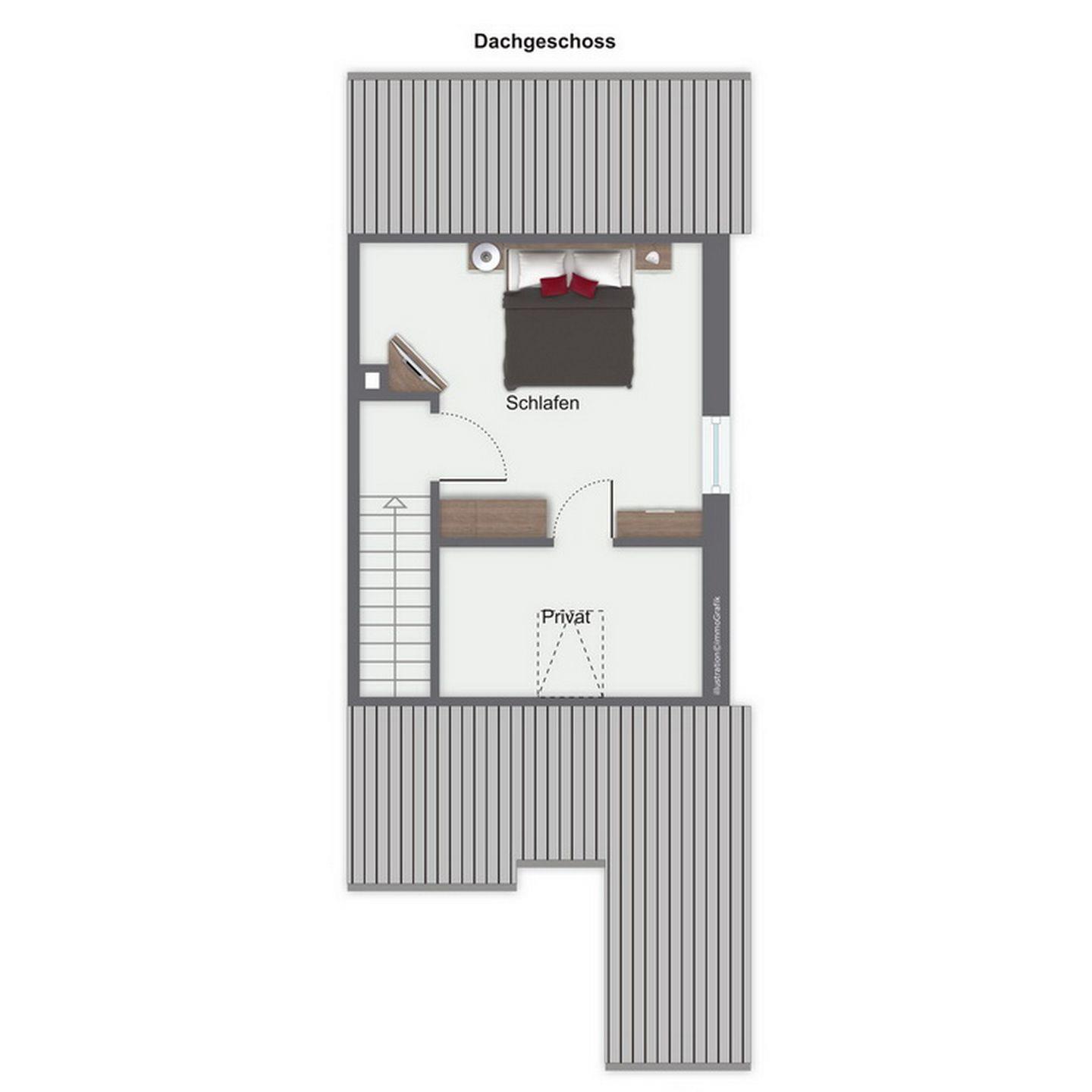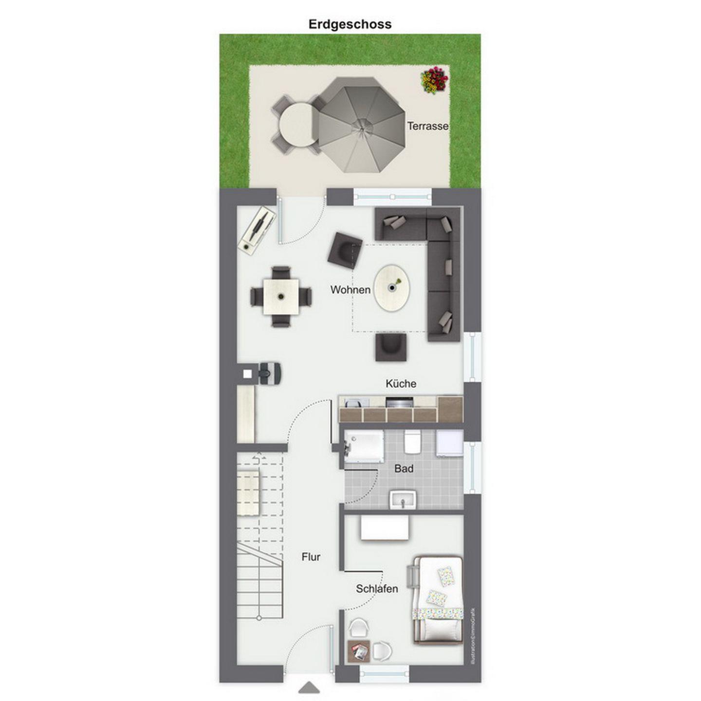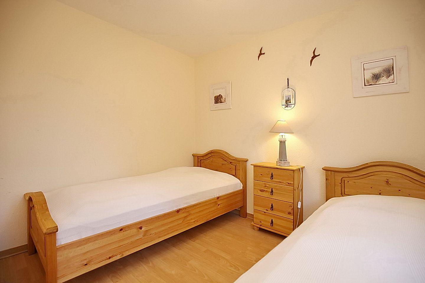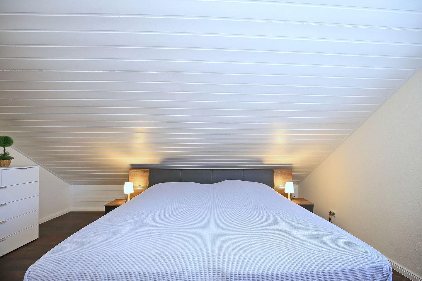 Als Schlafgelegenheiten stehen in dem Schlafzimmer im Obergeschoss ein Doppelbett (2 x 90 x 200 cm) und in dem Schlafzimmer im Erdgeschoss zwei Einzelbetten. Des Weiteren steht ein zweiter Fernseher im oberen Schlafzimmer zur Verfügung.