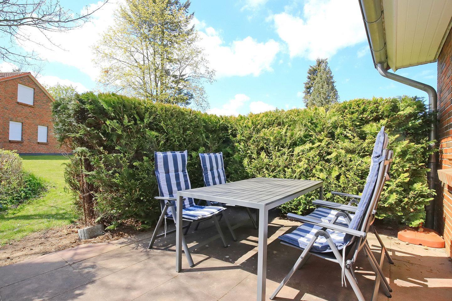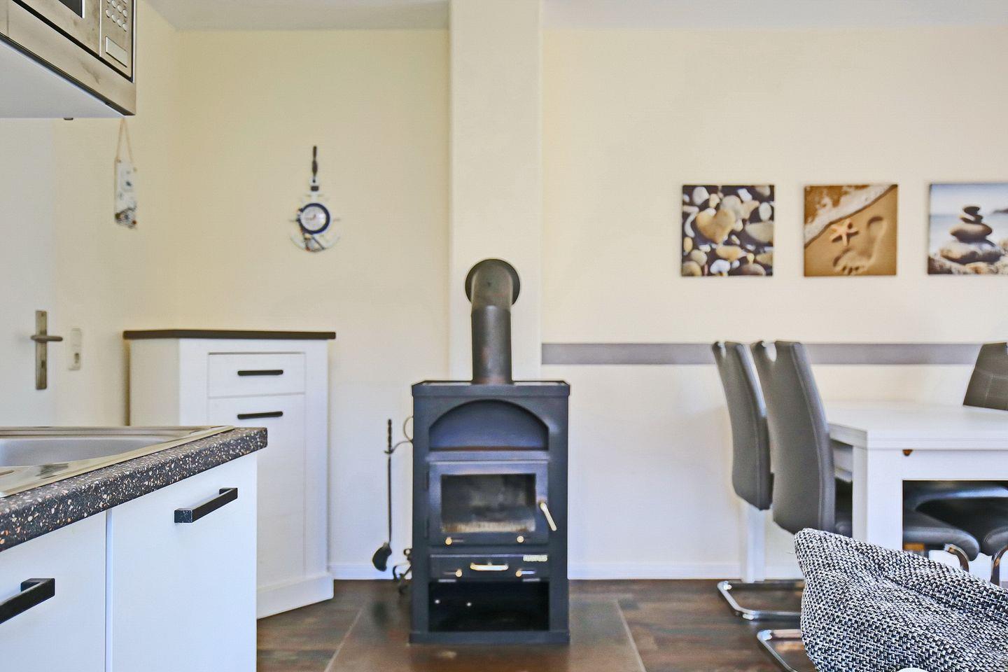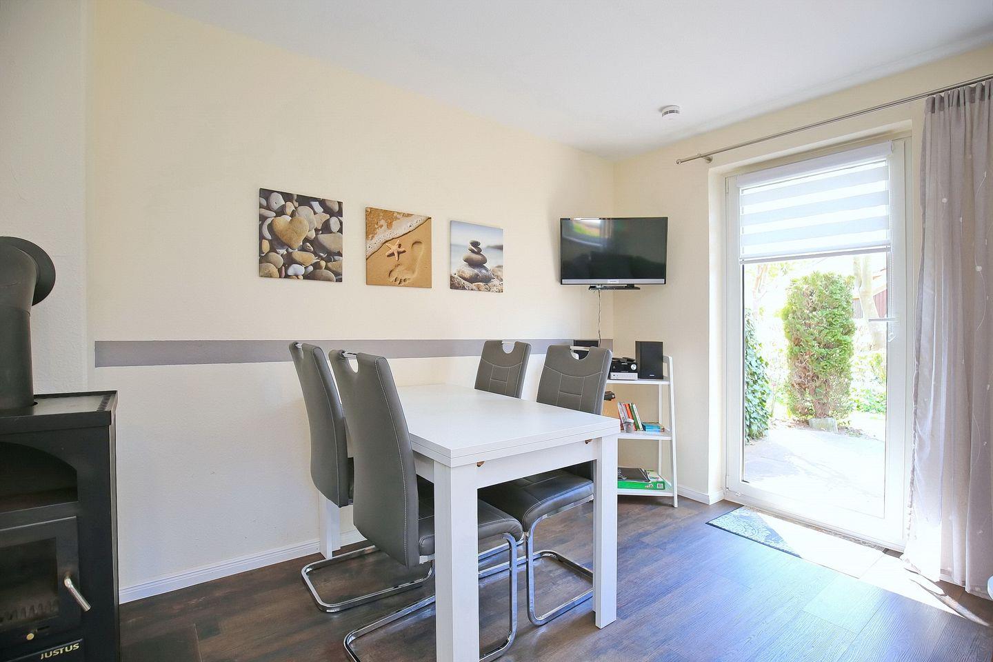 Im Wohnzimmer lädt eine gemütliche Eckgarnitur zum Ausruhen ein. Ein Flachbild-TV und eine kleine Stereoanlage mit CD-Player bieten umfangreiche Abwechslung. In den kälteren Monaten sorgt der Kamin für Behaglichkeit und Wärme. Das Ferienhaus verfügt über eine schöne süd-westlich ausgerichtete Terrasse, die vom Wohnzimmer aus betretbar ist. Selbstverständlich findest du bequeme Gartenstühle mit Auflagen vor. Du findest hier den idealen Platz für die Entspannung in freier Natur.
