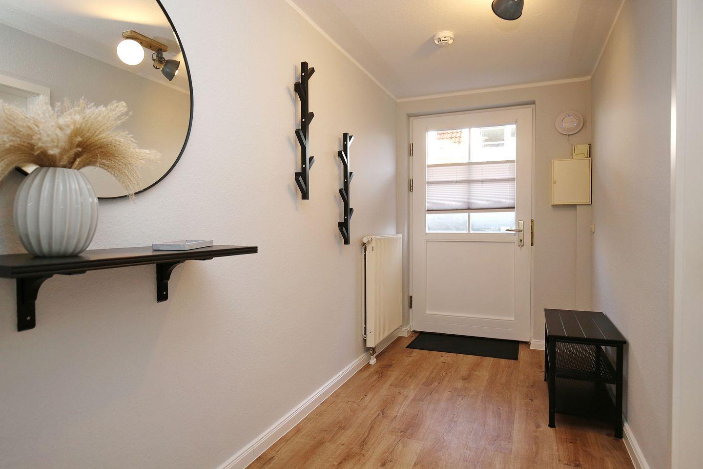 Die Küchenzeile ist ausgestattet mit einem Geschirrspüler, 4-Platten-Kochfeld, Backofen und einem Kühlschrank mit Gefrierfach. Im gesamten Wohn- und Schlafbereich ist ein hochwertiger Designbelag ausgelegt.