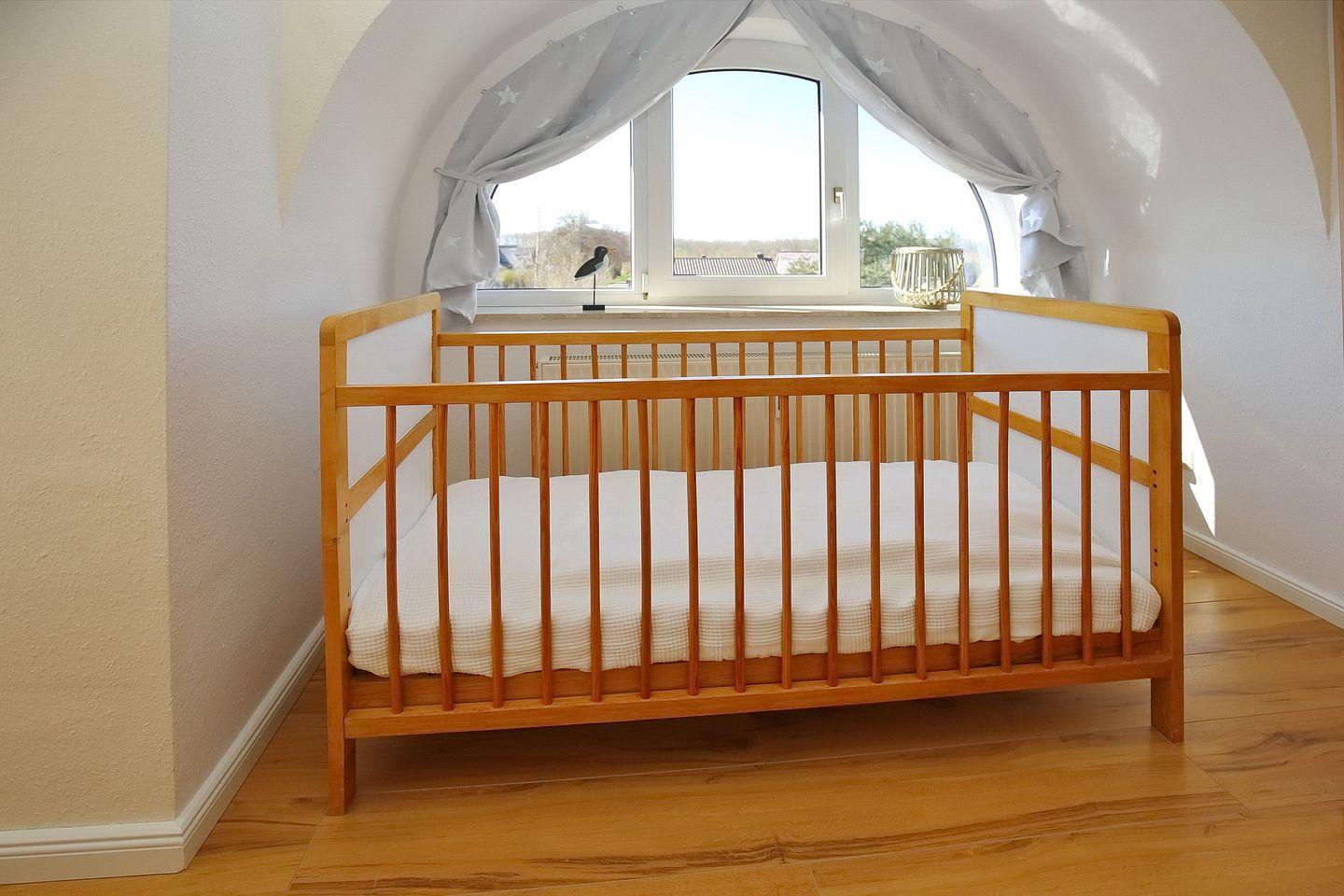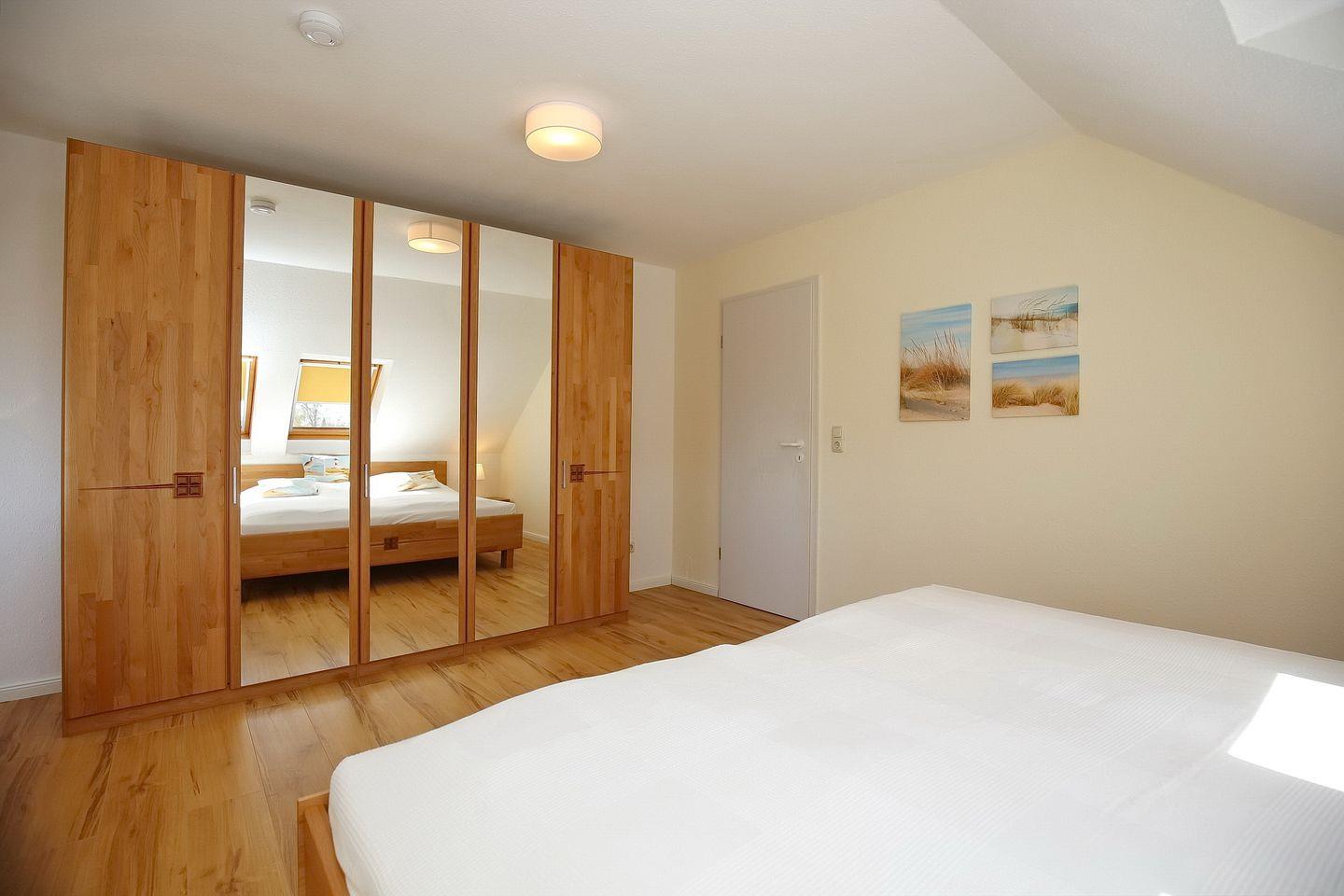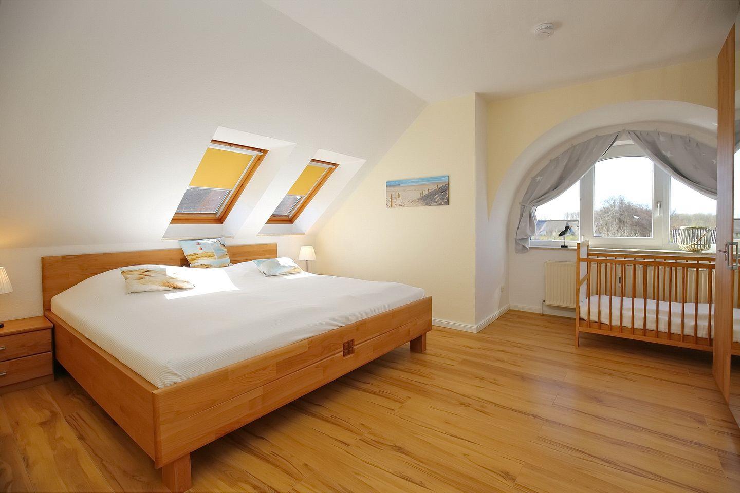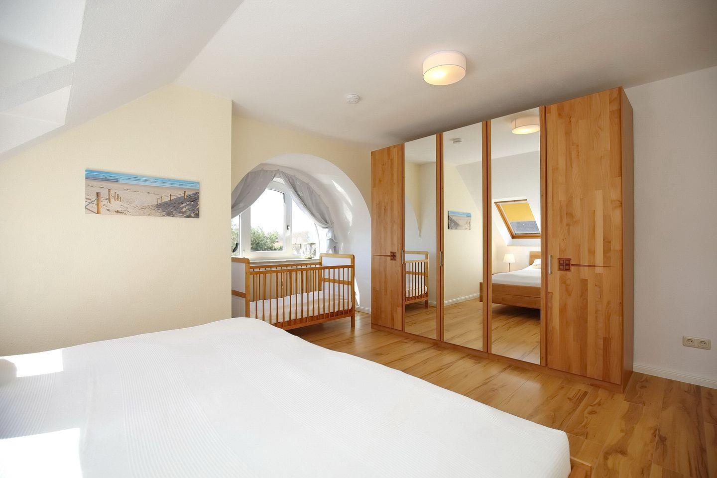 Das Schlafzimmer verfügt über ein großes Doppelbett (2 x 100 x 200 cm) und einen Kleiderschrank mit viel Stauraum für deine Urlaubsgarderobe. Ein Hochstuhl sowie ein festes Kinderbett stehen für deine kleinen Gäste ebenfalls zur Verfügung.