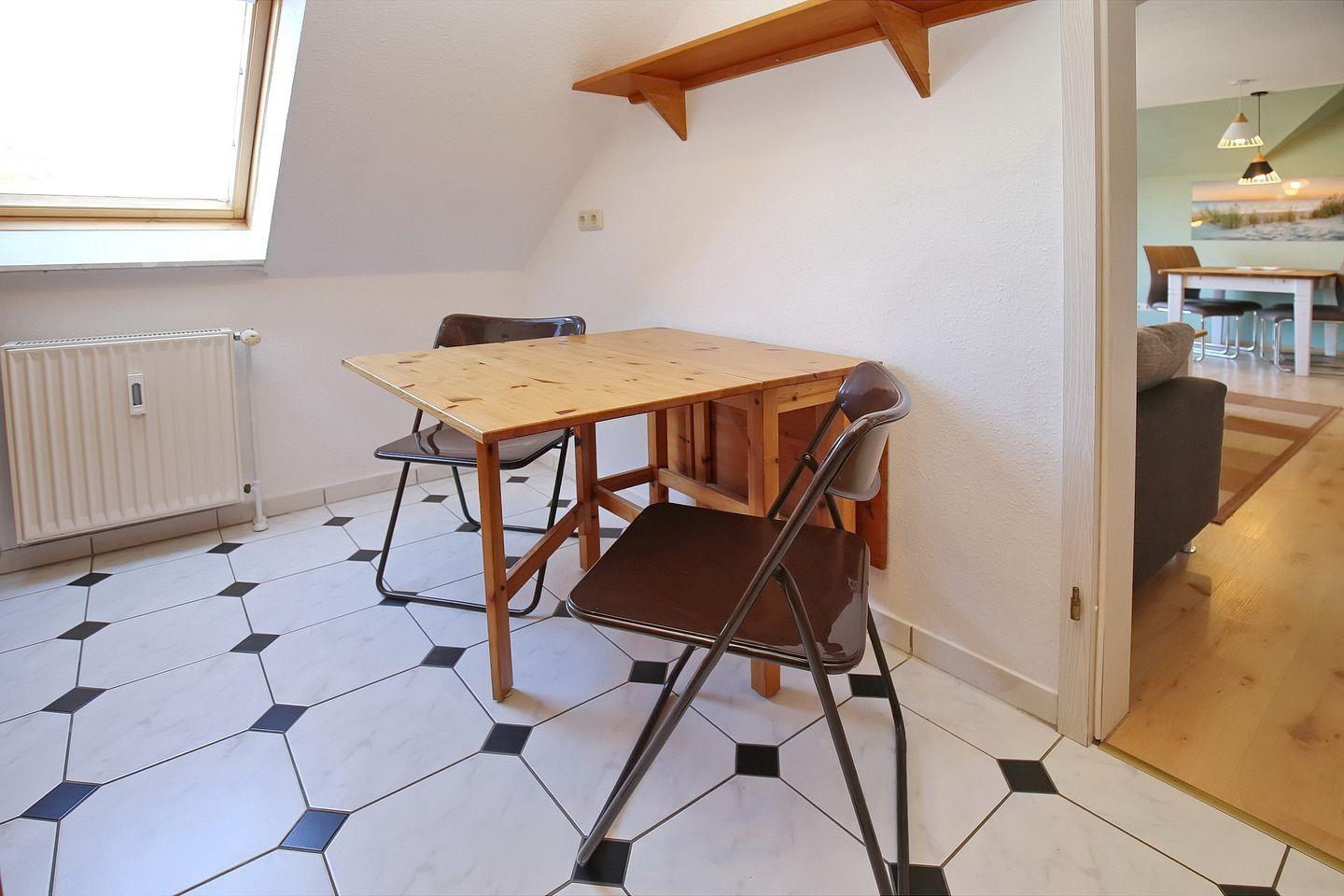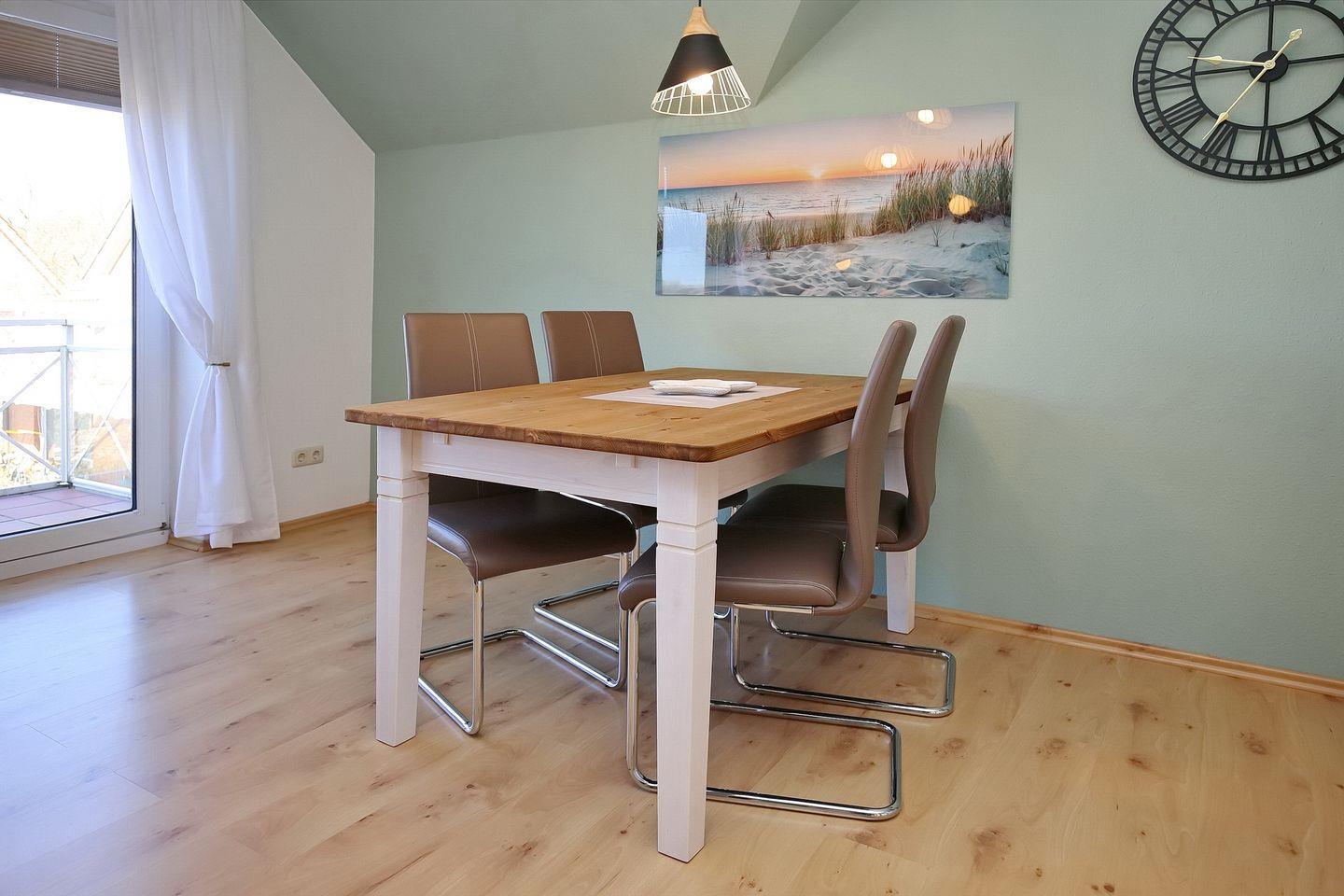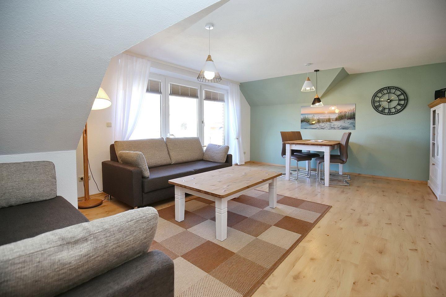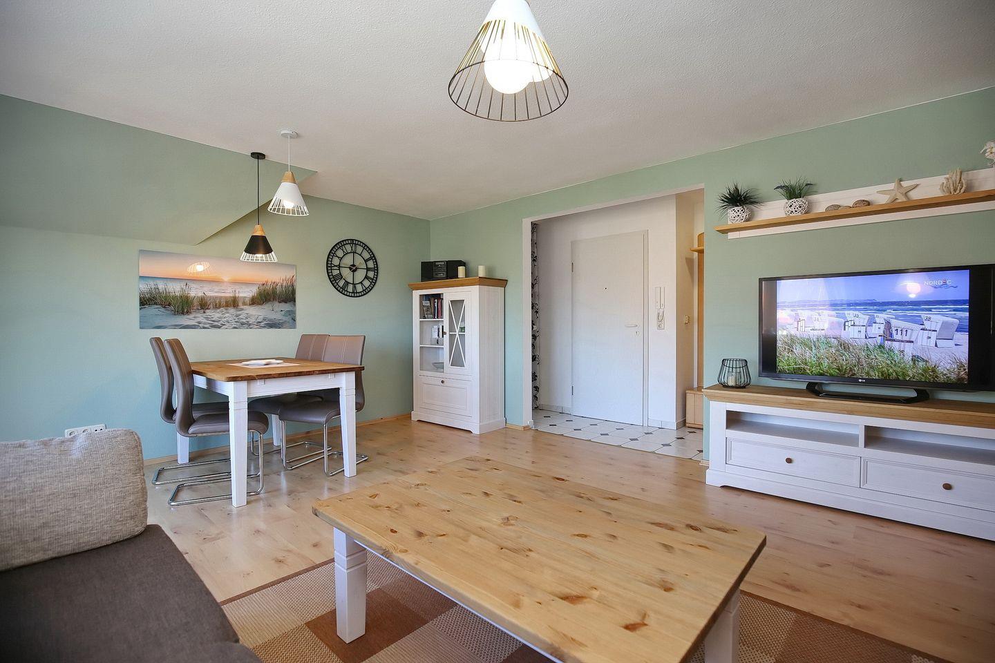 Das Wohnzimmer ist hell und modern eingerichtet. Auf der gemütlichen Couch könnt ihr abends herrlich zusammensitzen und den schönen Strandtag Revue passieren lassen. Es stehen dir ein Flachbild-TV und ein DVD-Player zur Verfügung. Zusätzlich lassen zahlreiche Bücher keine Langeweile aufkommen. Die Couch kann durch Ausklappen in einen Komfortschlafplatz für zwei Personen verwandelt werden. Der moderne Esstisch am hellen Balkonfenster bietet den idealen Platz für gemeinsame Mahlzeiten.