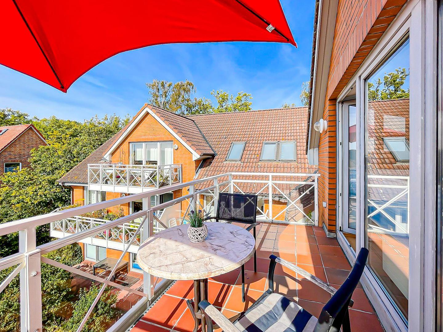 Deine Ferienwohnung befindet sich im 2. Obergeschoss und hat eine Größe von 56 m². Hier findest du ein Wohnzimmer mit Zugang zum Süd-West-Balkon, ein Schlafzimmer, eine separate Küche sowie das Duschbad vor. Die Entfernung zum Strand beträgt ca. 200 m.