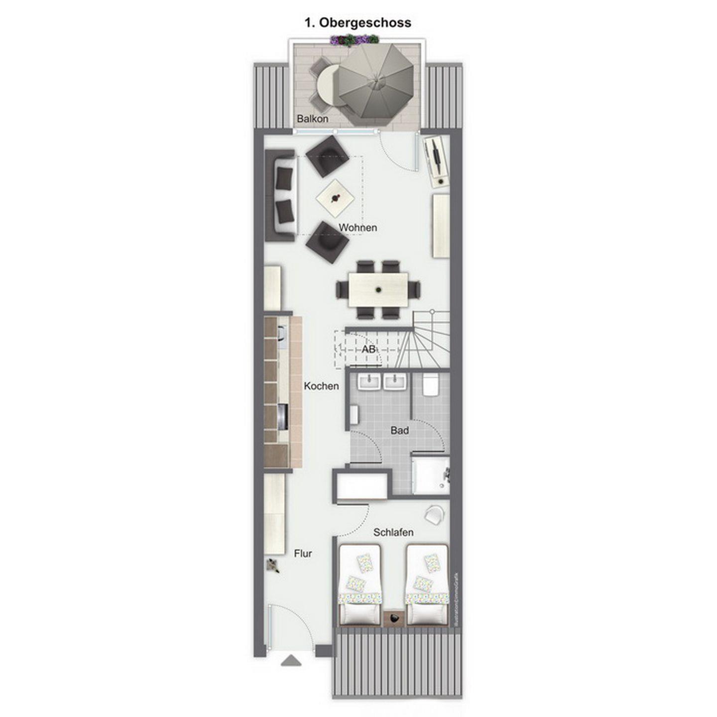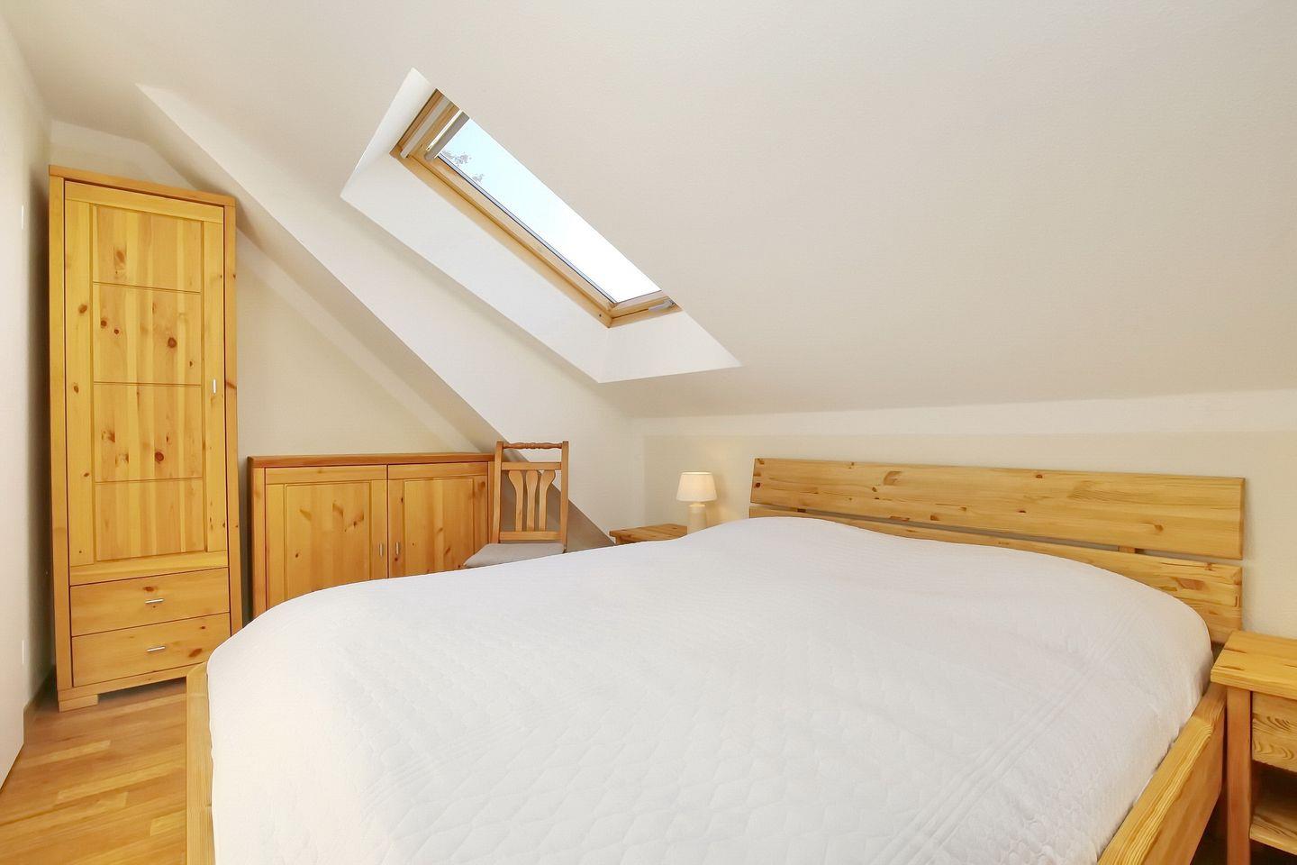 Die Küchenzeile ist mit einem Geschirrspüler, einem Backofen, einem 4-Plattenherd und einem Kühlschrank mit Gefrierfach praktisch ausgestattet. Über eine innenliegende Treppe erreichst du die beiden Schlafzimmer im Dachgeschoss. In einem großen Kleiderschrank auf dem Flur kannst du deine Garderobe aufbewahren. Im gesamten unteren Wohnbereich wurde Laminat verlegt.