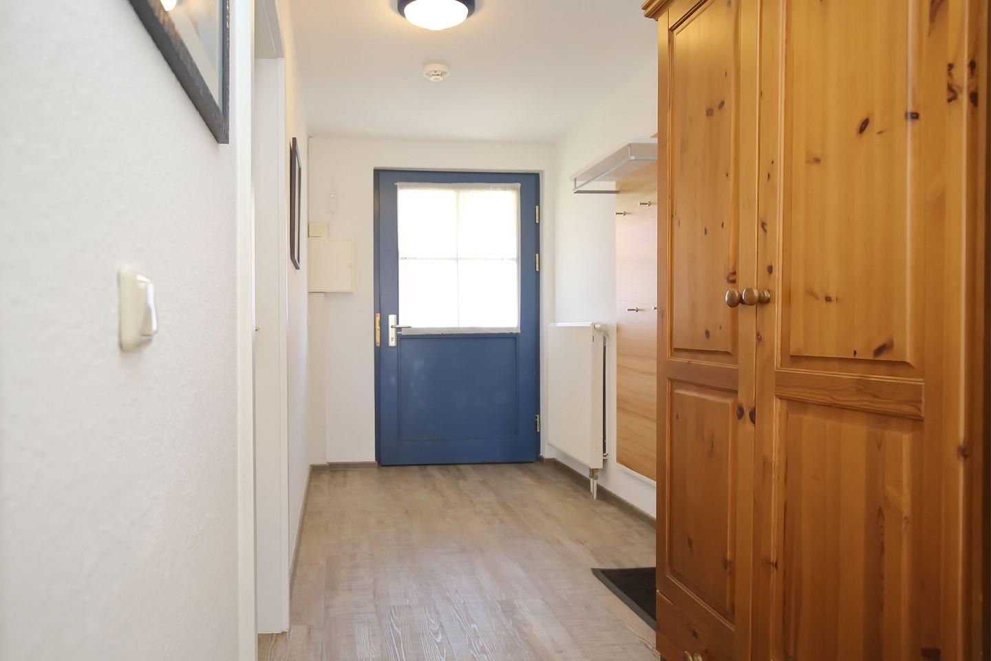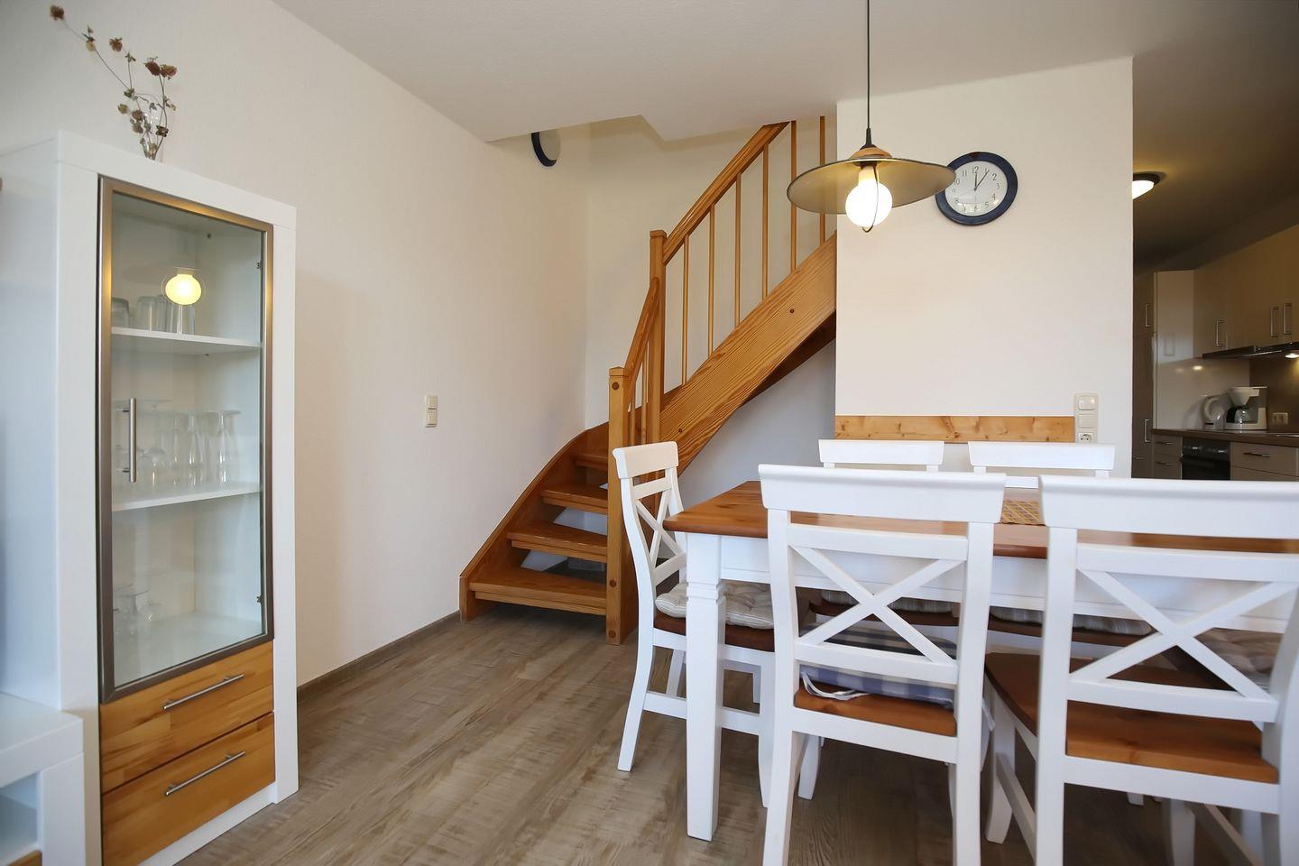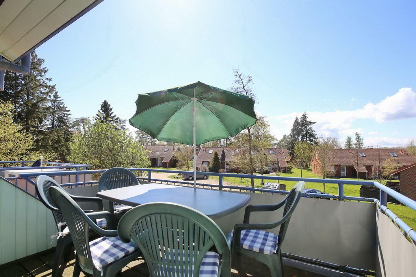 In dieser 4-Zimmer-Ferienwohnung im 1. OG. mit Balkon in Süd-West-Lage findest du eine gemütliche Unterkunft für bis zu sechs Personen. Die ca. 70 m² Wohnung erreichst du über die Außentreppe. Dir stehen über zwei Etagen ein Wohn- und Essbereich, drei Schlafräume, eine Küchenzeile und ein Duschbad zur Verfügung. Die Entfernung zum Strand beträgt vom Feriendorf Papillon nur etwa 250 m.