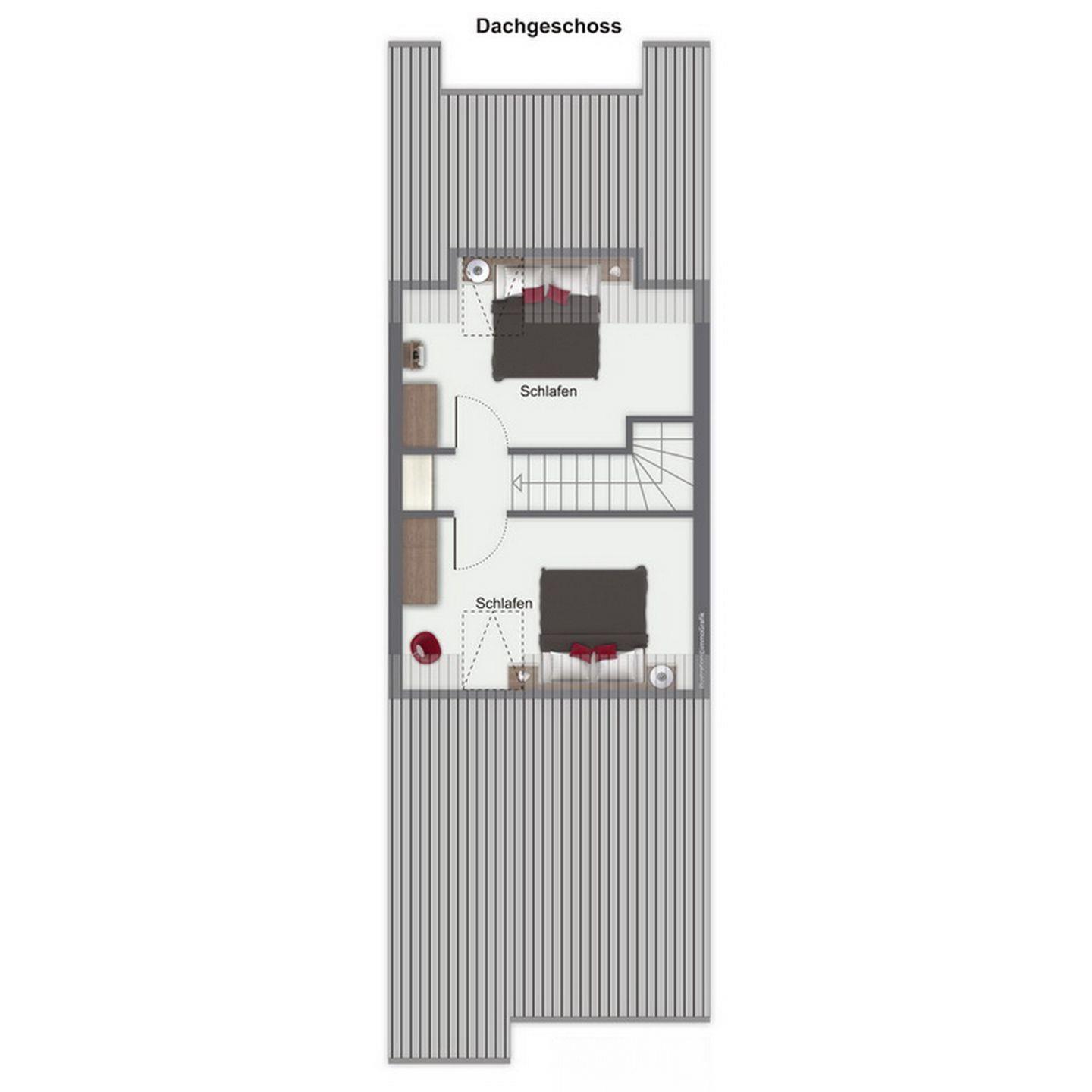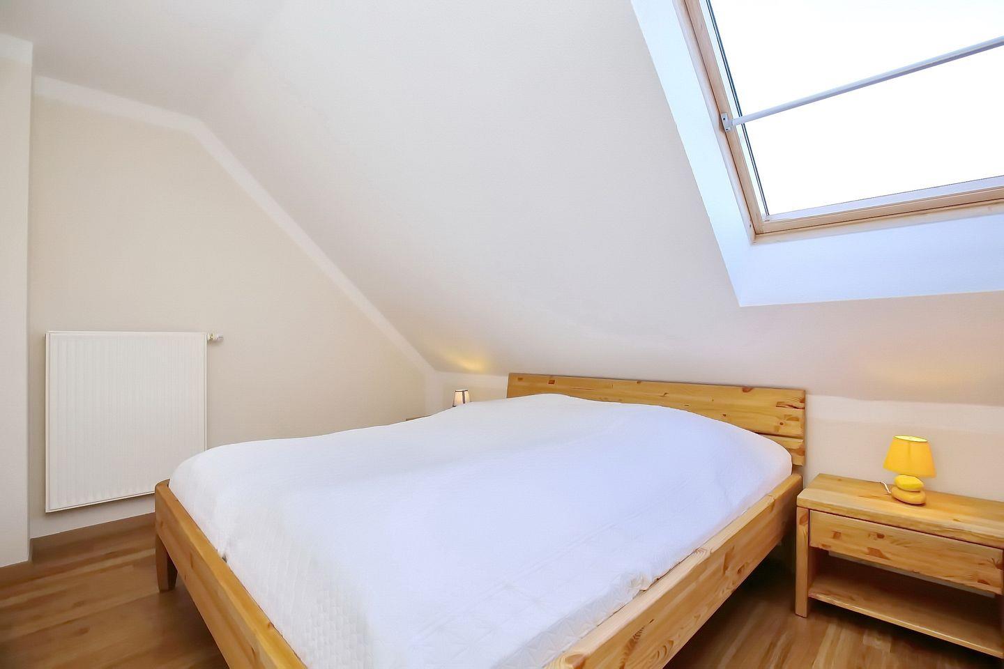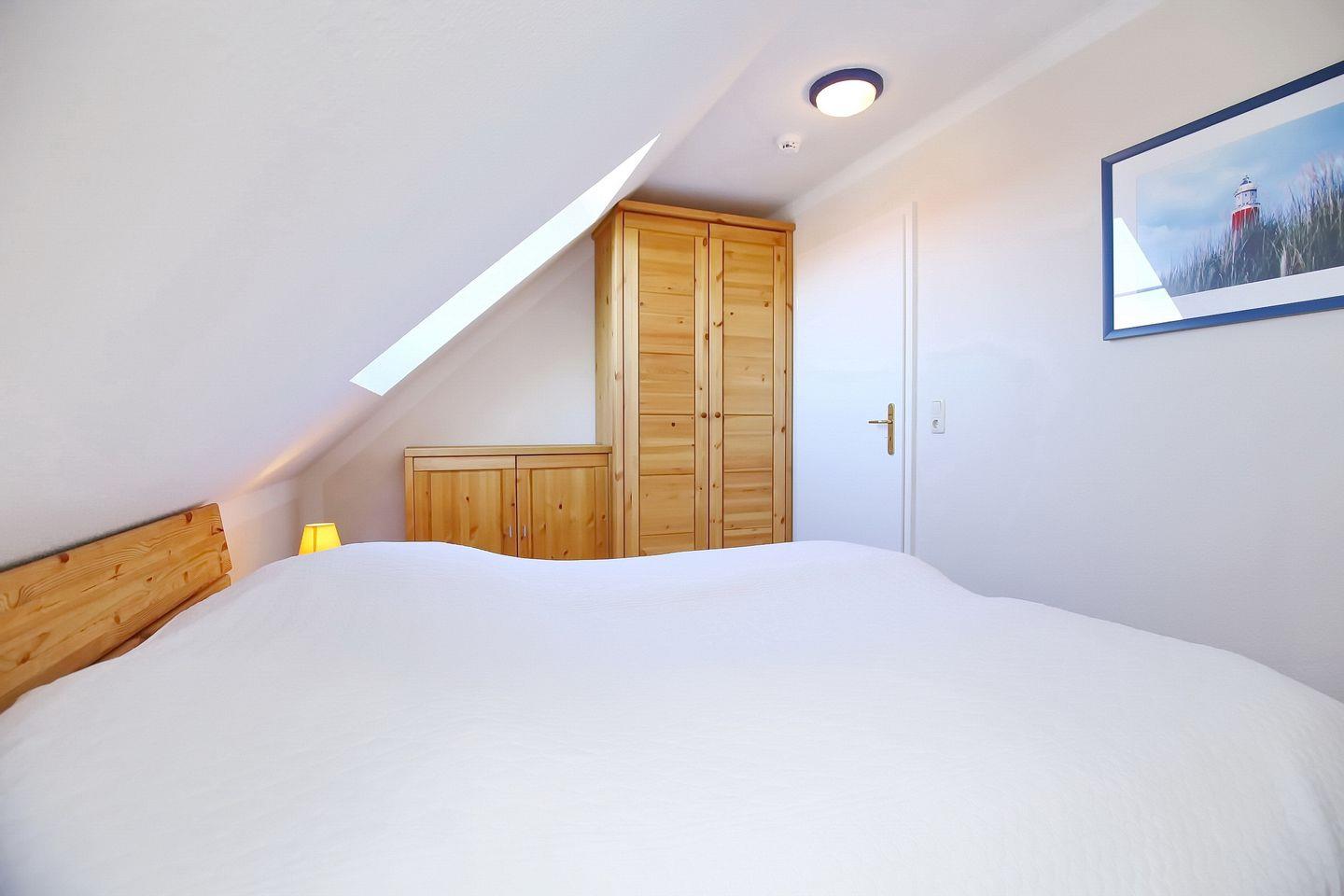 Im Schlafzimmer im 1. OG findest du neben zwei Einzelbetten (2 x 90 x 200 cm) auch einen Kleiderschrank vor. Die beiden Schlafzimmer im Obergeschoss sind mit jeweils einem Doppelbett (2 x 90 x 200 cm und 2 x 80 x 200 cm) und einem Kleiderschrank ausgestattet. Die Fenster werden durch Rollos verdunkelt. In den Zimmern ist Laminat verlegt.
