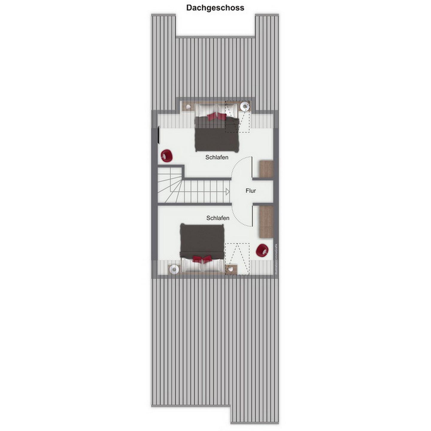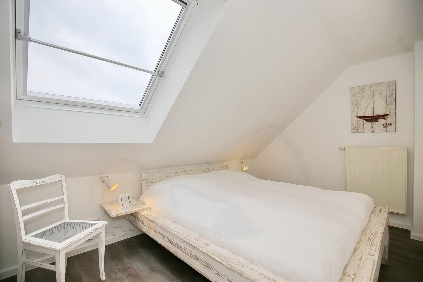 Im Schlafzimmer im 1. OG findest du neben zwei Einzelbetten (2 x 90 x 200 cm) auch einen Kleiderschrank. Ein Verdunklungsrollo sorgt für erholsamen Schlaf. In den beiden Schlafzimmern im Obergeschoss befinden sich jeweils ein Doppelbett (2 x 90 x 200 cm und 2 x 80 x 200 cm) und ein Kleiderschrank. Die Fenster werden durch Rollos verdunkelt.