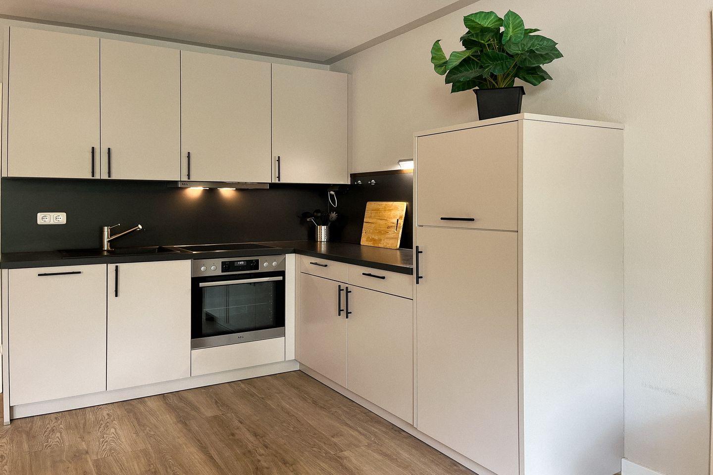 Die erneuerte Einbauküche ist unter anderem mit 4-Platten-Cerankochfeld, Backofen, Kühlschrank mit Tiefkühlfach, Mikrowelle und Geschirrspülmaschine ausgestattet. Ein gemütlicher Essplatz ist im Wohnbereich integriert. Ein gefliestes Duschbad ist vorhanden.