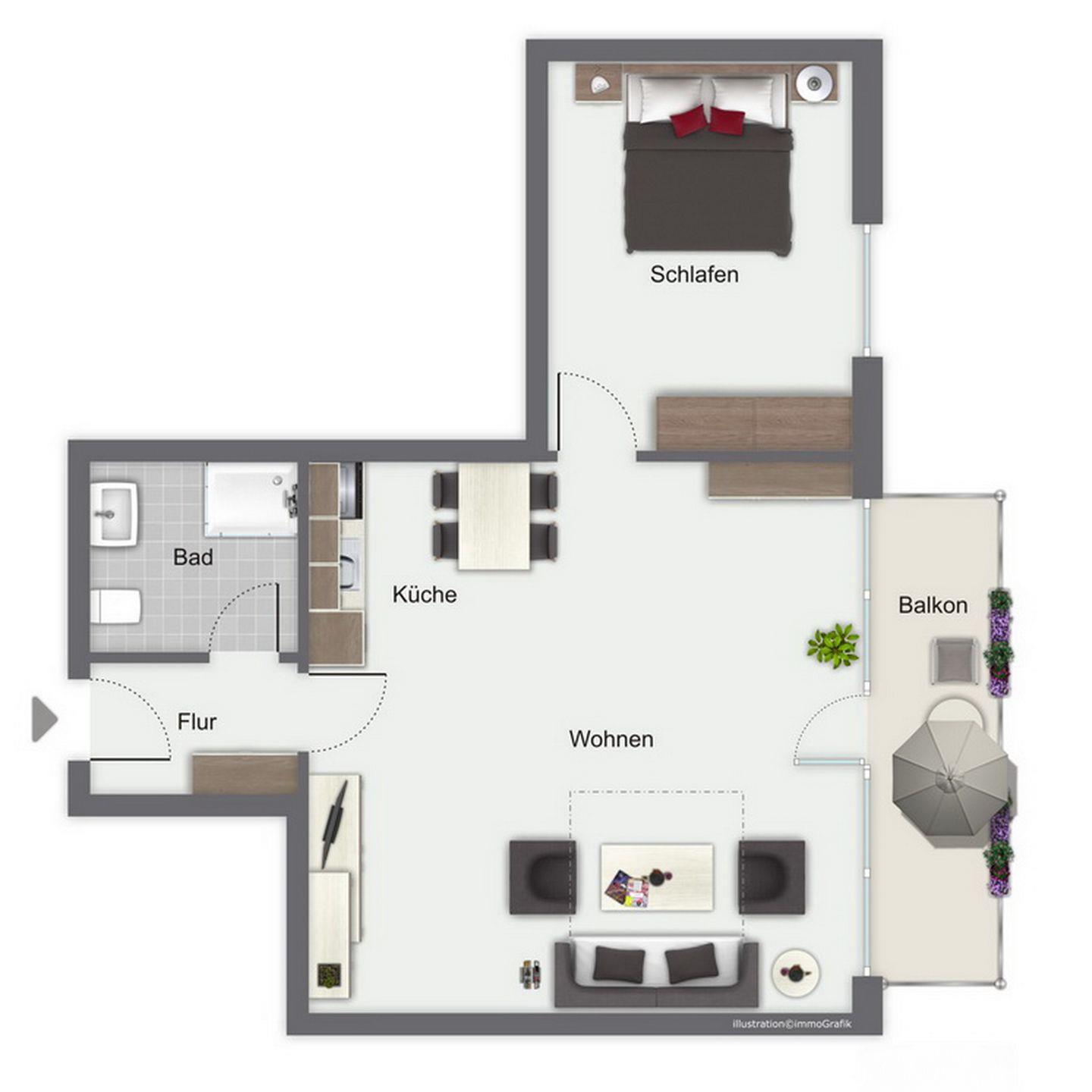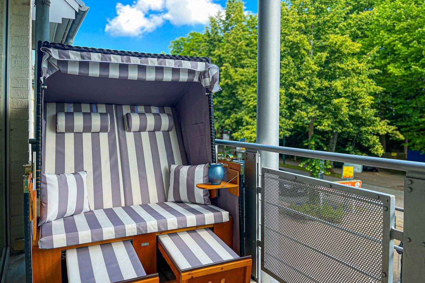 Im 1. Obergeschoss gelegen, ca. 60 m² groß, verfügst du über einen großen Balkon in Richtung Seeseite, ein Wohnzimmer mit Küchenzeile, ein Schlafzimmer sowie ein Duschbad. Zum Strand sind es nur ca. 100 m.