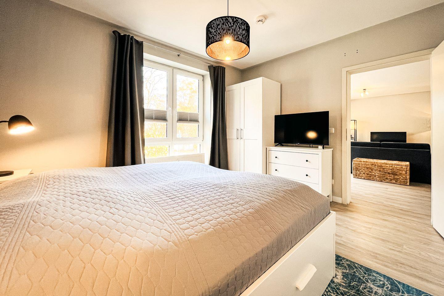 Das Schlafzimmer verfügt über ein großes, komfortables Doppelbett (2 x 90 x 200 cm) und einen Kleiderschrank. Der Boden des Schlafzimmers ist mit Parkett ausgelegt. Die Fenster können verdunkelt werden. Hier steht dir auch ein 2. TV zur Verfügung.