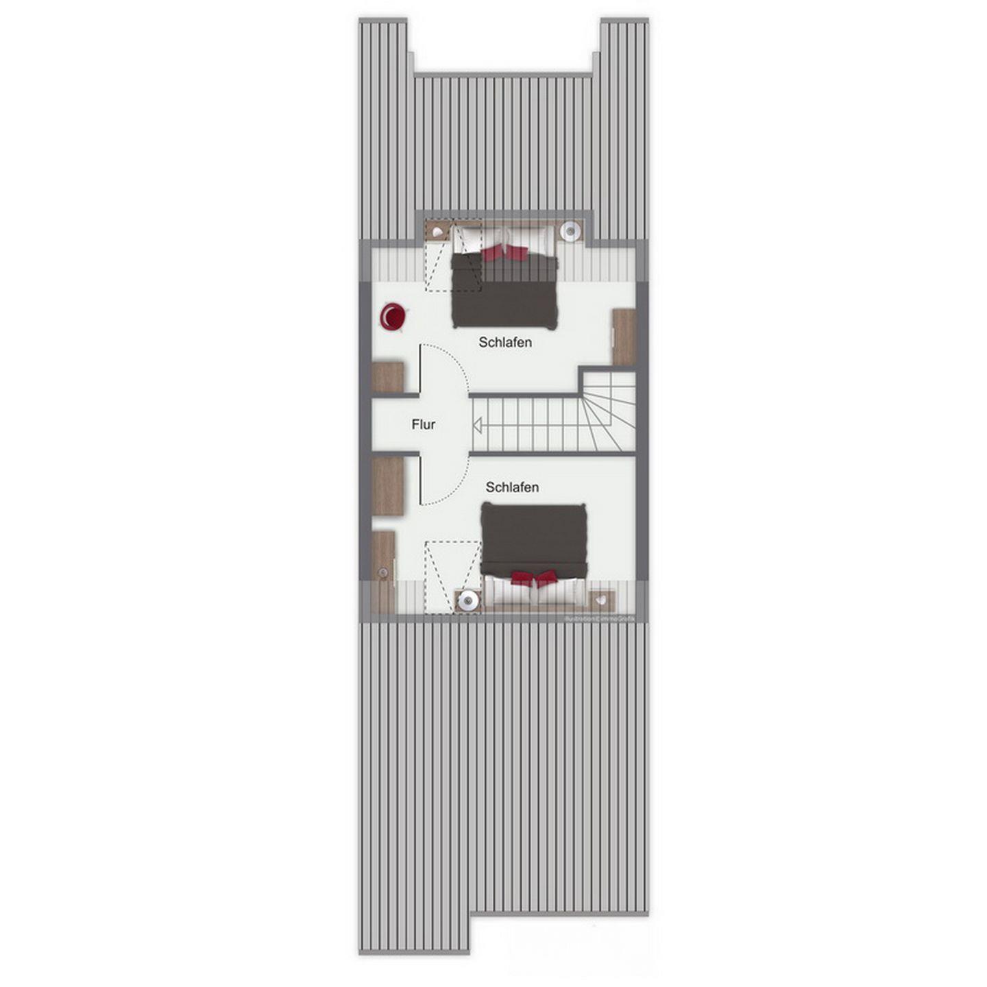 Hier findest du zwei Schlafzimmer mit zwei Doppelbetten (2 x 90 x 200 cm) und zwei Kleiderschränken. Im ersten Obergeschoss liegt ein weiteres Schlafzimmer mit zwei Einzelbetten (90 x 200 cm). Rollos in allen Schlafzimmern dienen als Verdunklungsmöglichkeit. Die gesamte Wohnung ist mit Teppichboden ausgelegt.