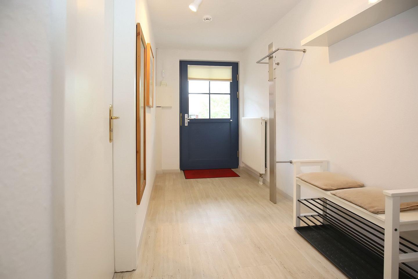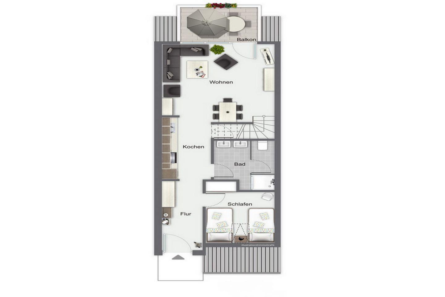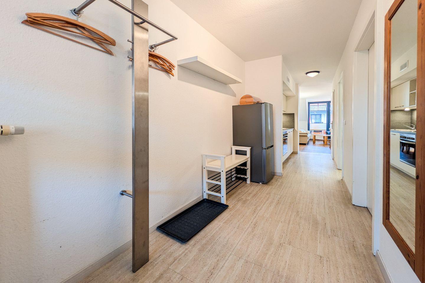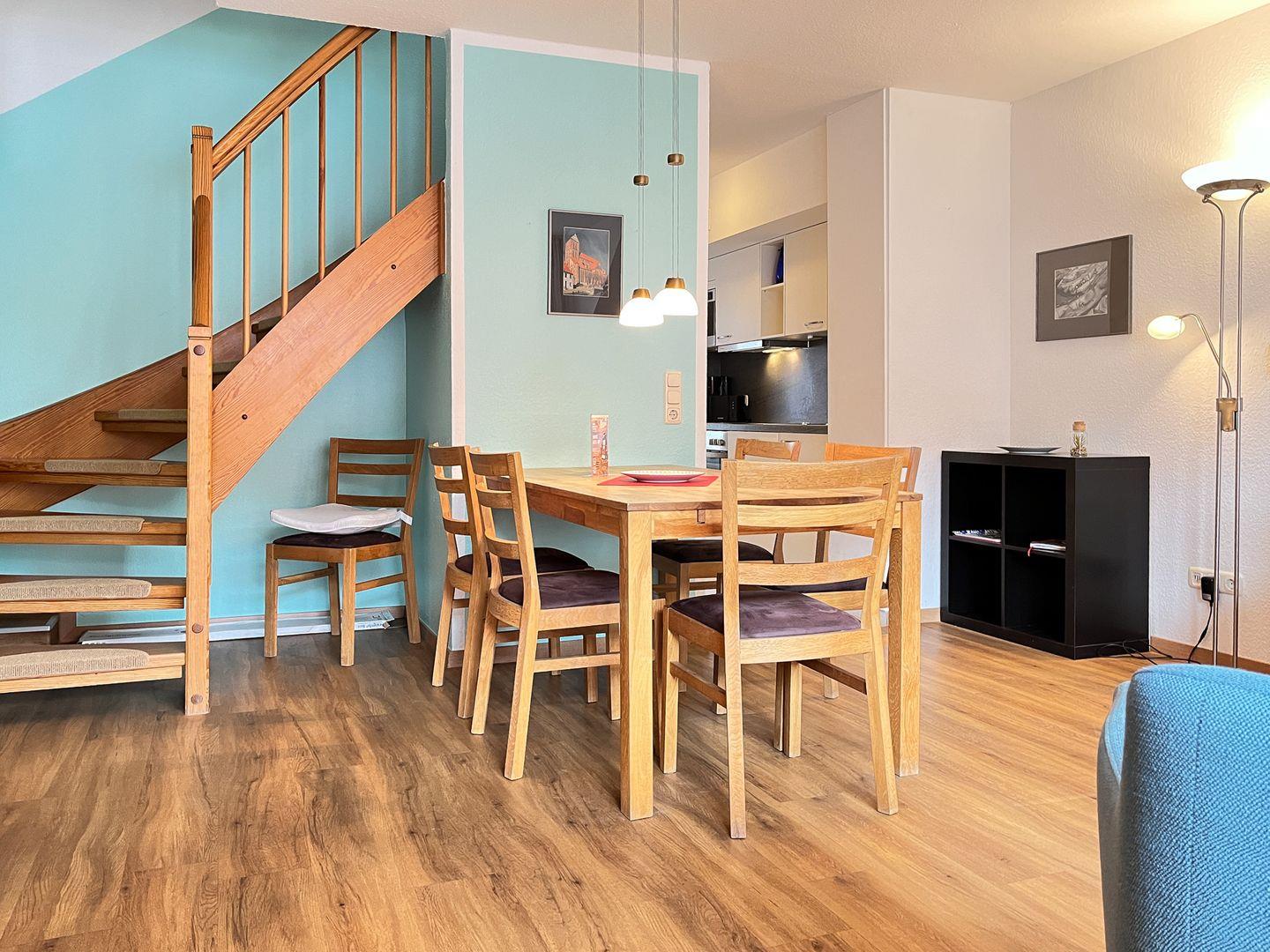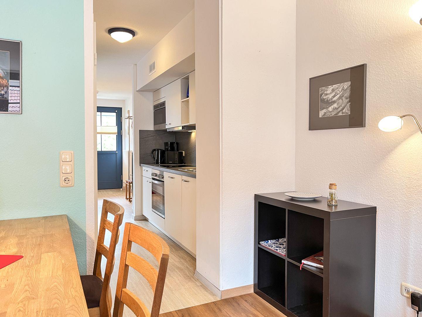 In der Küchenzeile befinden sich ein Geschirrspüler, ein 4-Plattenkochfeld, ein Backofen und ein Kühlschrank mit Gefrierfach. Als möglicher Stauraum dient der Schrank im Eingangsbereich. Über eine innenliegende Treppe erreichst du das Dachgeschoss.