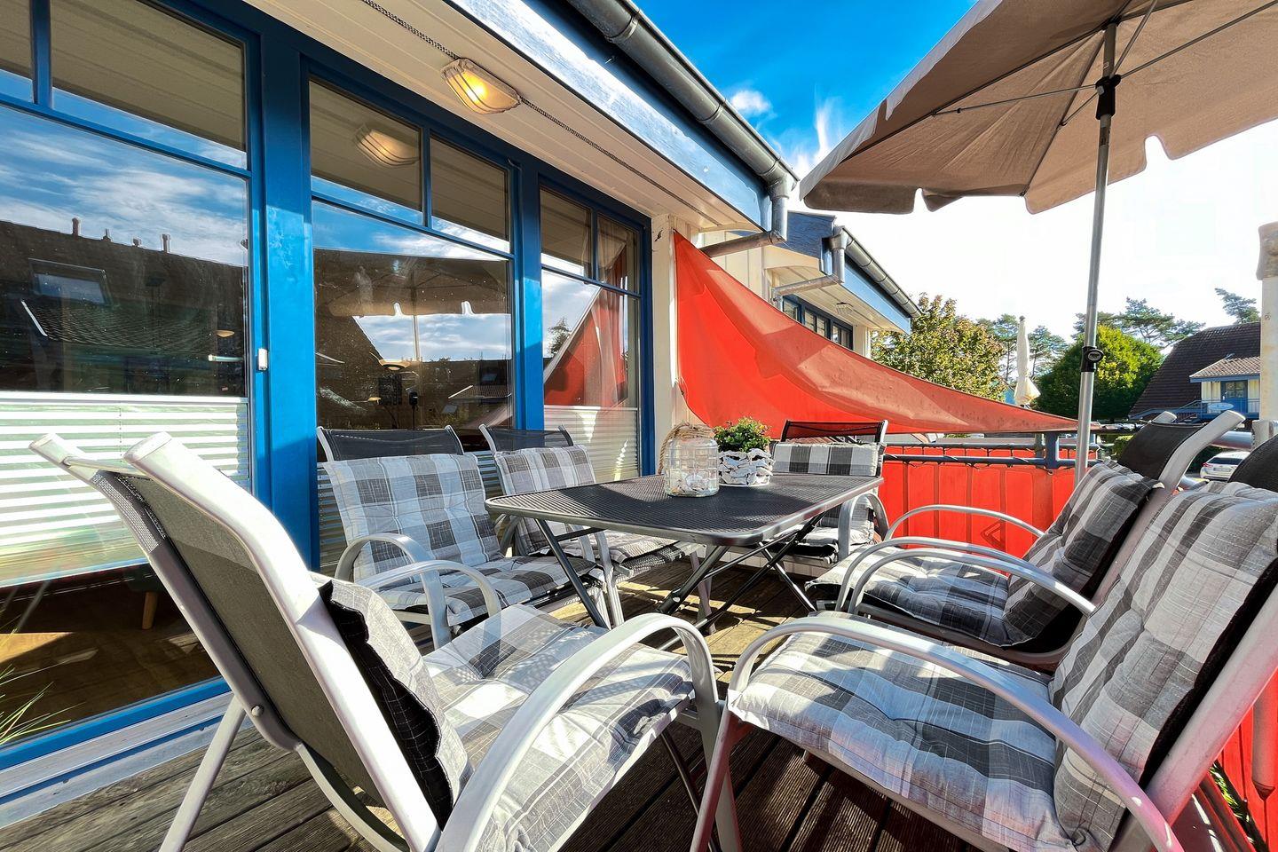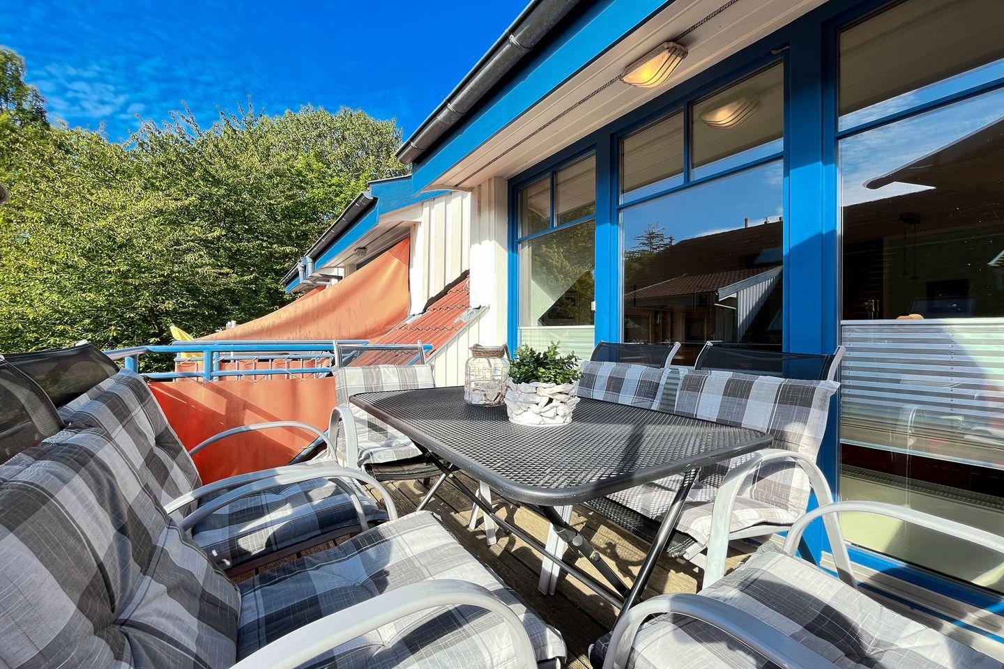 Auf den möblierten Balkon gelangst du vom Wohnzimmer aus. Ein Sofa und ein Essbereich sind im Wohnbereich platziert. Für den Zeitvertreib sorgen eine Stereoanlage und ein Flachbild-TV.