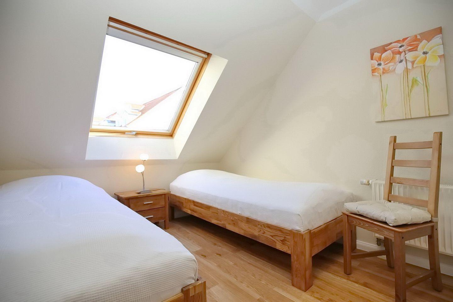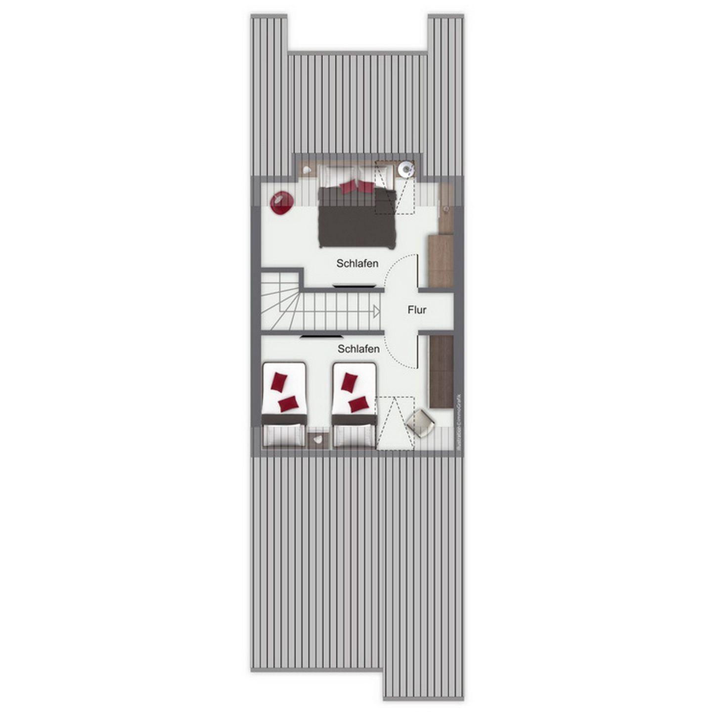Über eine innenliegende Treppe gelangst du ins 2. OG mit zwei Schlafzimmern. In beiden Schlafzimmern gibt es jeweils einen Flachbild-TV mit integriertem DVD-Player. In einem der Schlafzimmer bieten zwei Einzelbetten (100 x 200 cm) einen modernen Schlafplatz und im zweiten Schlafzimmer steht dir ein Doppelbett (160 x 200 cm) zur Verfügung. Die Fenster in allen Schlafzimmern lassen sich mit einem Rollo verdunkeln.