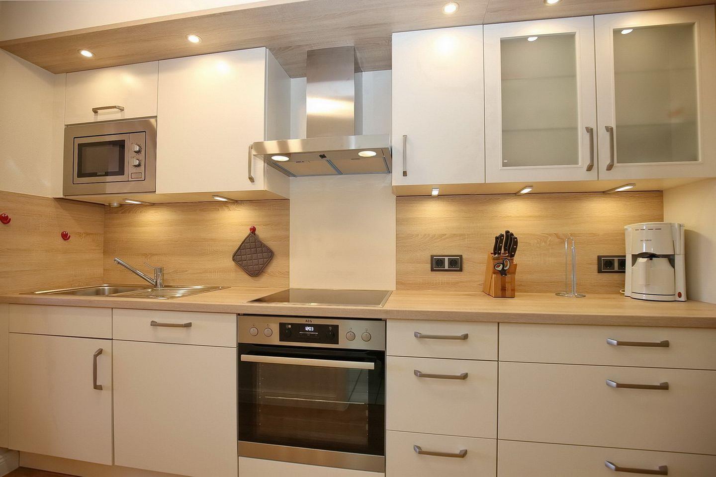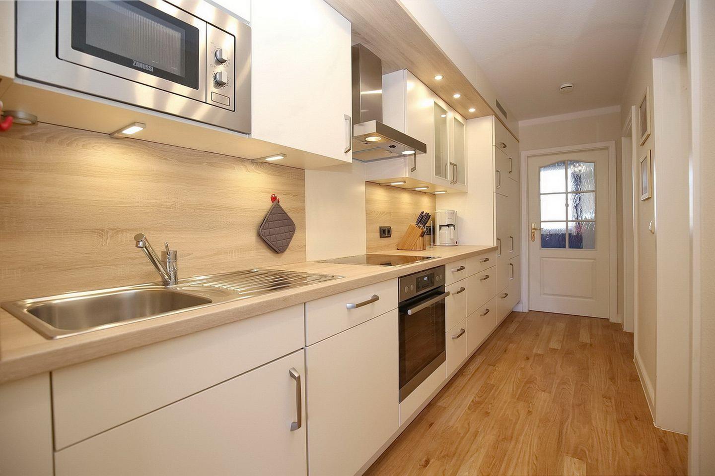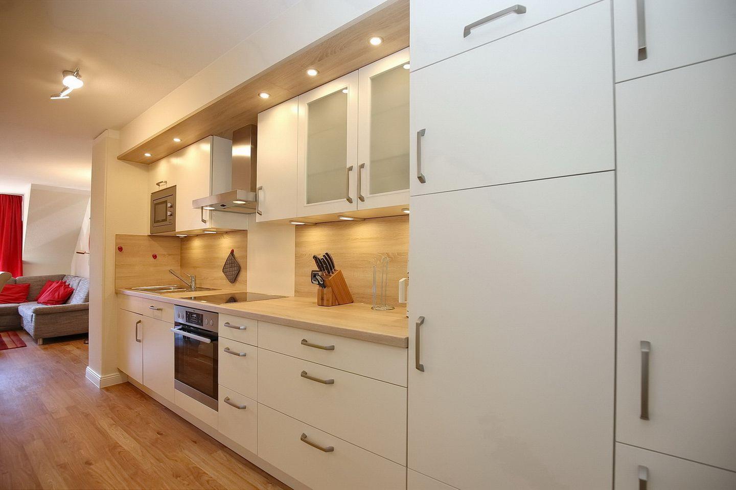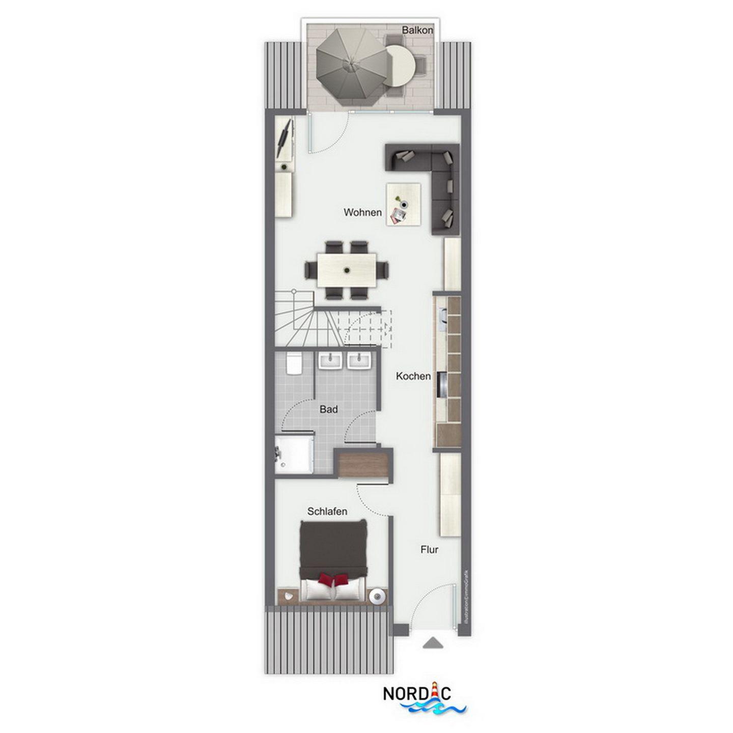 Vom Wohnbereich aus erreichst du den möblierten Balkon. Die bequeme Polsterecke im Wohnzimmer lädt zum Entspannen ein. Nutze zur Unterhaltung gerne den Flachbild-TV mit integriertem DVD-Player und die Stereoanlage. Auch der Essbereich für sechs Personen befindet sich hier. In der gut ausgestatteten Küchenzeile findest du neben dem Geschirr auch einen Geschirrspüler, ein Cerankochfeld, einen Backofen, eine Mikrowelle und einen Kühlschrank mit Gefrierfach vor.
