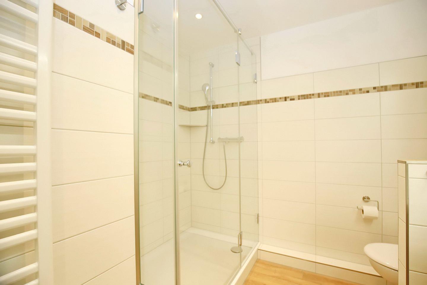 Im modernen, gefliesten Duschbad gibt es eine ebenerdige Dusche mit Klarglas, eine Toilette und zwei Waschbecken.