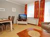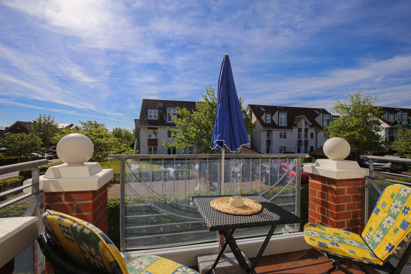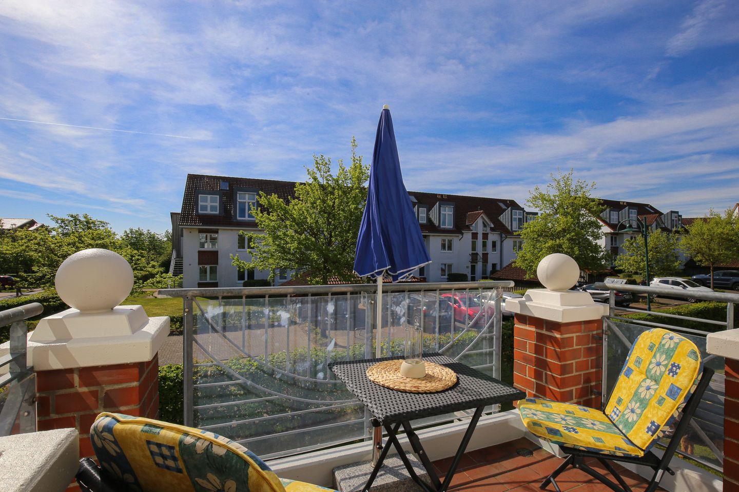 Der möblierte Balkon lädt dich zum Verweilen im Freien ein. Von hier aus hast du direkten Zugang zum offen gestalteten Wohnbereich mit Couchgarnitur und Esstisch. Zur Unterhaltung dienen ein Flachbild-TV und eine Stereoanlage. Für die kleinen Urlauber steht ein Kinderhochstuhl bereit. In allen Räumen wurde der Boden mit Laminat ausgelegt.