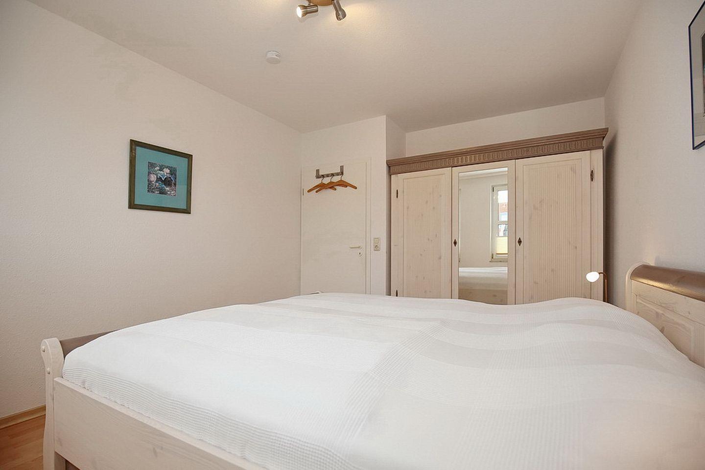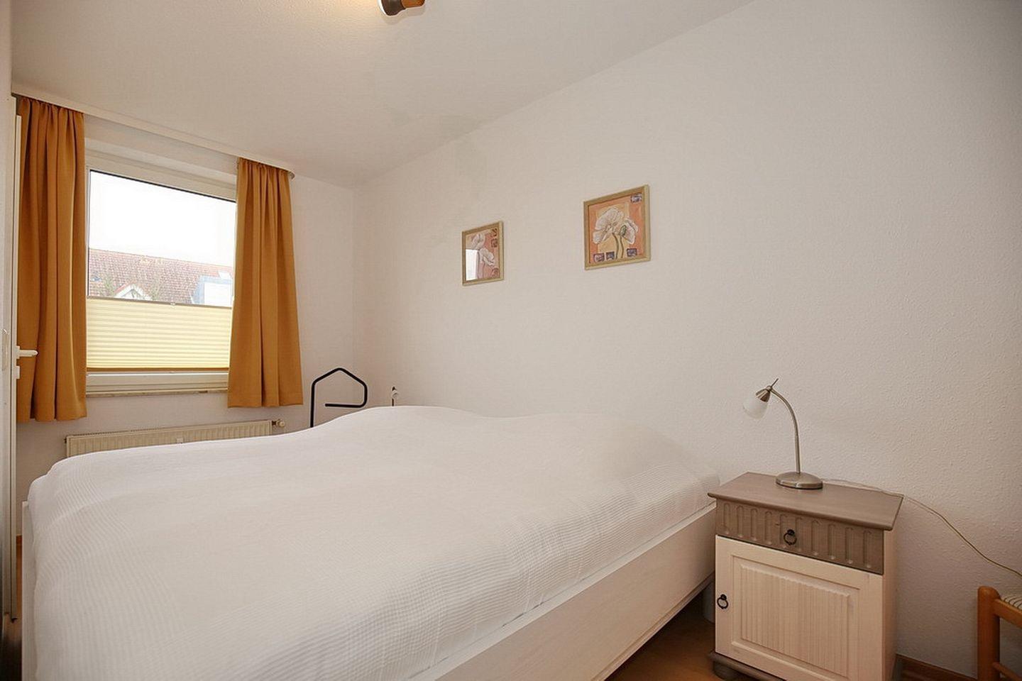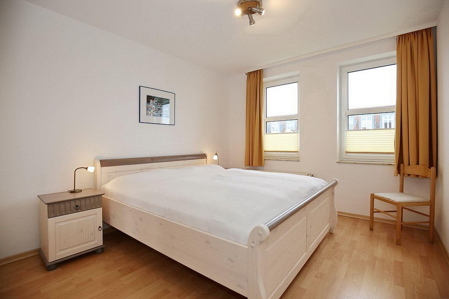 Die Schlafzimmer sind mit jeweils einem Doppelbett (2 x 90 x 200 cm) und einem Kleiderschrank gestaltet. Die Fenster können mit Vorhängen und Plissees abgedunkelt werden.