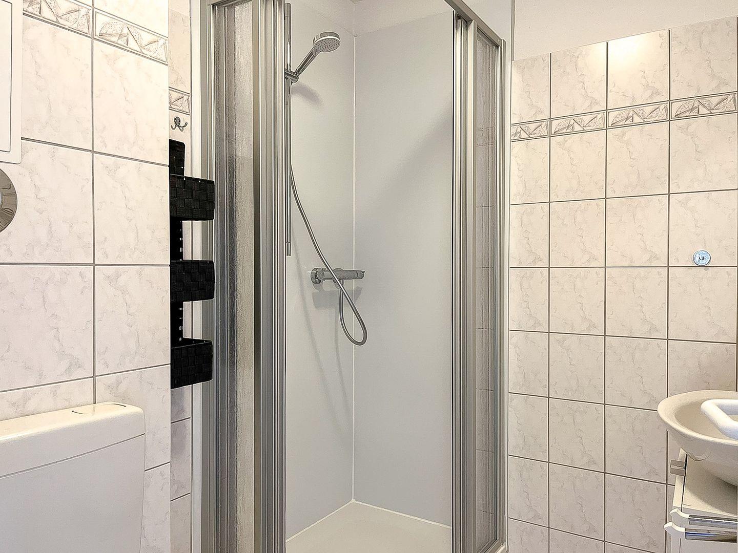 Das geflieste Duschbad bietet viele Abstellmöglichkeiten. In dieser Nichtraucherwohnung sind Haustiere nicht erlaubt.